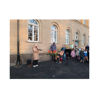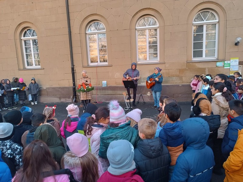 Immer montags versammmlen sich alle Klassen im Pausenhof, um gemeinsam die Kerzen am Adventskranz anzuzünden, Lieder zu singen und einer Adventsgeschichte zu lauschen, die traditionell von Rektorin Sabrina Neckov vorgetragen wird.