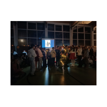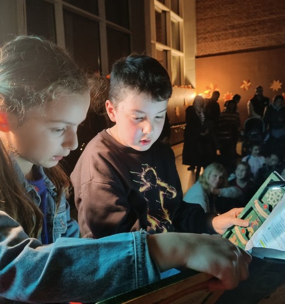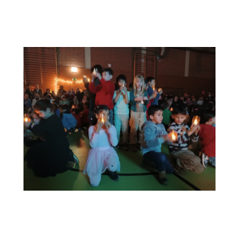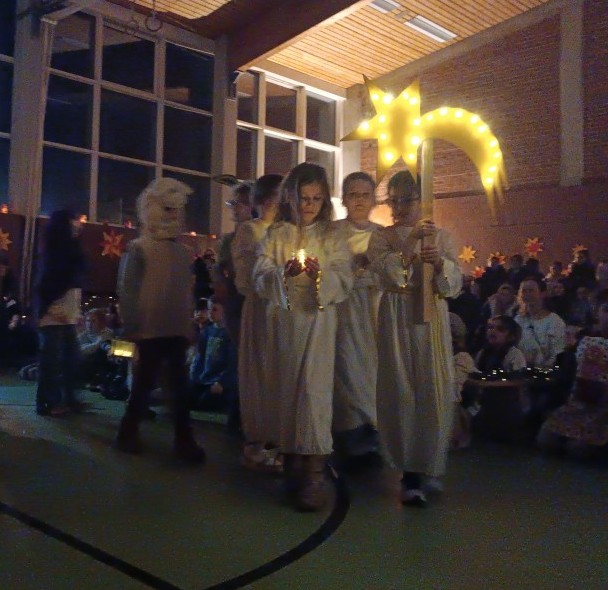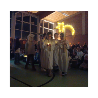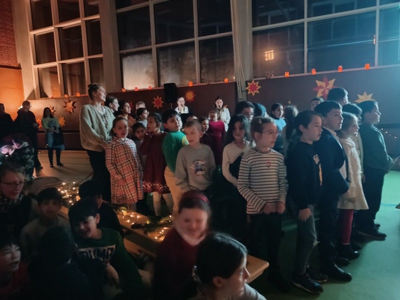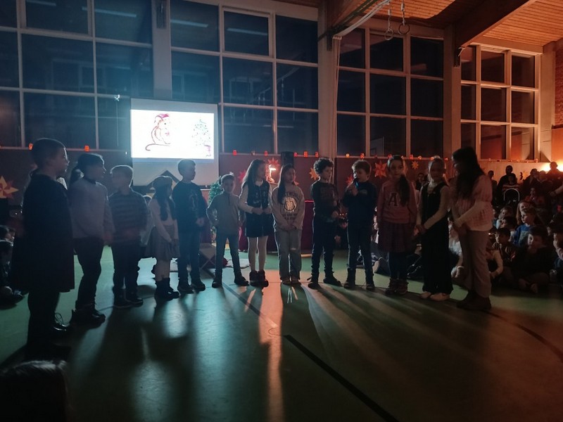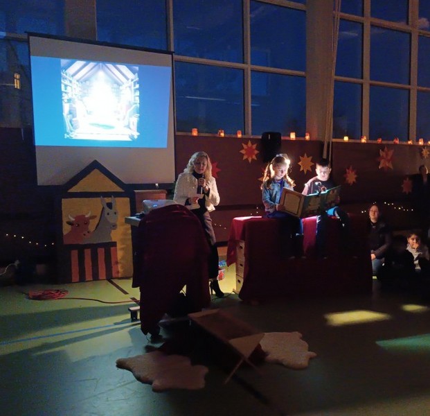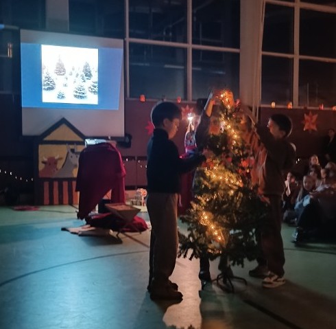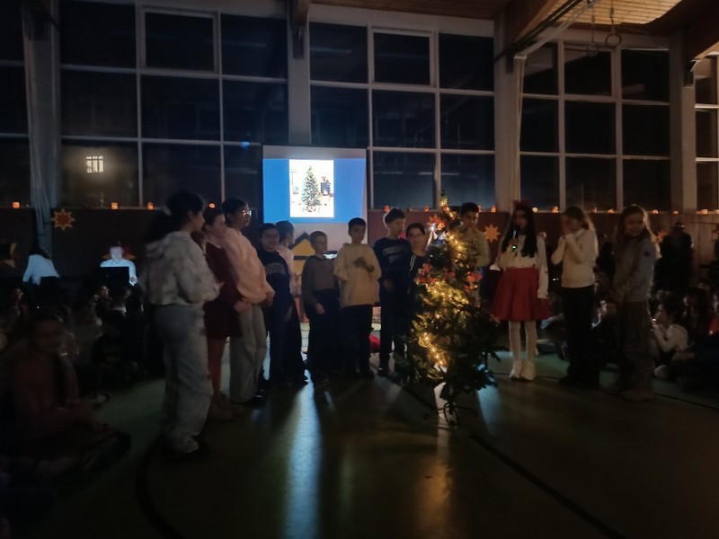 Zwei Kinder finden auf dem Dachboden der Schule ein dickes Buch mit vielen Weihnachtsbräuchen. So erfahren die Zuschauer ganz anschaulich jede Menge darüber, wie Weihnachten entstanden ist: moderne und alte Lieder wie die "Weihnachtsbäckerei" (2a/b) und "Gloria" (1c/3c), Gedichte wie "Die Weihnachtsmaus" (3a/b/c) und "Was unter dem Weihnachtsbaum liegt"(4a/b/c) sowie ein Lichtertanz (1b/2c), professionell musikalisch begleitet von unserer FRS-Band. Kinder der Klasse 1a schmückten einen Weihnachtsbaum und die Klasse 2a stellte die Weihnachtsgeschichte als Krippenspiel dar. Aber nicht die Plätzchen, nicht die Lichtertänze, nicht die Weihnachtsbäume sind das Wichtigste an Weihnachten: sondern die Frohe Botschaft von der Geburt Jesu. "Das besondere dieser Feier ist die Tatsache, dass hier verschiedene Nationen, Religionen und Kulturen gemeinsam Weihnachten feiern, so wie auch dieses Jahr wieder Iftar, das muslimische Fastenbrechen," fasste Rektorin Sabrina Neckov die besondere weihnachtliche Stimmung des Abends zusammen und dankte allen Mitwirkenden für die aufwendige und sehr gelungene Vorbereitungen.