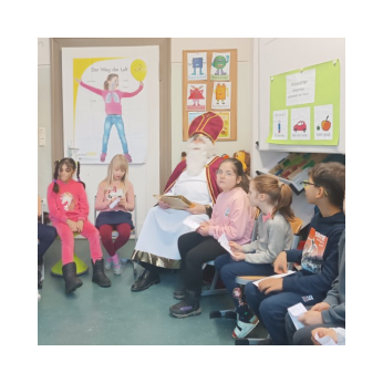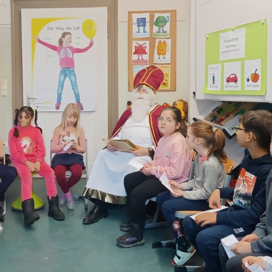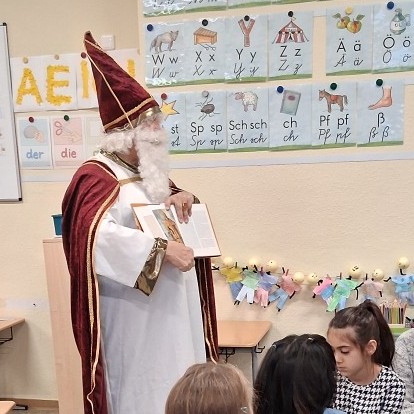 Am Montag kam der Nikolaus zu uns an die Friedrich-Rückert-Schule. Er erzählte den Kindern aus seinem Leben und über seinem Beruf als Bischof. Anschließend las er aus seinem dicken Buch vor, was den Kindern im vergangenen Jahr richtig gut gelungen ist und wo sie noch etwas verbessern können. Natürlich hatte er für jede Klasse auch einen großen Sack mit Mandarinen und Schokolade dabei!