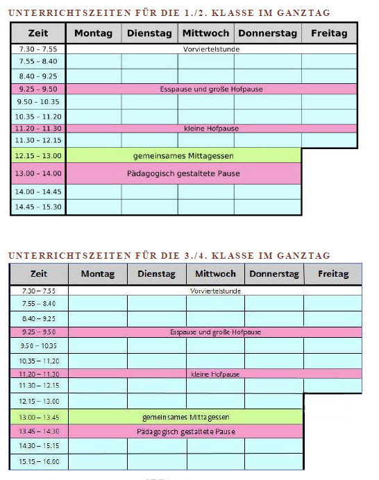 Für die Ganztagsklassen gelten folgende Unterrichtszeiten. Bitte beachten Sie, dass der Unterricht am Freitag bereits um 12:15 Uhr endet - ohne Mittagessen!