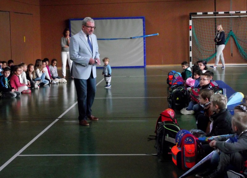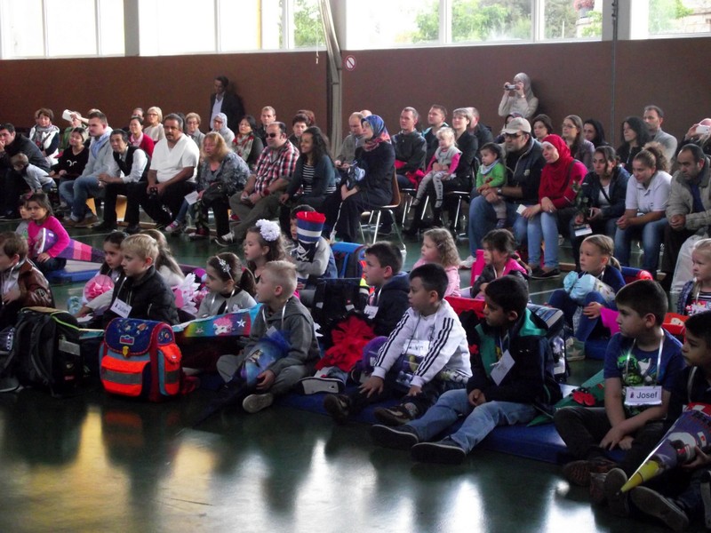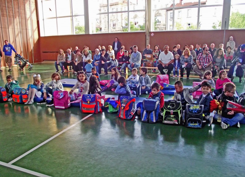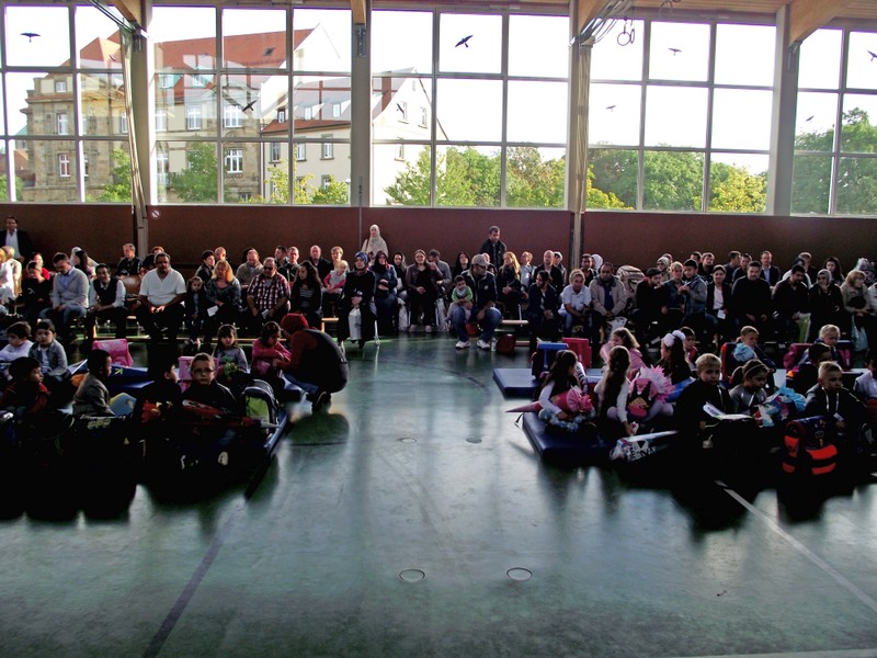 Gegen 9:00 Uhr versammelten sich viele aufgeregte Schulanfänger mit ihren Familien in der Turnhalle der Friedrich-Rückert-Schule. Ausgestattet mit den neuen Schultaschen und schwer beladen mit großen Schultüten erwarteten sie ihren ersten Schultag. Willkommen geheißen wurden sie dann von den Kindern der 3a mit dem Klassiker "Alle Kinder lernen lesen". Schulleiter Herr Redolfi begrüßte die ABC-Schützen und ihre Eltern ganz herzlich und wünschte ihnen einen schönen ersten Schultag. Die Kinder der 3a zeigten mit ihrem Gedicht vom Kindergarten zur Schule, was die "Neuen" so alles in der Schule erwartet. Anschließend gingen die beiden ersten Klassen mit ihren Lehrerinnen in ihre Klassenzimmer zu ihrer ersten Unterrichtsstunde, während Herr Redolfi die Eltern mit weiteren wichtigen Informationen versorgte. Der Elternbeirat sorgte für Kaffee und Kuchen, so dass auch für die Eltern die Zeit wie im Flug verging. Bereits gegen 11:00 Uhr konnten die Eltern ihre frischgebackenen Erstklässler wieder in ihren Klassenzimmern abholen und einige Erinnerungsfotos schießen.