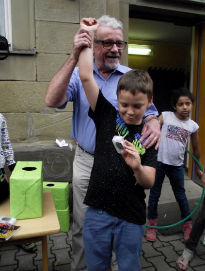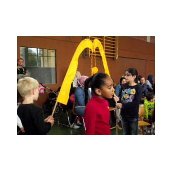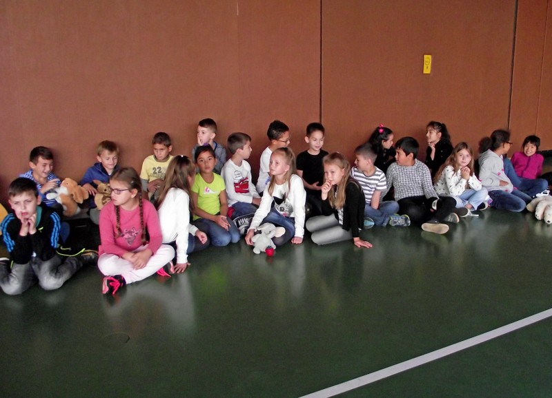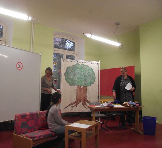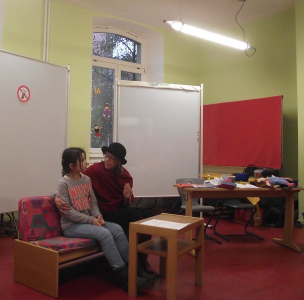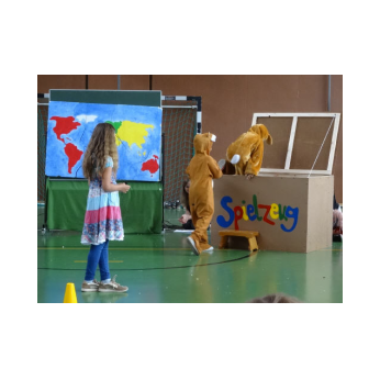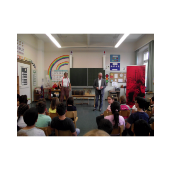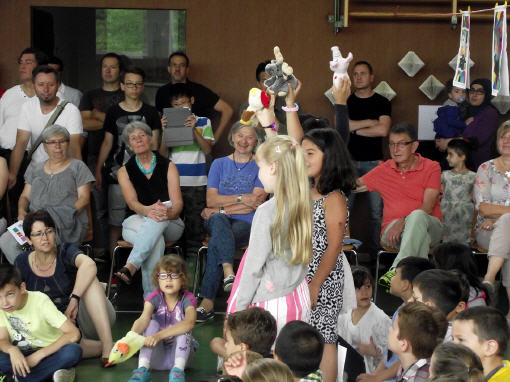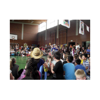 "Merhaba!", "Nieh Hao!", "Priwjét! " oder "Salam aleikum!", so begrüßen sich die Kinder der Friedrich-Rückert-Schule im Morgenkreis. Seit Juni ist noch eine Begrüßung dazugekommen: "Grützli mützli!" Das waren die Worte, mit denen die Handpuppe Molto aus Magnolia die Kinder in einem Theaterstück zum Thema "Flüchtlinge und Integration" begrüßte. Obwohl Molto kein Wort Deutsch sprach, war - mit etwas Unterstützung von Clown Bonzo (alias Theaterpädagoge Dirk Bayer) - das Eis schnell gebrochen. Problemlos legten die Erst- und Zweitklässer ihre Scheu ab und luden mit Händen und Füßen den kleinen Molto ein, mit ihnen Verstecken oder Fangen zu spielen. Dann betrat Max (ebenfalls von Dirk Bayer gespielt) die Bühne. Max hielt sich von Molto fern und wiederholte immer wieder die Vorurteile gegenüber Fremden, wie er es von seiner Tante gehört hatte. Die Schüler setzten alles daran, Max davon zu überzeugen, dass nicht "jeder Fremde gleich ein Terrorist sein muss". Und Max ließ sich nicht so leicht vom Gegenteil überzeugen! Schließlich überwand ein couragierter Schüler alle Vorurteile, indem er dem verblüfften Max einfach Bonzo in den Arm drückte!