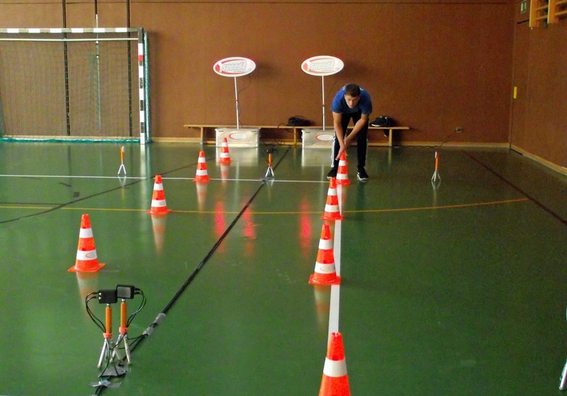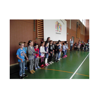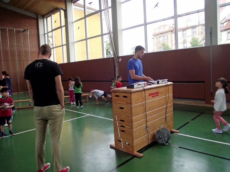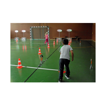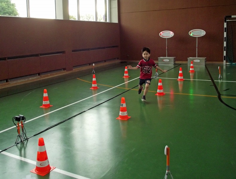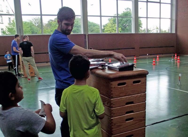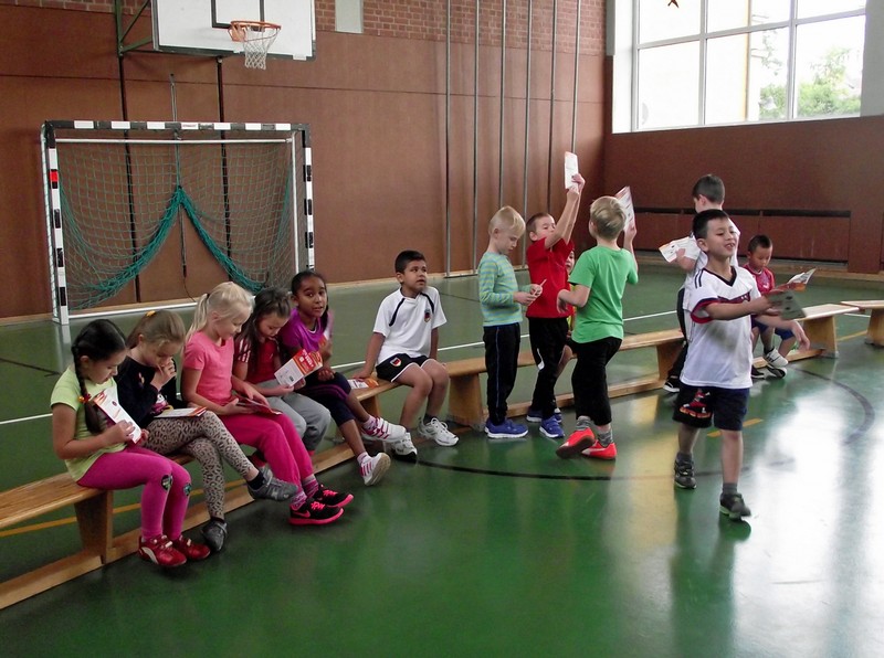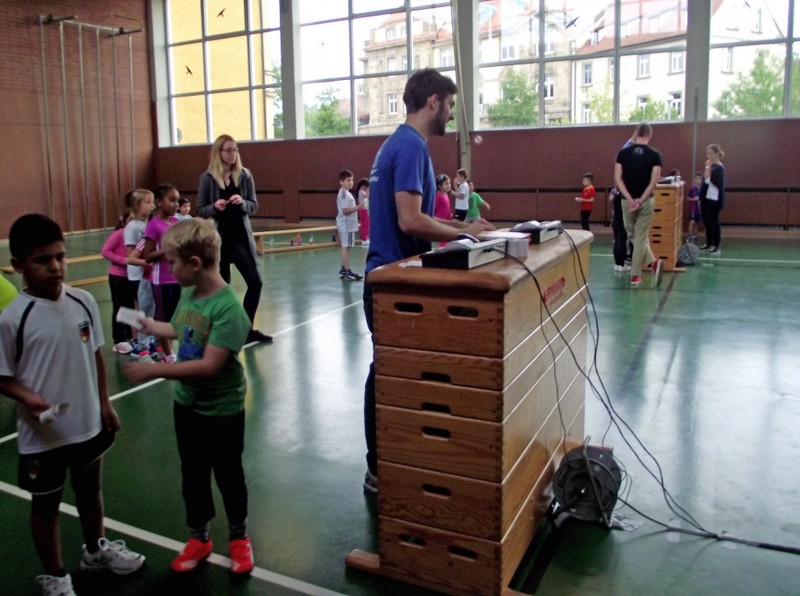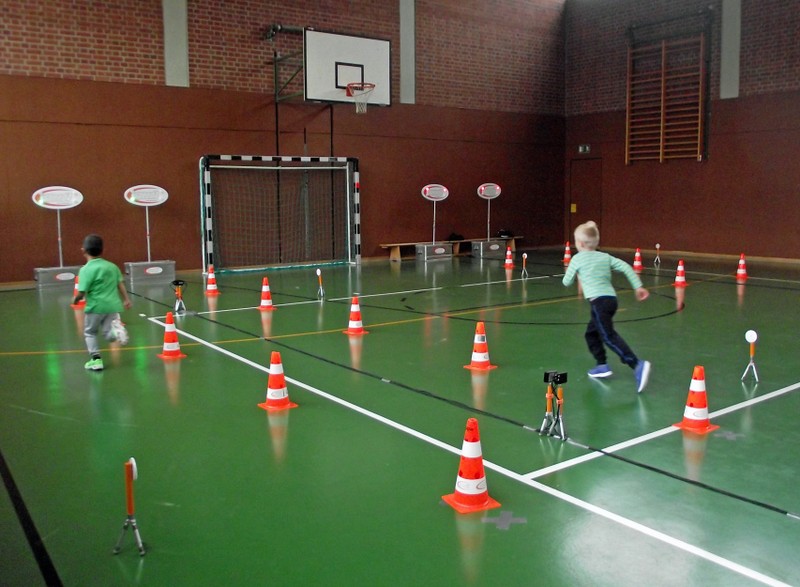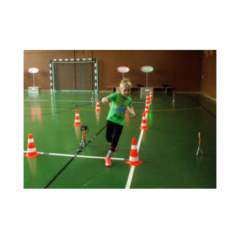 So wurde in unserer Turnhalle parallel vier Laufstrecken mit digitaler Zeitmessung aufgebaut. Leuchtete die Ampel "GRÜN", durfte jedes Kind die Pylonenstrecke hinwärts gerade und zurück im Slalom durchlaufen. Am Ende erhielt jeder einen "Kassenzettel" mit seiner Laufzeit. Nach mehreren Durchgängen wurden Zeiten verglichen, am Ende hatten sich alle Kinder zum Finale am Sonntag qualifiziert und Anregungen für weitere Aktivitäten in den örtlichen Sportvereinen erhalten.