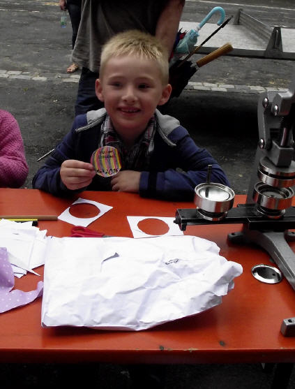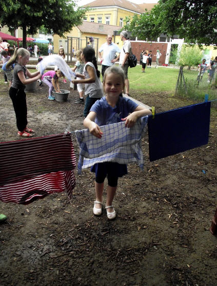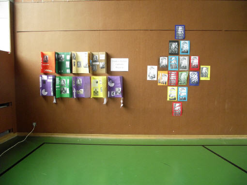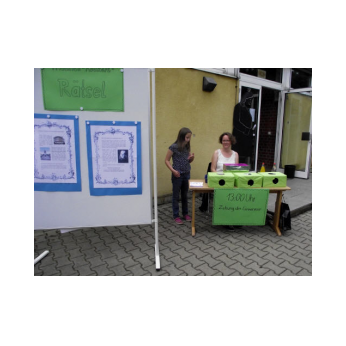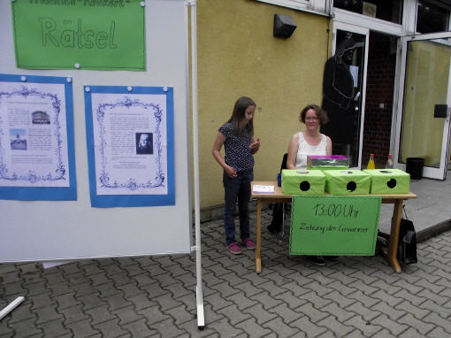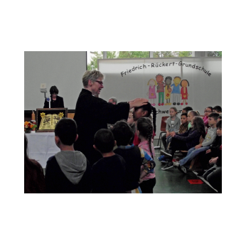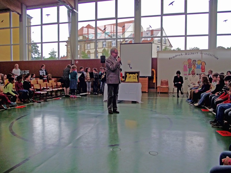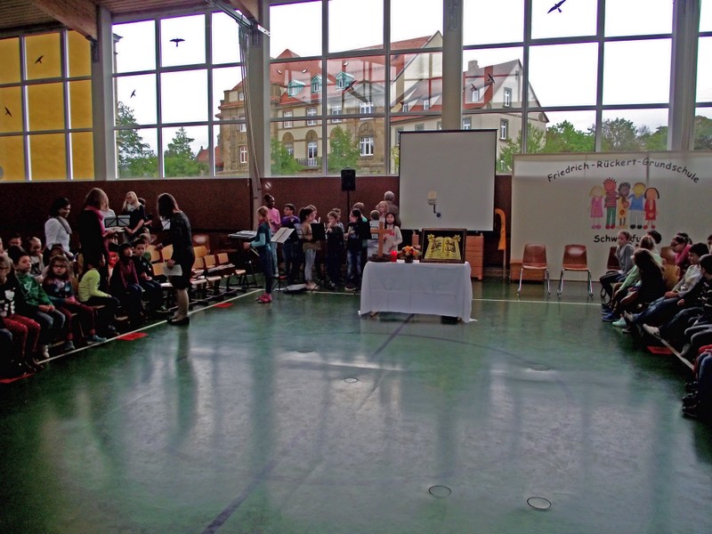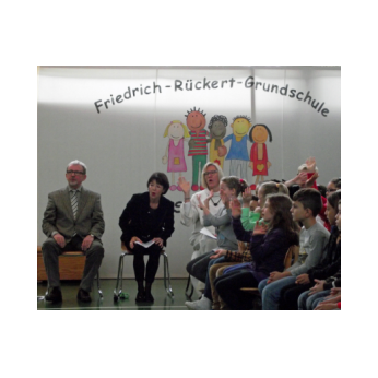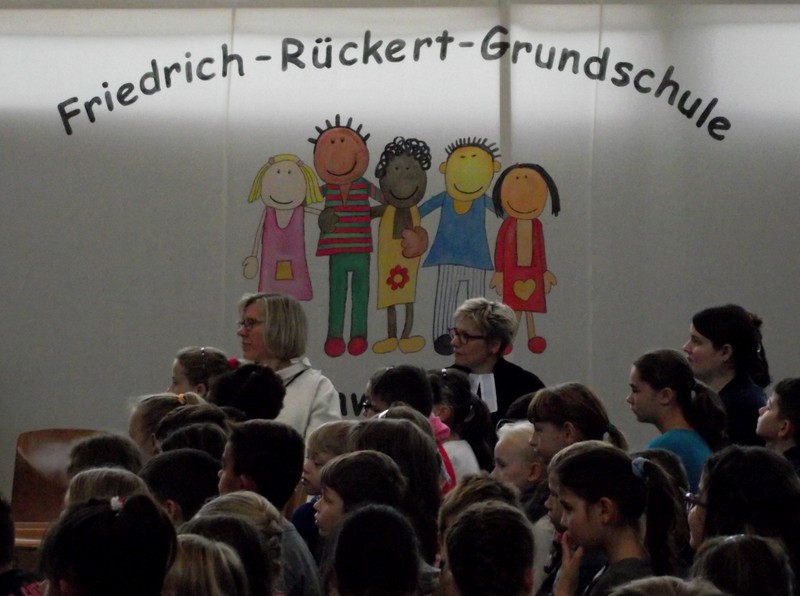 Zum 150. Todestages unseres Namenspatrons beschäftigten sich alle Klassen unserer Schule in einer Projektwoche mit Friedrich Rückert. Da wurden viele Kunstwerke rund um sein Portrait gestaltet, ausrangierte Bücher in Kunstobjekte verwandelt, Lapbooks erschaffen, fleißig über sein Leben und seine Werke gelesen, über die Größe Friedrich-Rückerts von über zwei Metern gestaunt, Theaterstücke eingeübt und noch vieles mehr. Die Projektwoche gipfelte schließlich in unserem Sommerfest, das natürlich ganz im Zeichen Friedrich-Rückerts stand. Die Turnhalle verwandelte sich in eine kleine "Kunsthalle. Rasende Reporter (gespielt von Kindern der Klasse 4b) berichteten in ihrer Radio-Show live aus Schweinfurt. So erfuhr man ganz nebenbei eine Menge über Friedrich Rückert. Rückert-Rap, das Rückert-Märchen "Vom Bäumlein, das andere Blätter hat gewollt" und das Schweinfurt-Lied "Ich bin so gern daheim im Schweinfurt" rundeten das Programm ab. Danach konnten sich Groß und Klein draußen im Schulhof an den Ständen des Elternbeirats mit Essen und Trinken stärken und die zahlreichen Spielangebote des Spielbusses Max nutzen wie "Vier gewinnt" spielen und Tatoos malen oder Buttons pressen und ein Riesen-Rückert-Mosaik-Bild in Gemeinschaftsarbeit gestalten. Beim Wäschewaschen wie zu Rückerts Zeiten erlebten die Kinder wie anstrengend es war, frührer einen Haushalt zu führen. Sein Wissen über Friedrich-Rückert konnten alle Besucher bei einem Rätsel über den großen Dichter und Orientalisten unter Beweis stellen.