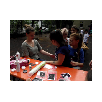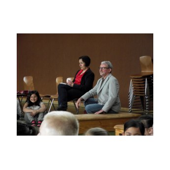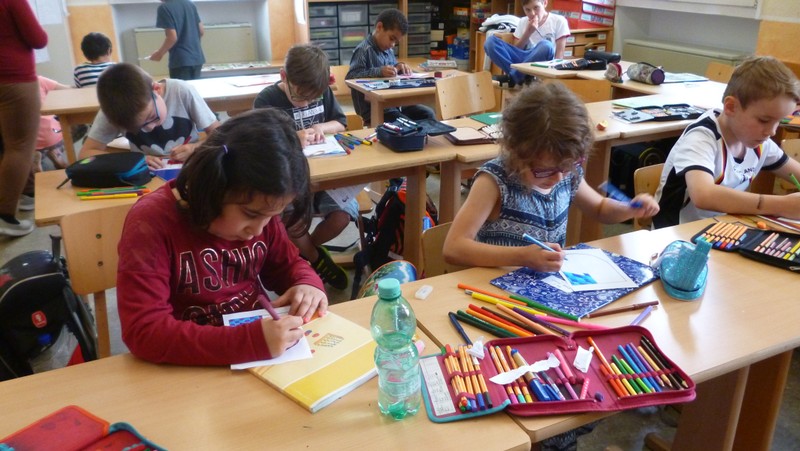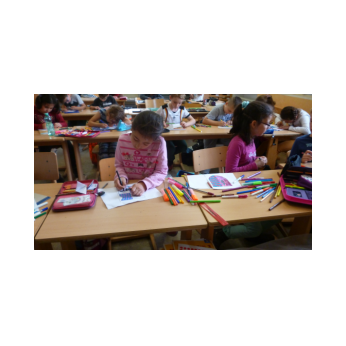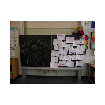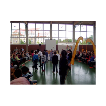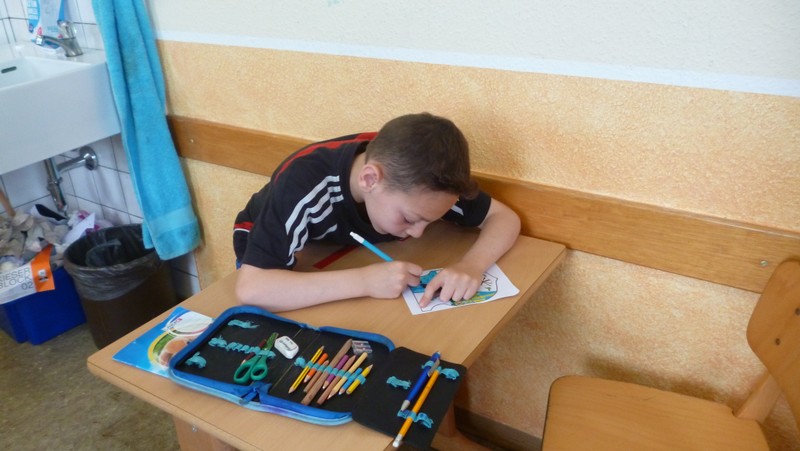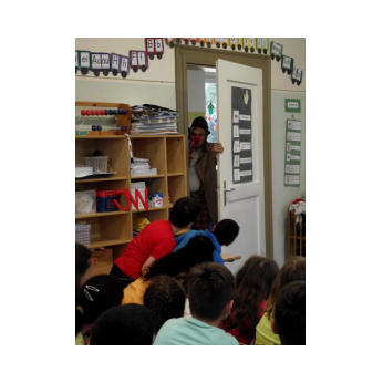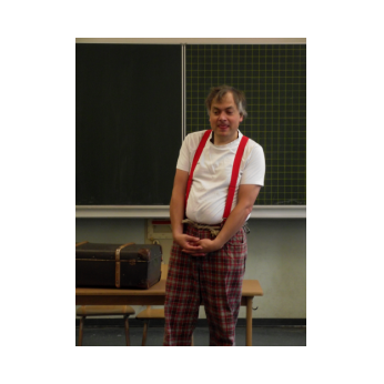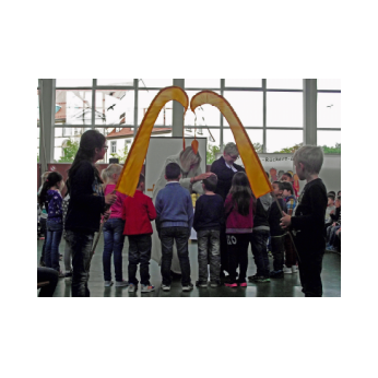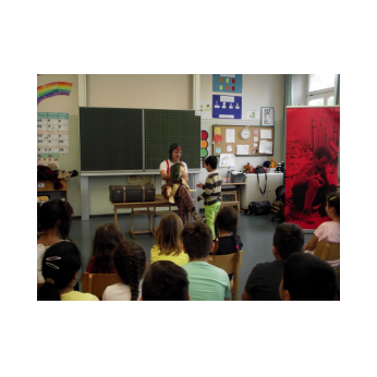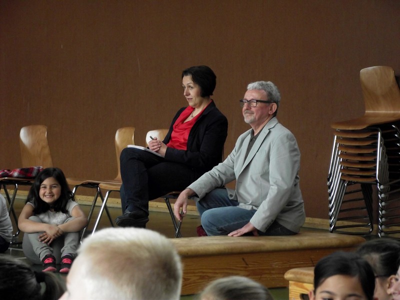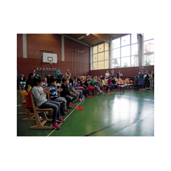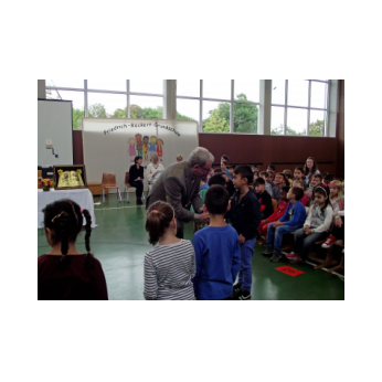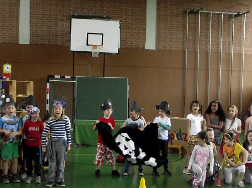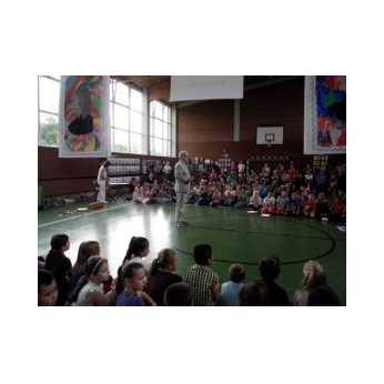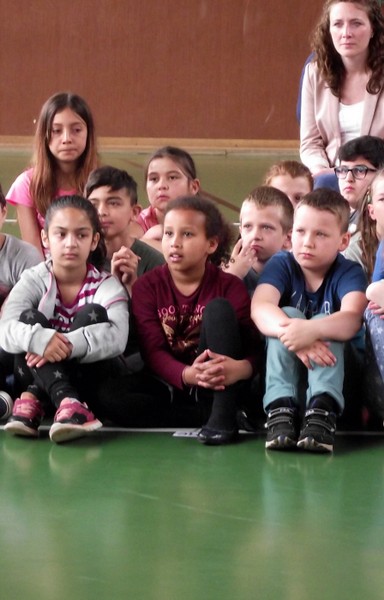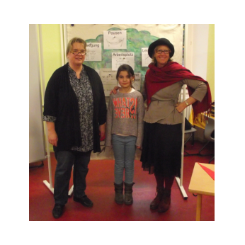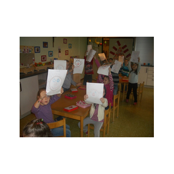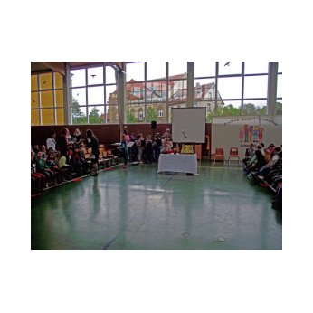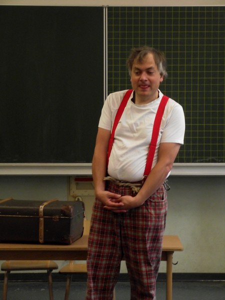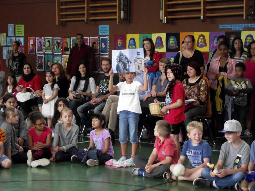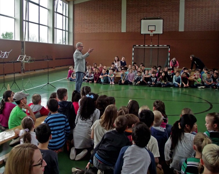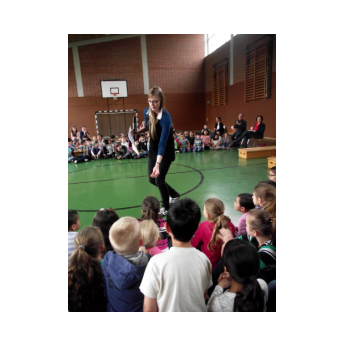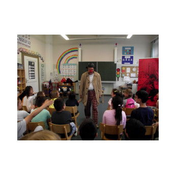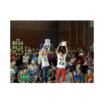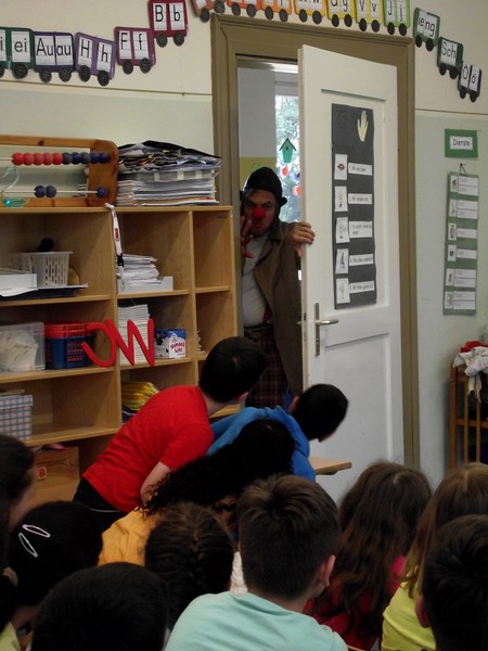 Theaterpädagoge Dirk Bayer verstand es in seinem Ein-Mann-Stück hervorragend, die richtige Mischung aus clownesken Elementen und wirklich ernsten Themen wie "Flucht" oder "Vorurteile gegenüber allem, was fremd ist" zu finden. Zum Abschied bewies er mit seinem Comic-Portrait, dass er nicht nur ein begabter Schauspieler ist, sondern auch noch toll zeichnen kann. Die "Hausaufgaben" von Clown Bonzo erledigten die Kinder gern und mit viel Liebe: Ein Bild malen, auf dem man sieht, was man mit einem Kind wie Molto alles machen kann, auch wenn es noch kein Deutsch spricht! Anschließend besuchte Clown Bonzo natürlich auch noch die 3. und 4. Klassen, die ein etwas anderes, auf ihre Altersstufe zugeschnittenes Stück mitgestalten durften.