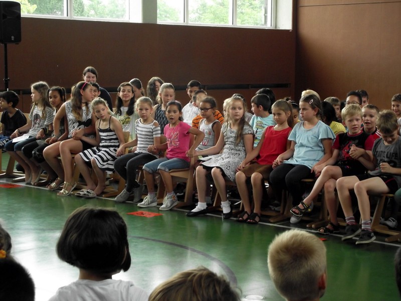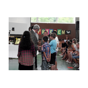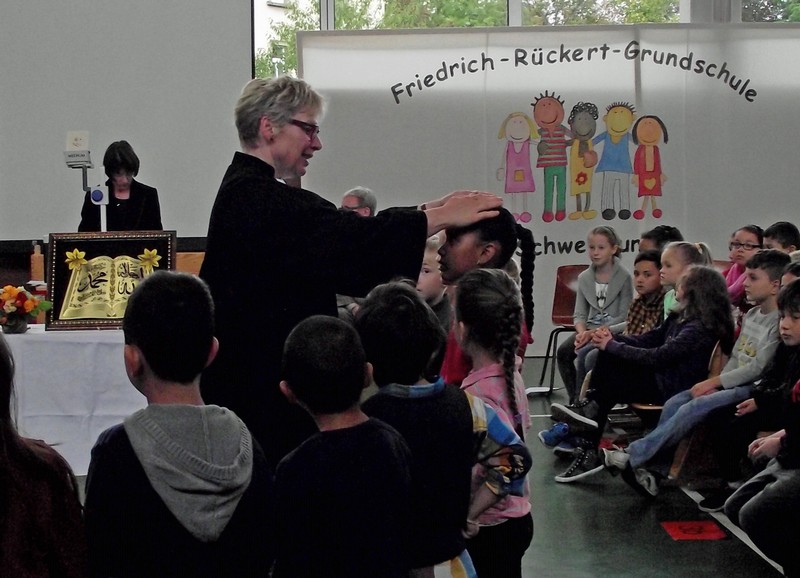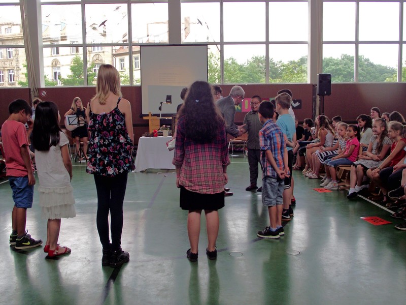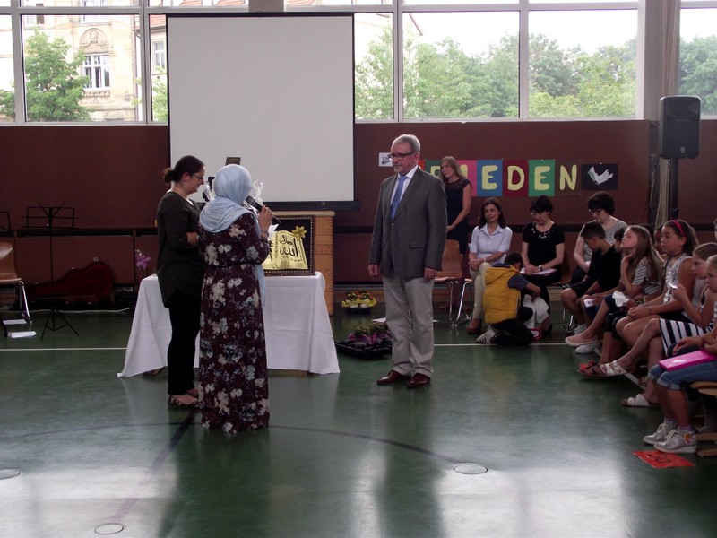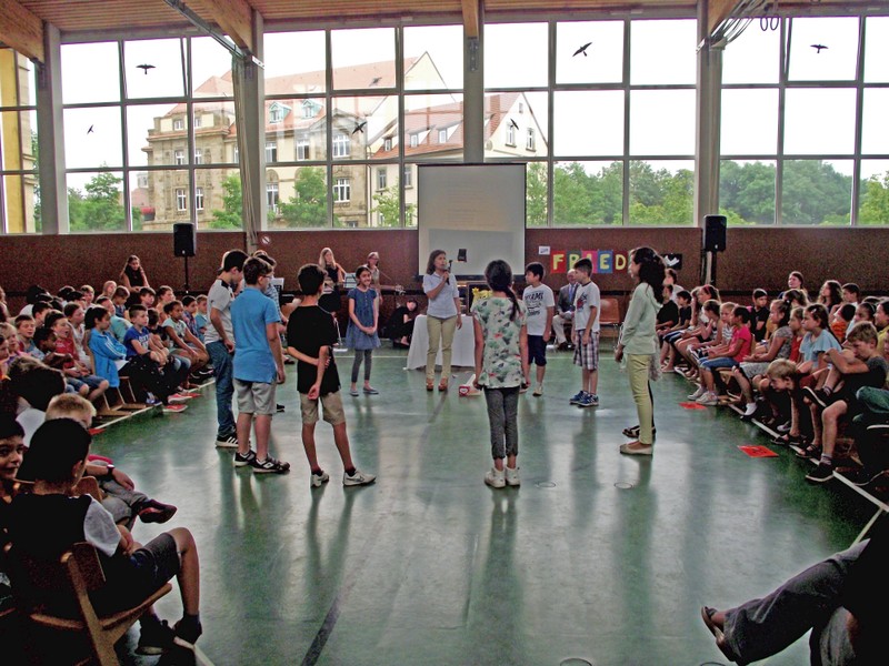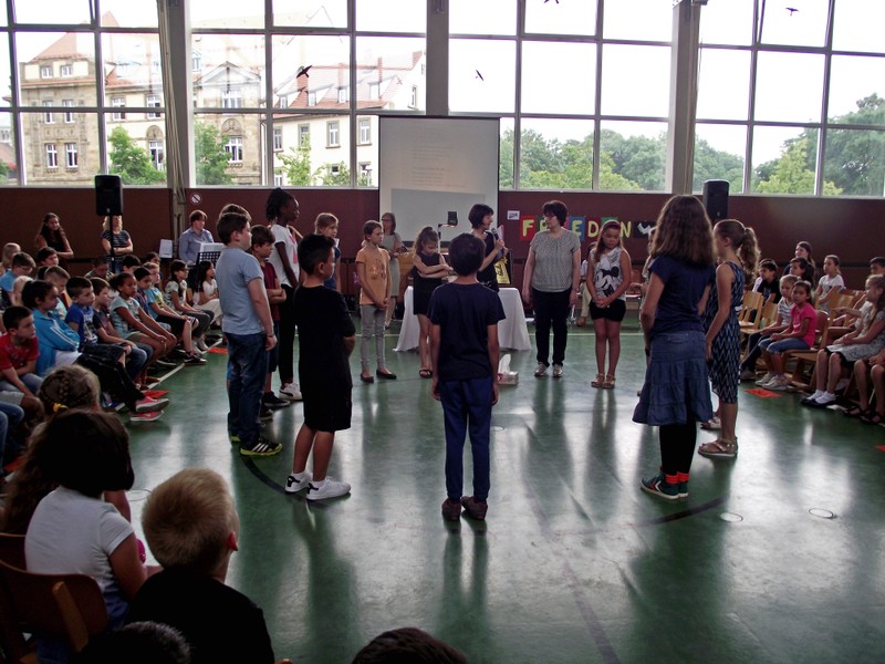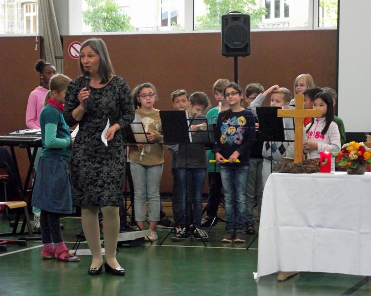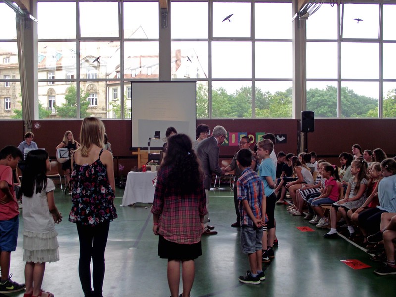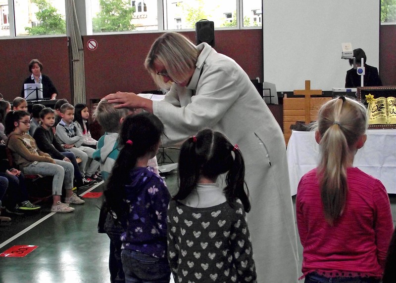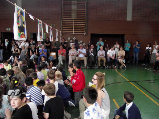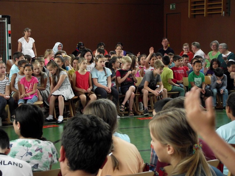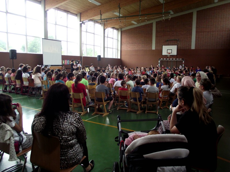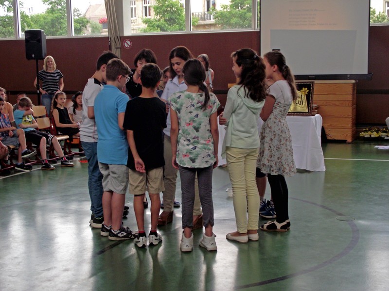 Inzwischen ist es zur langjährigen Tradition geworden, dass am Schuljahresende Kinder, Eltern, Lehrkräfte, Freunde und Förderer unserer Schule zusammenkommen, um gemeinsam auf das vergangene Schuljahr zurückzublicken. Diesmal hatte sich das Vorbereitungsteam für das aktuelle Thema "Frieden" entschieden. Mit kurzen Texten aus der Bibel und dem Koran wurde anschaulich klar, wie viele Gemeinsamkeiten die beiden großen Religionen verbinden. In einer bewegenden multireligiösen Feier wurden die Schüler und Schülerinnen der 4. Klassen und alle Kinder, die ebenfalls unsere Schule verlassen, verabschiedet. Von ihren Religions- und Ethiklehrkräften erhielten sie ein Wort des Segens und des Zuspruchs mit auf ihren weiteren Lebensweg. Herr Redolfi nutzte schließlich die Gelegenheit, sich von den Lehrkräften, die unsere Schule verlassen, zu verabschieden und sich bei all den vielen Menschen zu bedanken, die das Jahr über in den verschiedensten Bereichen mitgearbeitet und unsere Schule unterstützt haben. So dankte der Schulleiter unter vielen anderen den Lesementoren, die regelmäßig mit einzelnen Kindern das Lesen üben. Ein großes Dankeschön ging ebenfalls an den sehr aktiven Elternbeirat unter dem Vorsitz von Frau Dr. Böckler. Als am Ende auf besonderen Wunsch der Kinder und Lehrkräfte das Lied "Wir sind alle Kinder dieser Welt" aus dem kürzlich aufgeführten Musical "Felicitas Kunterbunt" angestimmt wurde, blieb auch das letzte Auge nicht mehr trocken. Musikalisch umrahmt wurde die multikulturelle Abschlussfeier von den Flötenkindern der Ganztagsklasse 4b und unserem bewährten "Lehrerorchester".