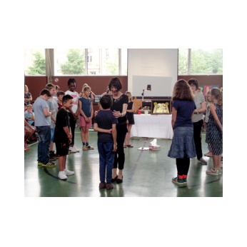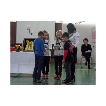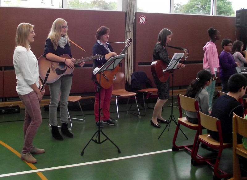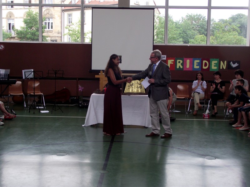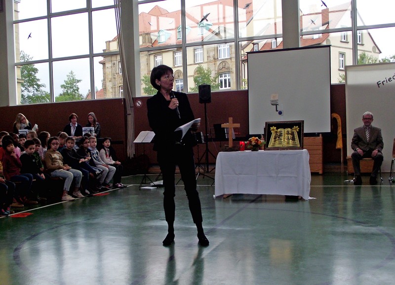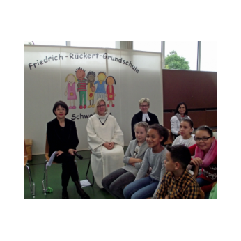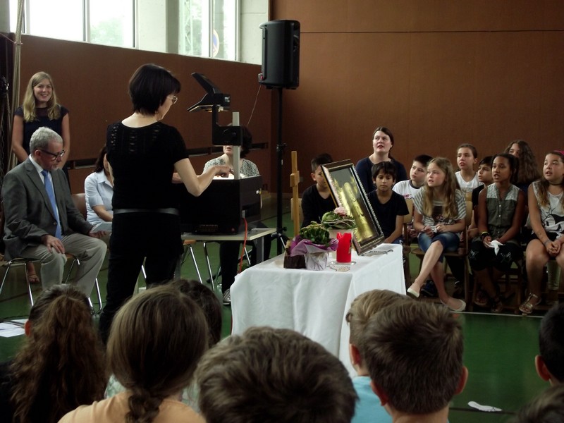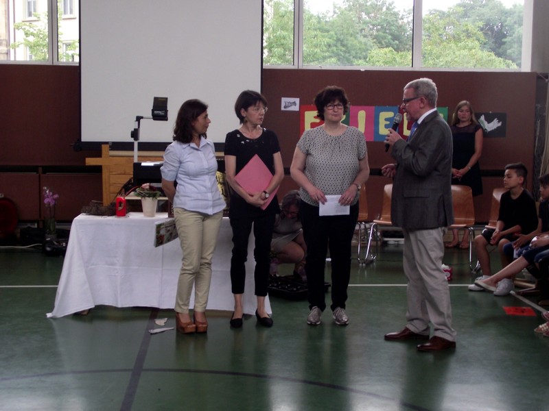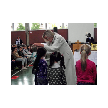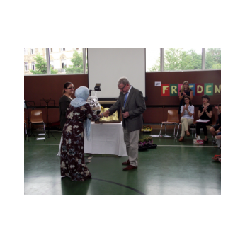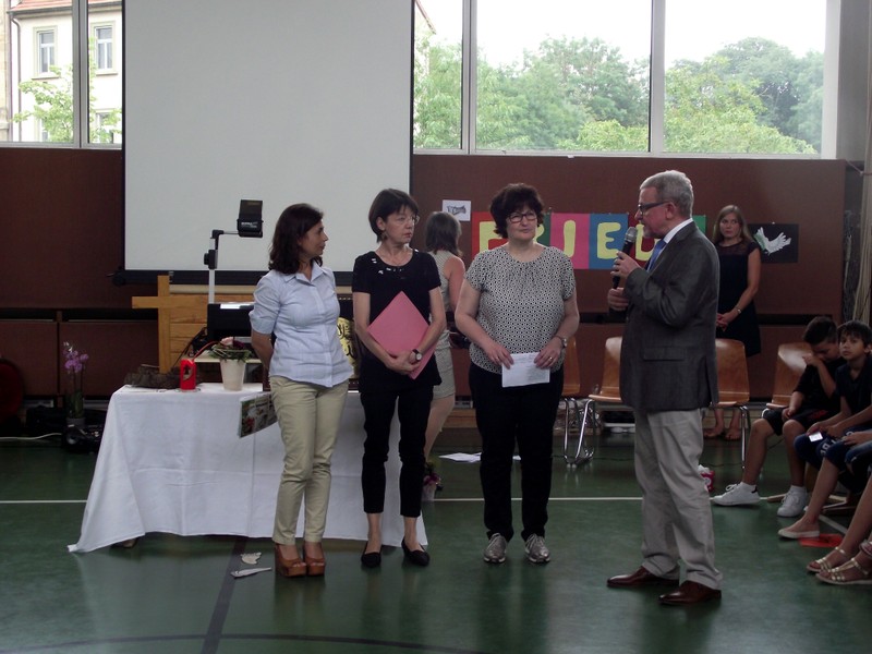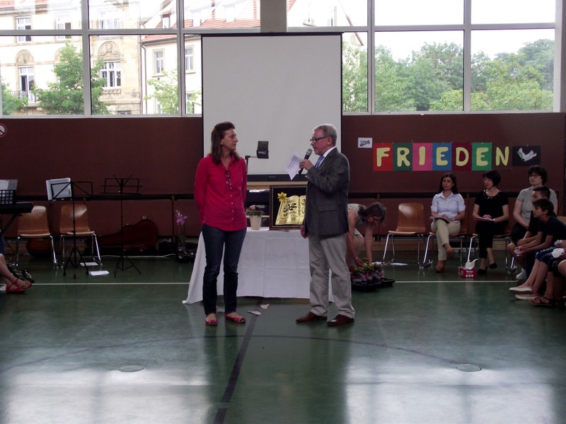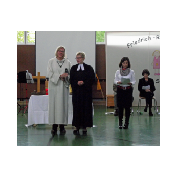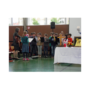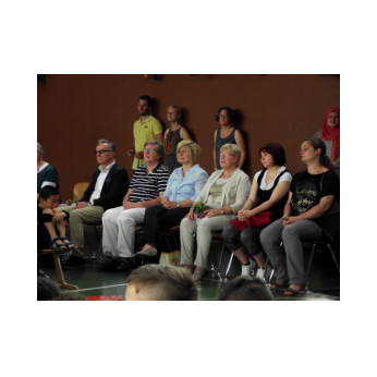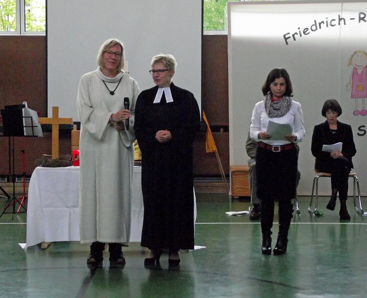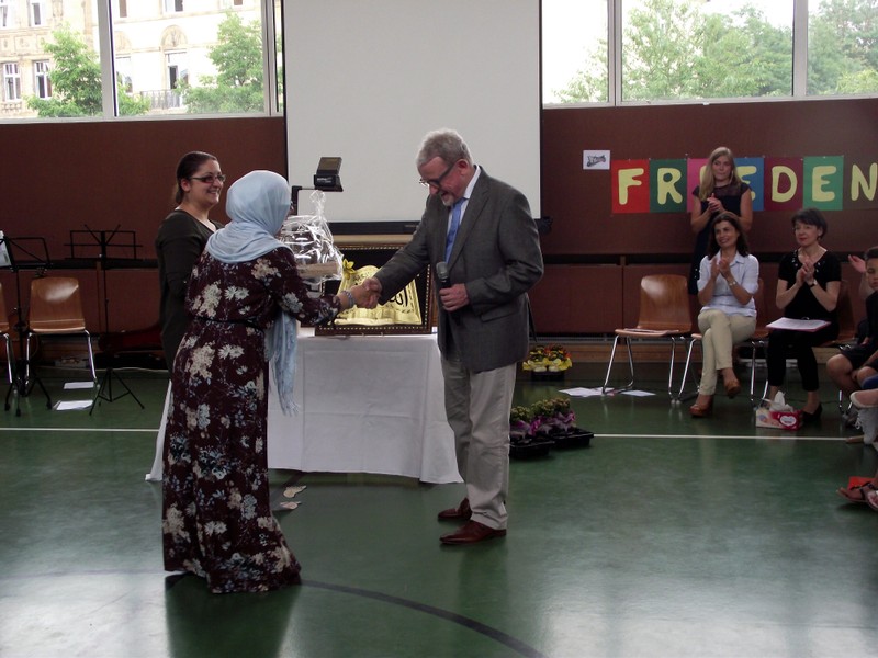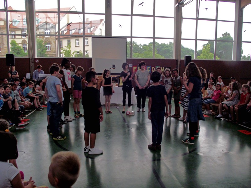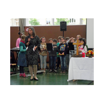 Inzwischen ist es zur langjährigen Tradition geworden, dass am Schuljahresende Kinder, Eltern, Lehrkräfte, Freunde und Förderer unserer Schule zusammenkommen, um gemeinsam auf das vergangene Schuljahr zurückzublicken. Diesmal hatte sich das Vorbereitungsteam für das aktuelle Thema "Frieden" entschieden. Mit kurzen Texten aus der Bibel und dem Koran wurde anschaulich klar, wie viele Gemeinsamkeiten die beiden großen Religionen verbinden. In einer bewegenden multireligiösen Feier wurden die Schüler und Schülerinnen der 4. Klassen und alle Kinder, die ebenfalls unsere Schule verlassen, verabschiedet. Von ihren Religions- und Ethiklehrkräften erhielten sie ein Wort des Segens und des Zuspruchs mit auf ihren weiteren Lebensweg. Herr Redolfi nutzte schließlich die Gelegenheit, sich von den Lehrkräften, die unsere Schule verlassen, zu verabschieden und sich bei all den vielen Menschen zu bedanken, die das Jahr über in den verschiedensten Bereichen mitgearbeitet und unsere Schule unterstützt haben. So dankte der Schulleiter unter vielen anderen den Lesementoren, die regelmäßig mit einzelnen Kindern das Lesen üben. Ein großes Dankeschön ging ebenfalls an den sehr aktiven Elternbeirat unter dem Vorsitz von Frau Dr. Böckler. Als am Ende auf besonderen Wunsch der Kinder und Lehrkräfte das Lied "Wir sind alle Kinder dieser Welt" aus dem kürzlich aufgeführten Musical "Felicitas Kunterbunt" angestimmt wurde, blieb auch das letzte Auge nicht mehr trocken. Musikalisch umrahmt wurde die multikulturelle Abschlussfeier von den Flötenkindern der Ganztagsklasse 4b und unserem bewährten "Lehrerorchester".
