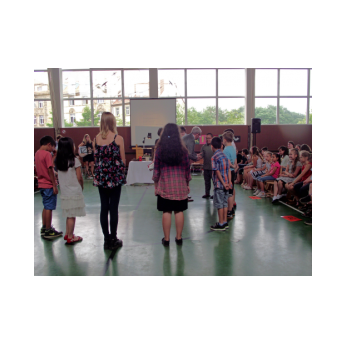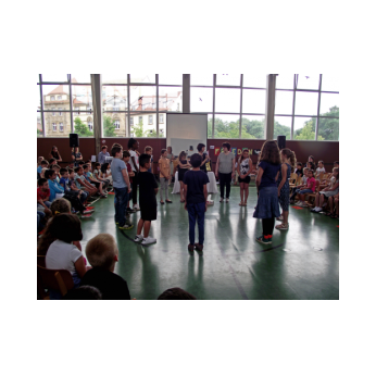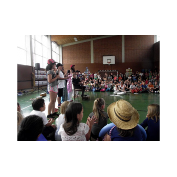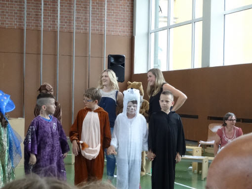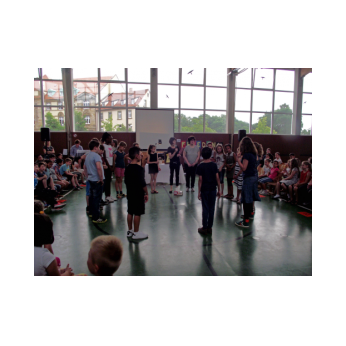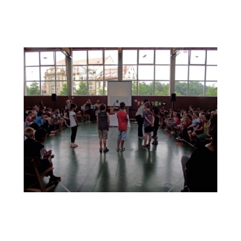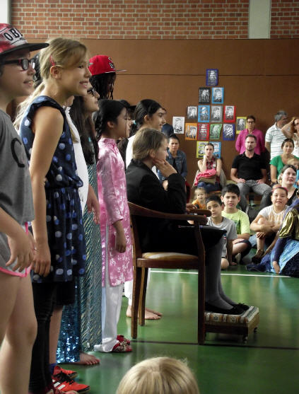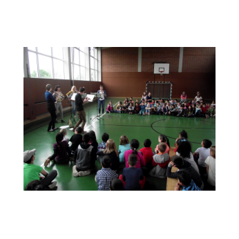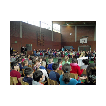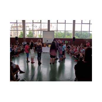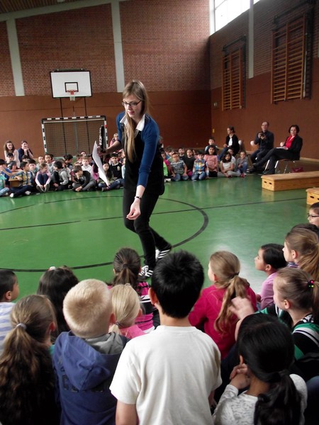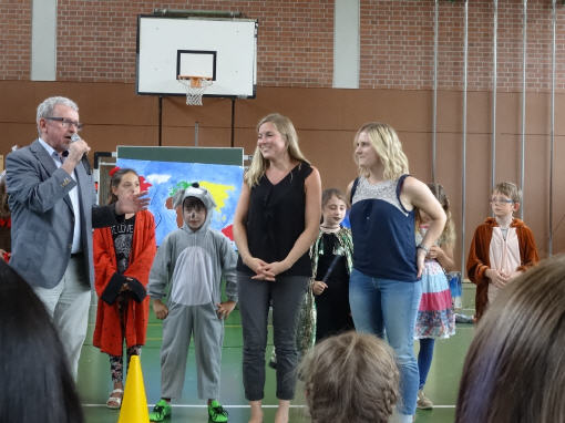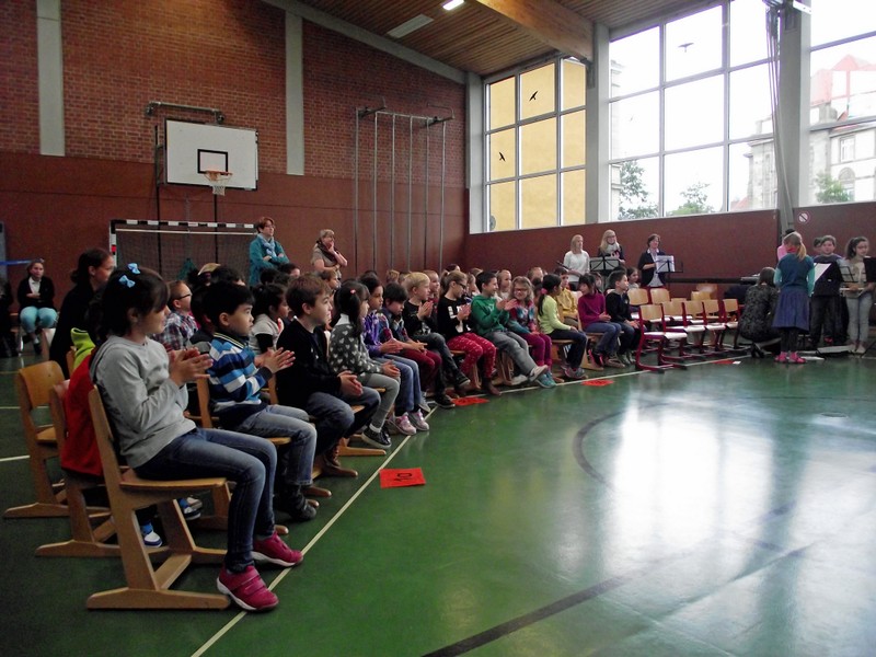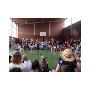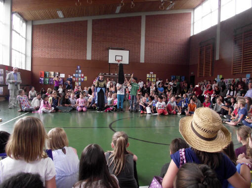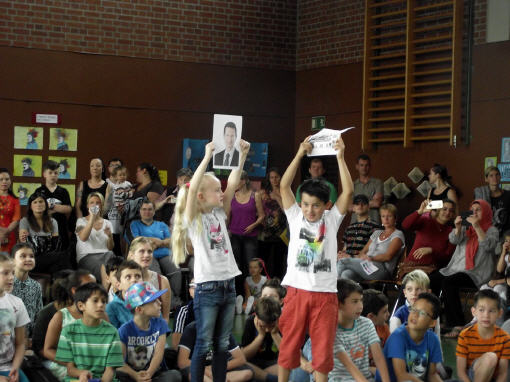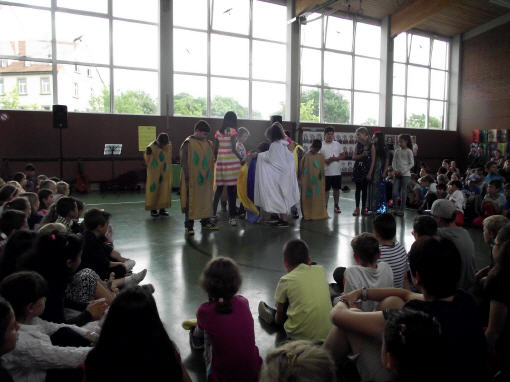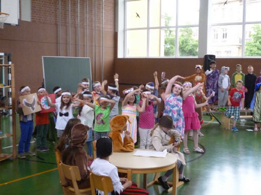 Dieses Musical mit seiner sehr aktuellen Thematik brachten die Kinder der 3b mit Hilfe der Klassen 1b, 2a und 4b am 12. Juli 2016 auf die Bühne unserer gut gefüllten Turnhalle. Nach monatelangem Kampf mit sehr viel Sprech- und Liedtexten begeisterten die Schülerinnen und Schüler mit einer imposanten einstündigen Aufführung das Publikum.