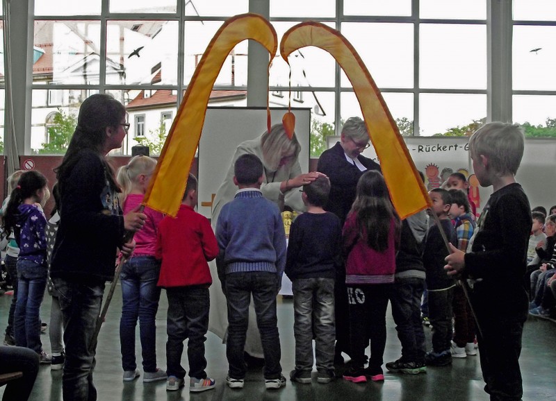 Gleich in der ersten Schulwoche versammelte sich die ganze Schulfamilie in der Turnhalle zur gemeinsamen multireligiösen Anfangsfeier. Schulleiter Herr Redolfi konnte alle Schüler und Lehrkräfte der Friedrich-Rückert-Schule begrüßen, sowie zahlreiche Eltern und für die Geistlichkeit Frau Pfarrerin Bruckmann und Frau Pastoralreferentin Hornung. In einem musikalischen Anspiel verdeutlichten die Kinder der Ganztagsklasse 4b mit ihrer Lehrerin Frau Slesinski sehr anschaulich, dass ohne gemeinsame Absprachen ein Zusammenspiel von Flöten ganz fürchterlich klingt. Halten sich alle an die besprochenen Regeln, gelingt ein Zusammenspiel von vielen Kindern und es entsteht wirklich schöne Musik. Genauso ist es im "Zusammenspiel" zwischen Menschen: Wenn man sich an Regeln hält, dann funktioniert das Zusammenleben - auf dem Pausehof, in der Schule und zu Hause. Durch ein goldenes Tor durften nun die Erstklässler schreiten. In der Mitte wurden sie begleitet von einem Segen oder einem guten Wunsch in der Schulgemeinschaft begrüßt. Anschließend trugen Kinder aus verschiedenen Klassen kleine Bitten vor, bevor Herr Redolfi zum Abschluss besonders den Religionslehrerinnen Frau Cetinkaya, Frau Gobs-Knoche und Frau Kneuer für die Vorbereitung, Frau Hornung und Frau Bruckmann für die geistliche Begleitung, dem Lehrerorchester für die gelungenen musikalische Untermalung und allen Lehrkräften und Kindern dankte, die mit ihrem friedlichem Miteinander in dieser Feier, ein Vorbild für die große Politik sein können.