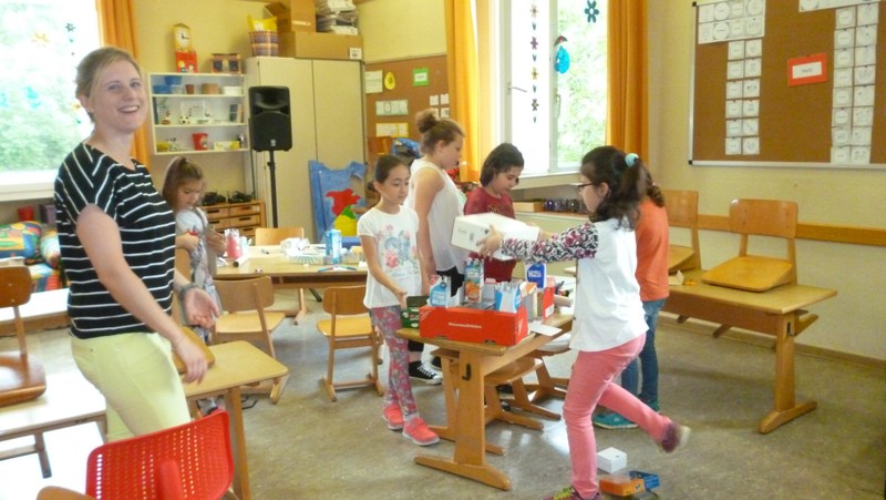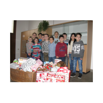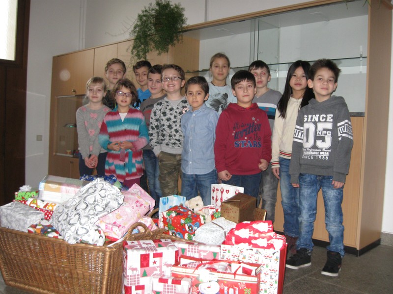 Kinder aus der Klasse 4b sorgten mit ihrer Lehrerin Frau Slesinski dafür, dass die Geschenke auch von der Friedrich-Rückert-Schule an ihren Bestimmungsort kamen.