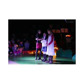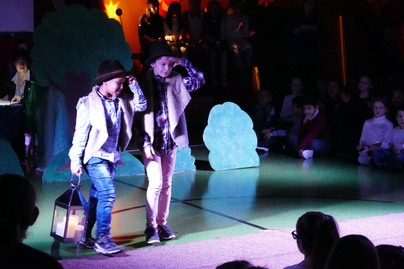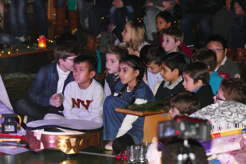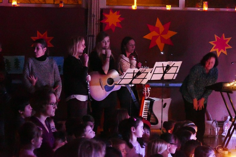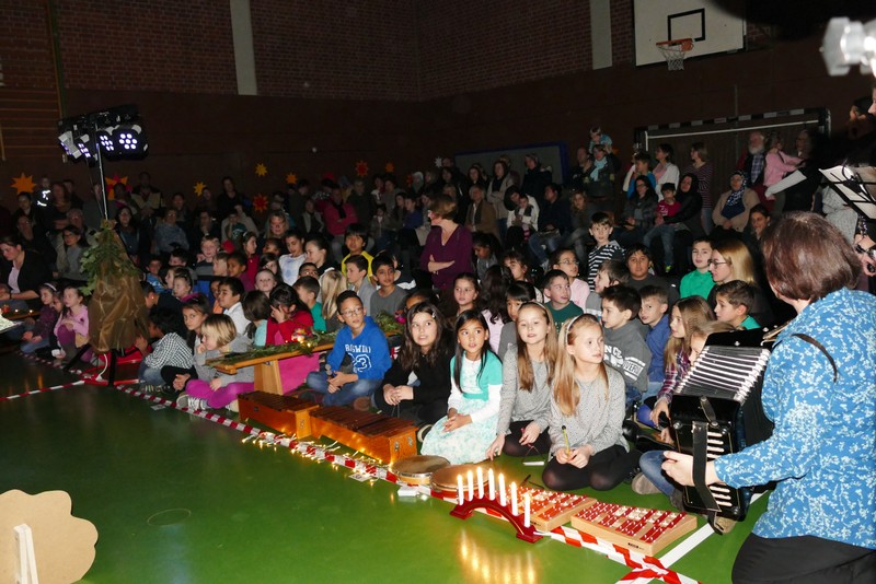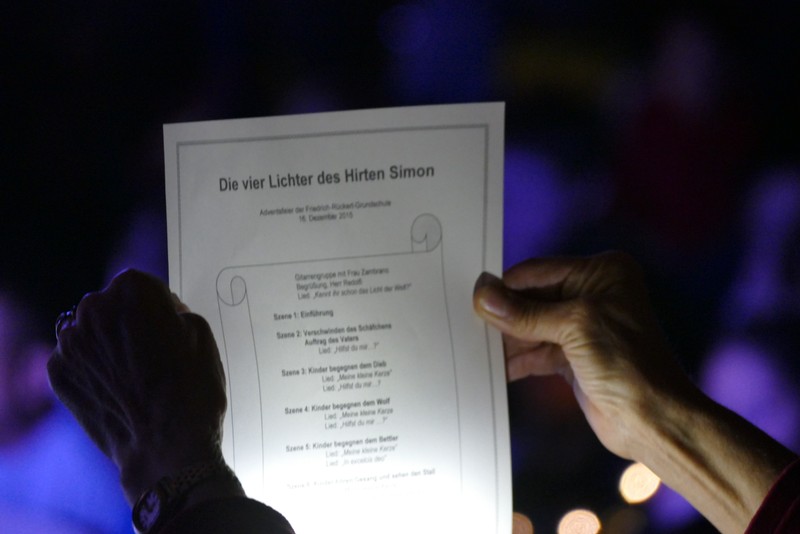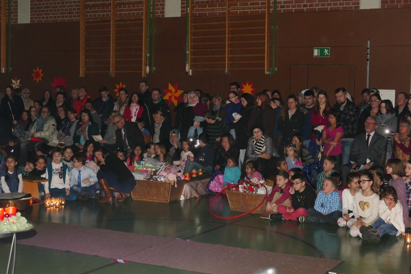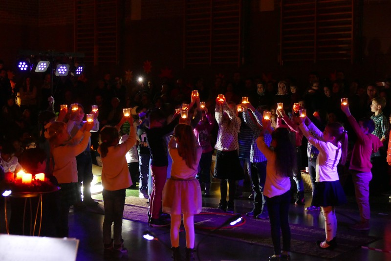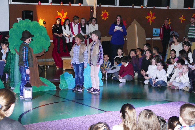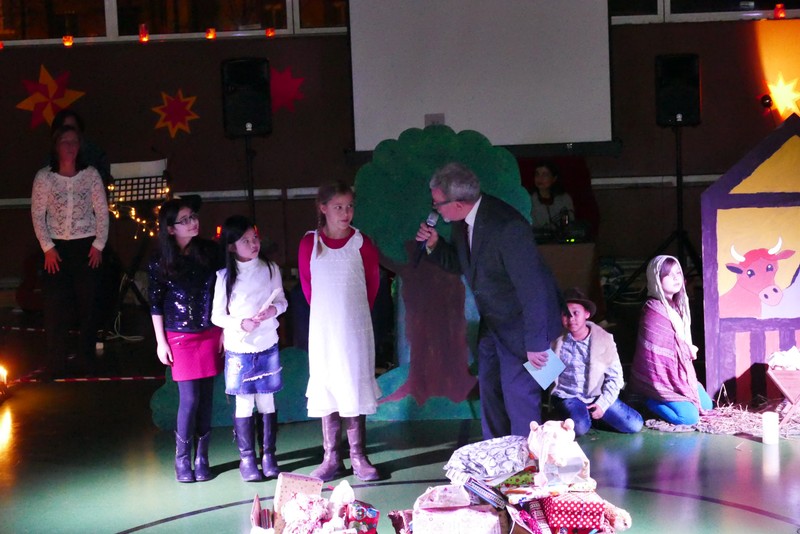 Die diesjährige Weihnachtsfeier stand ganz im Zeichen des Lichts. So setzte erstmals eine professionelle Lichtanlage Schauspieler, Sprecher und Musiker ins rechte Licht. Im Theaterstück "Die vier Lichter des Hirten des Simeon" zog sich das Licht der Kerzen wie ein roter Faden durch die Geschichte. Als ein kleines Schäfchen verloren geht, machen sich die beiden Kinder auf die Suche. Eine Laterne mit vier Kerzen soll ihnen dabei helfen. Auf ihrem Weg treffen sie Menschen und Tiere, die sie mit einem Licht der Nächstenliebe beschenken. Schließlich findet sich das verlorenen Schäfchen beim Jesuskind in der Krippe. "Auch bei uns soll Licht sein. An unserer Schule lernen und spielen Kinder aus verschiedenen Kulturen miteinander", so Schulleiter Herr Redolfi. "Wir wollen das Licht weitergeben. Kinder und Eltern haben Päckchen gepackt, die an Kinder in Not weitergegeben werden."