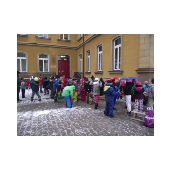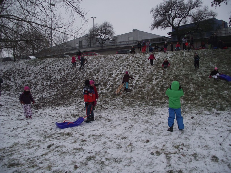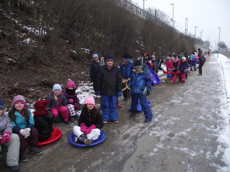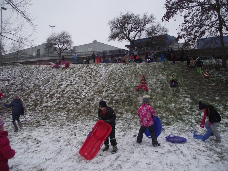Endlich Schnee! Spontan und ganz kurzfristig machten sich die Ganztagsklassen 1b, 2b und 3b ausgerüstet mit Schlitten, Bobs und Poporutschern auf zum Schlittenfahren. Zwar war der Hügel an den Mainwiesen hinter der Hahnenhügelbrücke nicht wirklich hoch und der Schnee auch gerade ausreichend, doch der Schneespaziergang und die Schlittenfahrt machte wirklich viel Spaß!