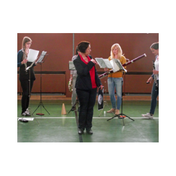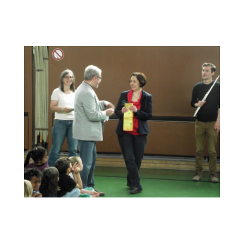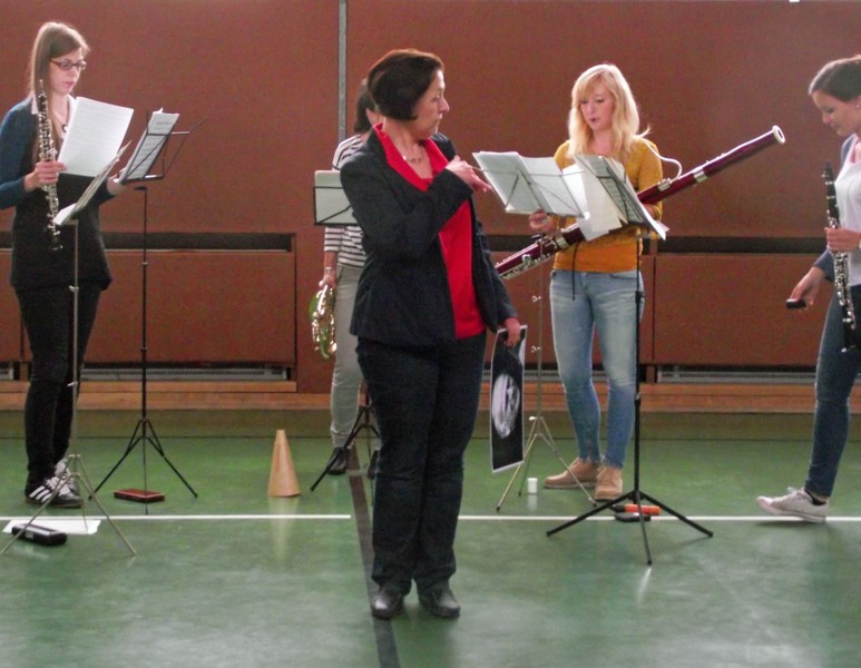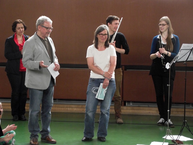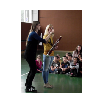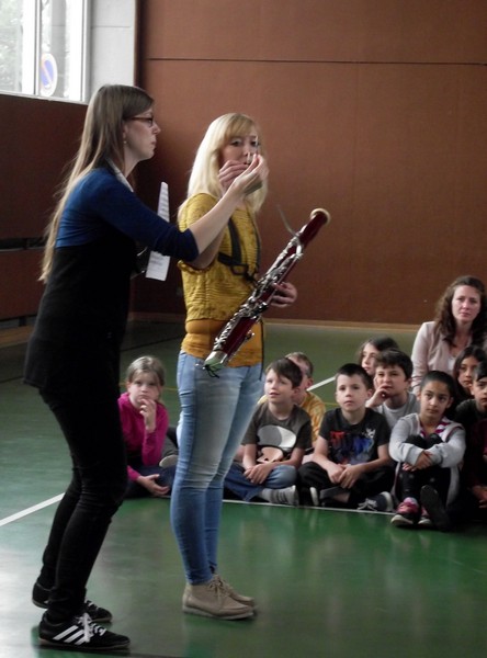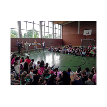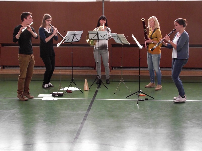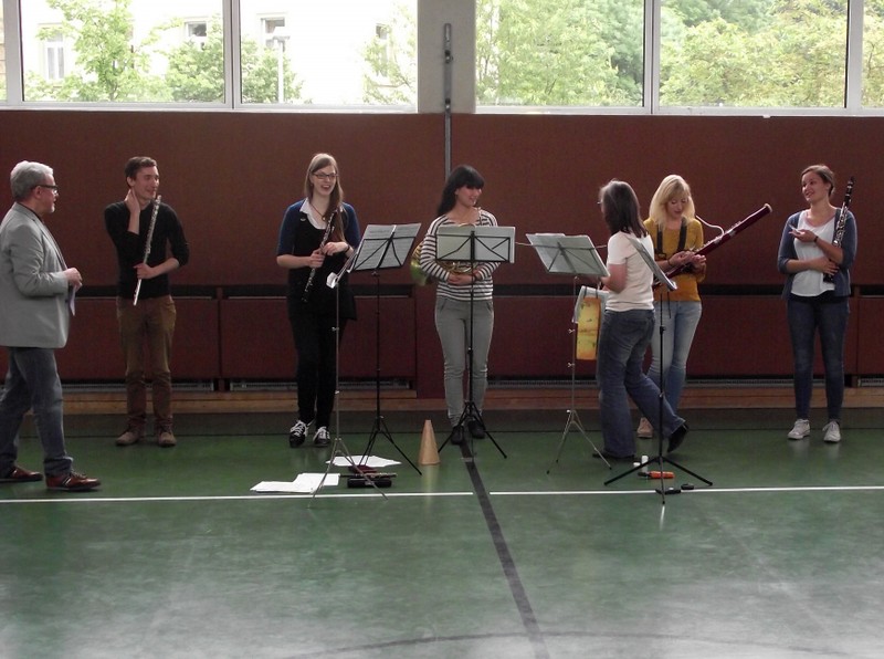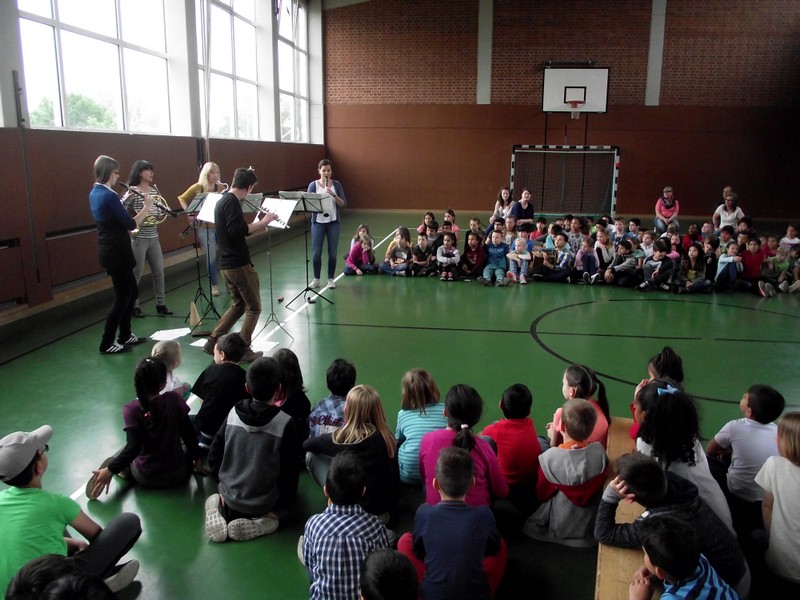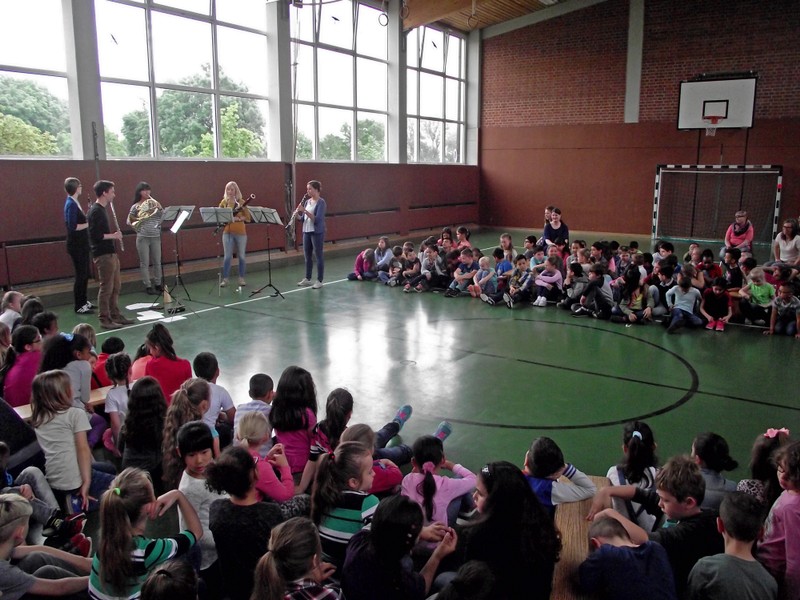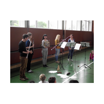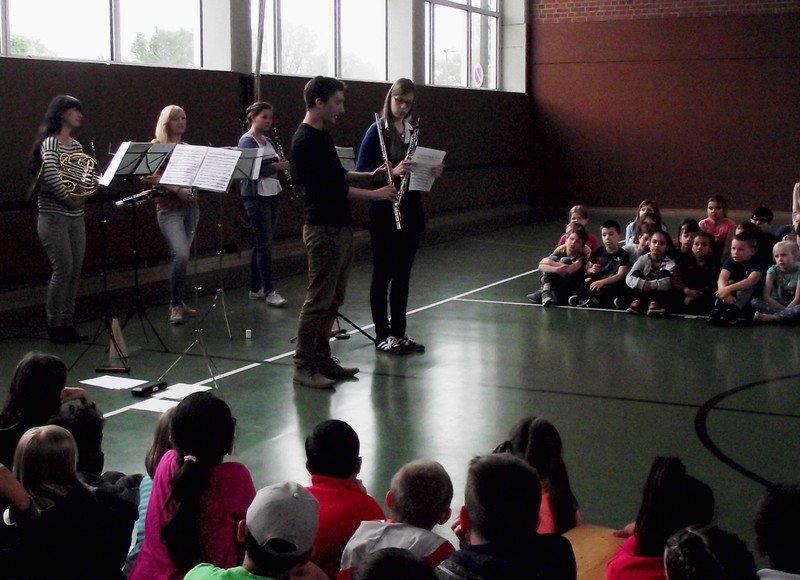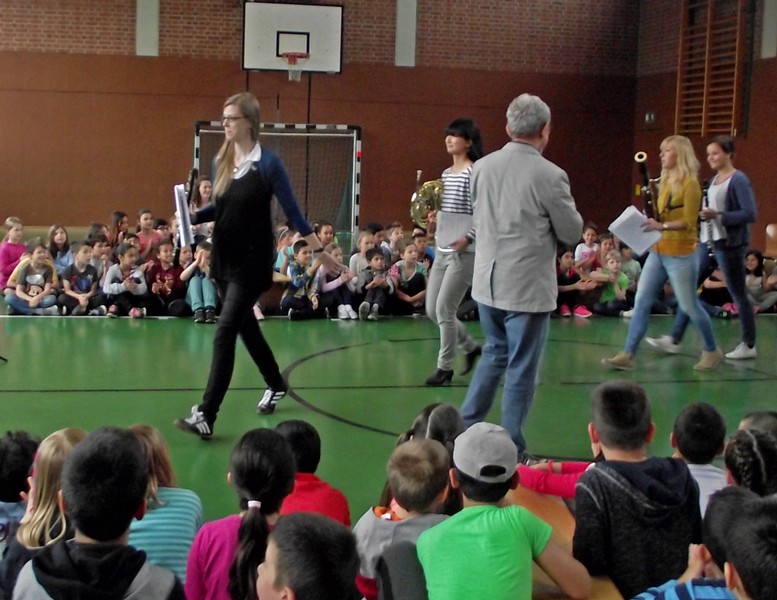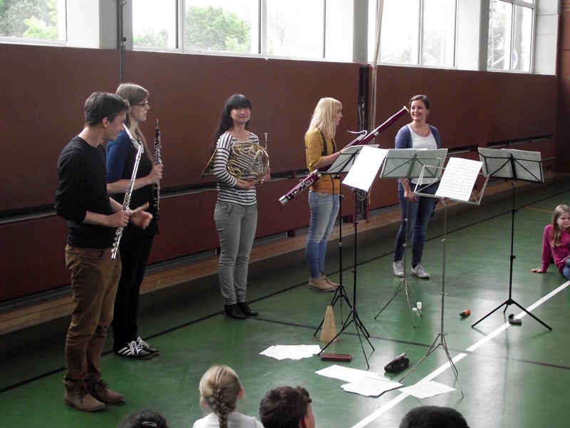 Am Freitag, den 3. Februar 2016, erwartete die Schülerinnen und Schüler der Friedrich-Rückert-Grundschule ein Konzert der besonderen Art: Fünf Studenten der Nürnberger Hochschule für Musik kamen mit ihren Instrumenten zu uns in die Turnhalle. Ihr Name - „Cinque Venti“ - „Fünf Winde“ ließ schon erahnen, welche Instrumente sie dabei hatten: Querflöte, Horn, Oboe, Klarinette und Fagott. In kurzen Interviews stellten die angehenden Profimusiker Miriam Ahrens, Christina Dreiner, Lisa Stockner, Motomi Kimura und Milan Jeremic ihre Instrumente vor. Dabei erzählten sie uns, wieso sie gerade ihr Instrument so gerne spielten, bevor die jungen Künstler uns jeweils einzeln als auch als Quintett mit ihrem spielerischen Können zum Staunen brachten. Für Überraschung sorgte Christina Dreiner mit ihrer Karotten-Klarinette! Eine ausgehöhlte Karotte und ihr Klarinettenmundstück genügten, um diesem ungewöhnlichen Instrument wohlklingende Töne zu entlocken! Mit begeistertem Applaus und einer „essbaren“ Aufmerksamkeit bedankte sich Schulleiter Herr Redolfi im Namen der ganzen Schulfamilie bei dem sympathischen Bläserquintett sowie bei Frau Rauscher vom Verein Yehudi Menuhin Live Musik Now Franken e.V. Yehudi Menuhin, ein weltberühmter Geiger und Dirigent, wollte mit seinem Projekt „Live Music Now“ die Musik hinaus aus den Konzertsälen direkt zu den Menschen bringen. Ein herzliches Dankeschön gebührt auch der stellvertretenden Schulleiterin Frau Slesinski, sie hatte das eintrittsfreie Konzert initiiert und den Kontakt zu Frau Rauscher gesucht.