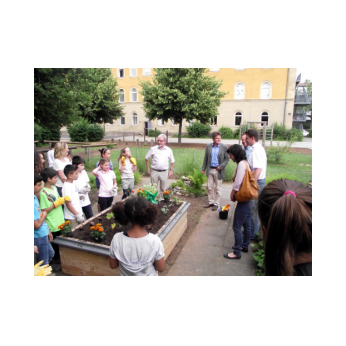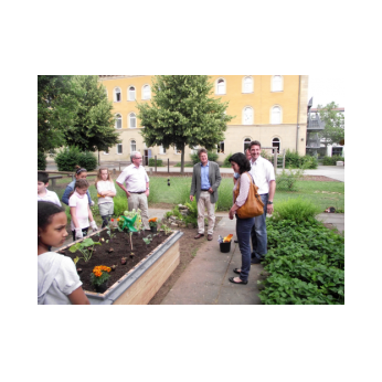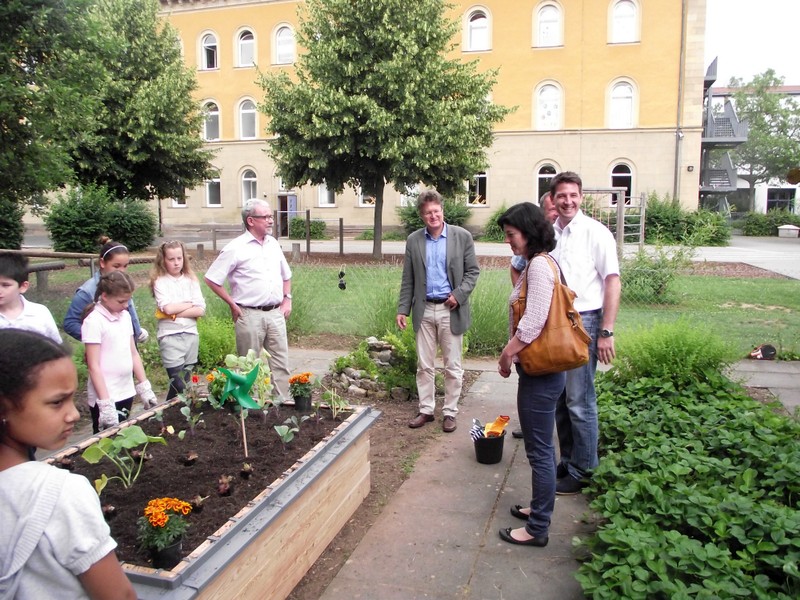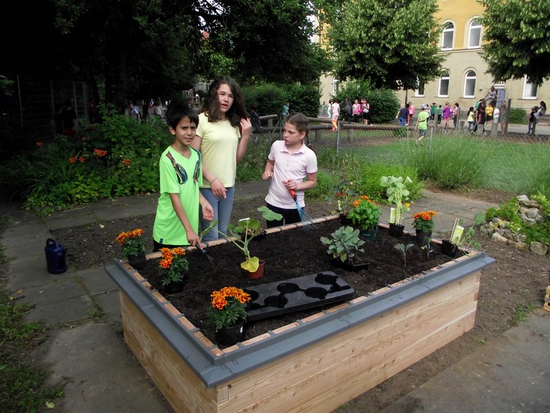 Im Rahmen der bundesweiten Spendenaktion Zukunft Stadt & Natur – PflanzenWelten wurde unserer Schule ein Hochbeet übergeben. Nachdem dieses von Hausmeister Herrn Wüst in Rekordzeit aufgebaut und mit Erde befüllt wurde, bepflanzten die Schülerinnen und Schüler der Schulgarten AG unter der Anleitung von Förderlehrerin Katharina Ums das neue Beet. Unsere Kinder freuen sich über das Hochbeet, in dem sie nun ihre eigenen Samen zu Pflanzen, Kräutern und Gemüse hochziehen werden. Und dies alles in angenehmer Arbeitshöhe und mit neuen Gartengeräten, welche uns ebenfalls gespendet wurden. So macht die Gartenarbeit noch viel mehr Spaß!