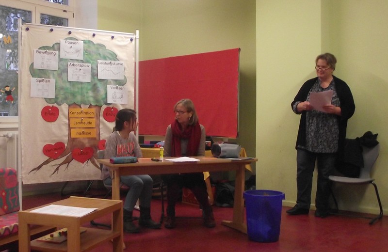 Am 25. November waren einige interessierte Eltern unserer Einladung zum 7. pädagogischen Elterncafé gefolgt. Dem Nachmittag, der unter dem Thema „Lernen lernen“ stand, wohnte auch das Evaluationsteam bei, das in dieser Zeit unsere Schule besucht hatte. Nach der Begrüßung durch Herrn Redolfi boten Frau Merkl, Frau Staffort-Hartlieb und Nathalie aus der 3b sehr eindrucksvoll und durch ein Rollenspiel in Szene gesetzt dar, wie Lernen effektiv gelingen kann. Schulleiter Herr Redolfi stellte unter dem Aspekt „Lernen mt allen Sinnen“ die kleine Divisionstafel vor. Anschließend kamen im Gespräch die Eltern zu Wort. Wir danken allen, die uns regelmäßig bei dieser Veranstaltung unterstützen, vor allem dem Elternbeirat und Frau Feser, die sich der Kinderbetreuung gewidmet hatte.