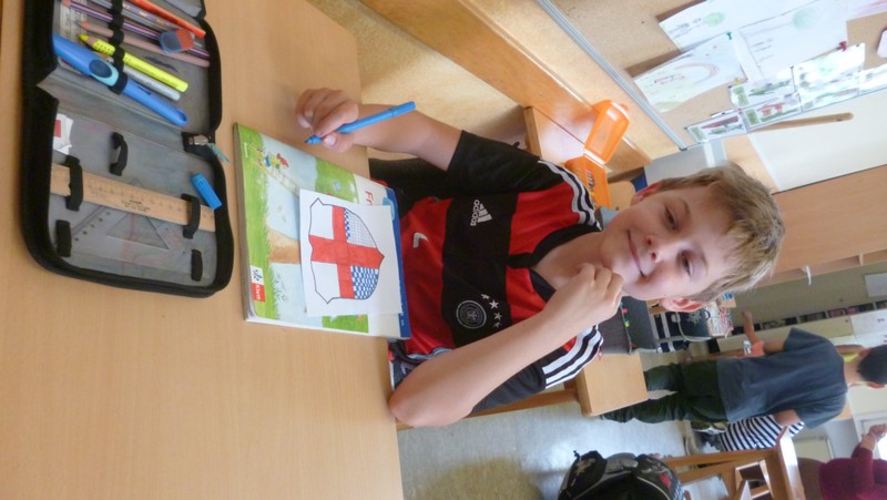 Zurück in der Schule suchten wir in Büchern nach Ritterburgen und erforschten das Leben damals. Vor allem die Wappen auf den Fahnen und Schildern der Ritter waren für uns sehr interessant und so malten wir unsere eigenen Wappen.