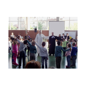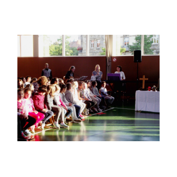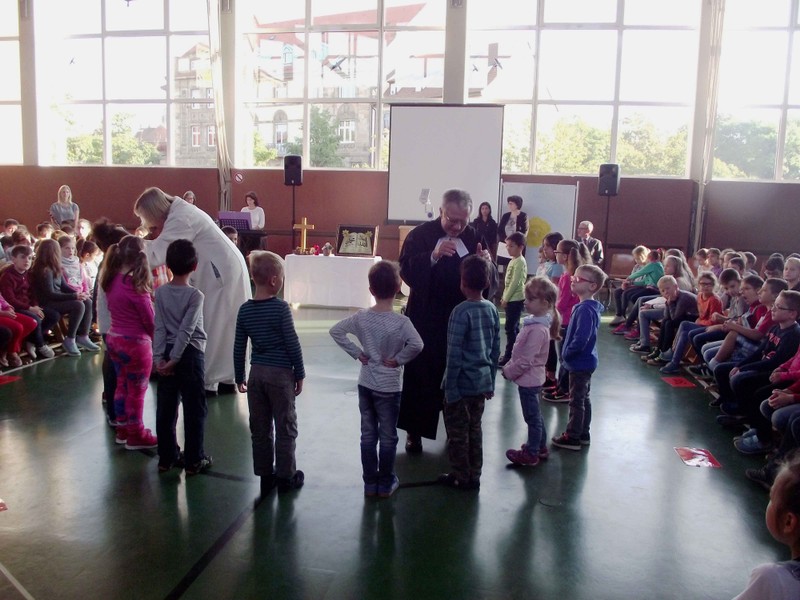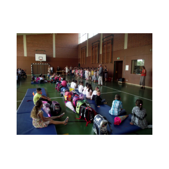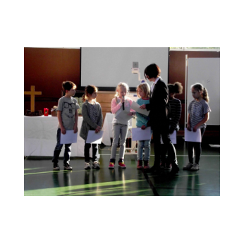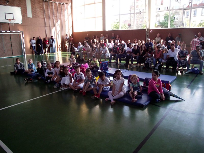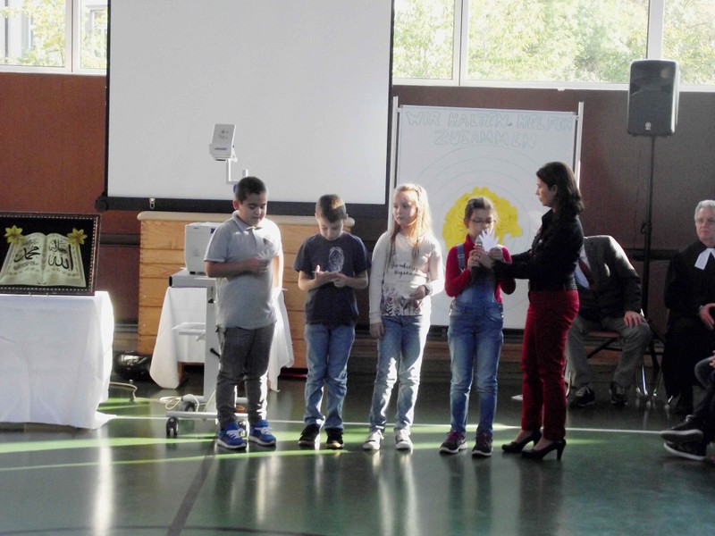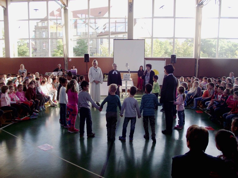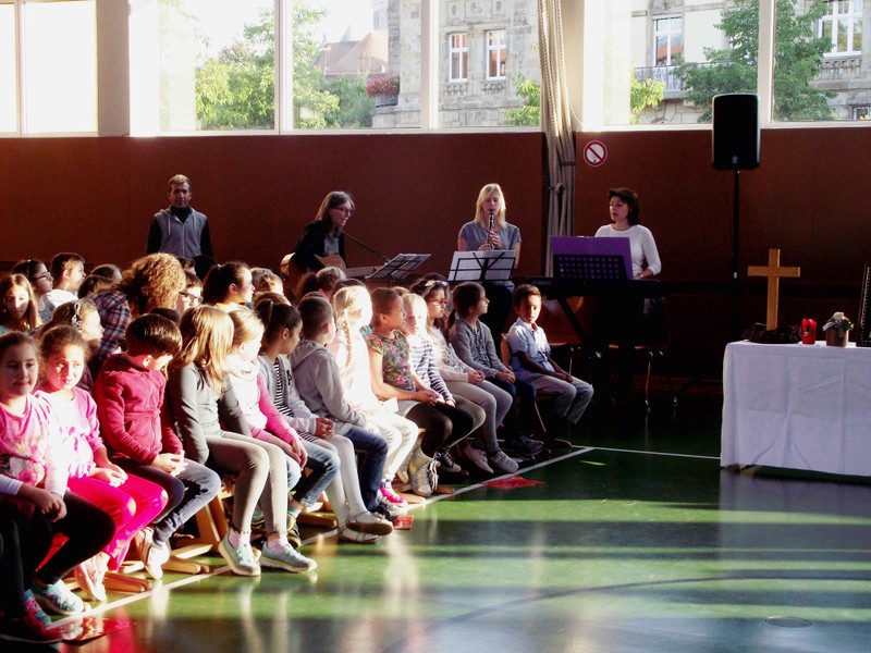 In diesem Jahr versammelten sich bei strahlendem Sonnenschein und hochsommerlichen Temperaturen Schüler, Lehrkräfte, Eltern und die Geistlichkeit zu der inzwischen zur guten Tradition gewordenen multireligiösen Schulanfangsfeier in der Turnhalle. Die neuen Erstklässer hatten bereits in den ersten Schultagen ihre Hände aus gelbem Tonpapier ausgeschnitten und mit ihrem Namen beschriftet. Sie hingen in der Anfangsfeier in der Mitte einer Stellwand. Die anderen Klassen werden in den nächsten Tag ebenfalls ihre Hände ausschneiden und um die der Erstklässler kleben. Ein schönes Bild dafür, wie die „Neuen“ in die Mitte unserer Schulgemeinschaft aufgenommen werden. Hände können so vieles tun: schneiden, malen, Büchertasche packen, aber eben auch helfen und trösten - wie auch der Tanz zu dem Lied über die Hände anschaulich zeigte. Anschließend erhielten die frischgebackenen Erstklässler von Frau Cetinkaya, Herrn Pfarrer Rambo, Frau Patoralreferentin und Herrn Schulleiter Redolfi gute Wünsche, Allahs Zuspruch oder Gottes Segen auf ihrem Weg in ihren neuen Lebensabschnitt. Für die musikalische Umrahmung sorgten Frau Slesinski, Frau Ums und Frau Akopyan.