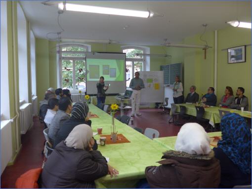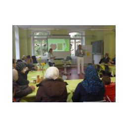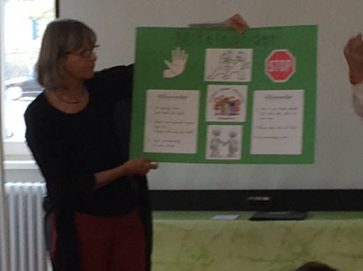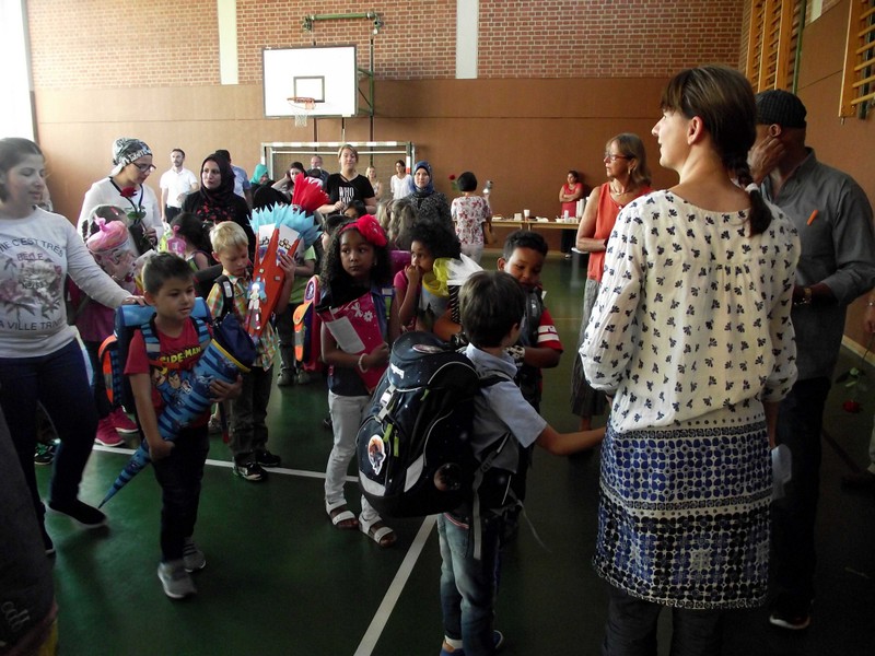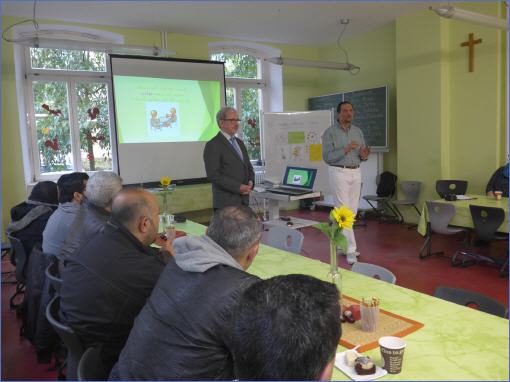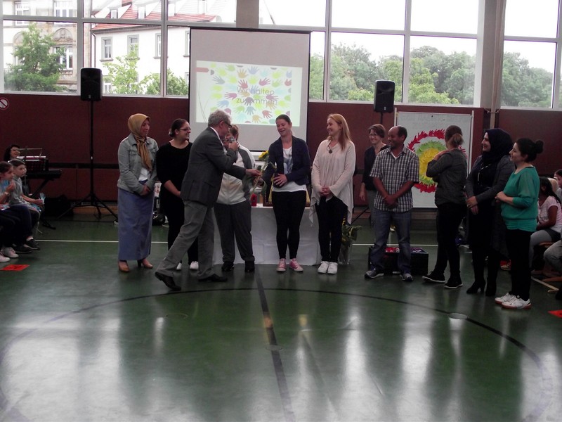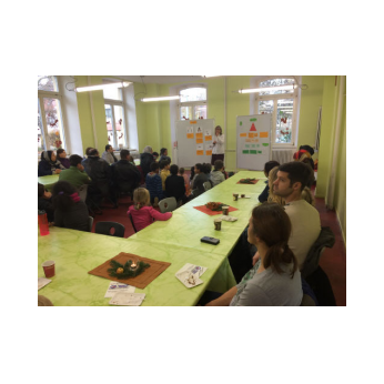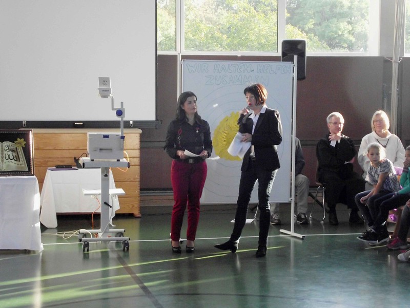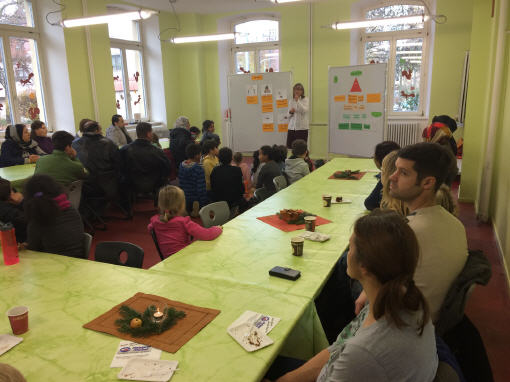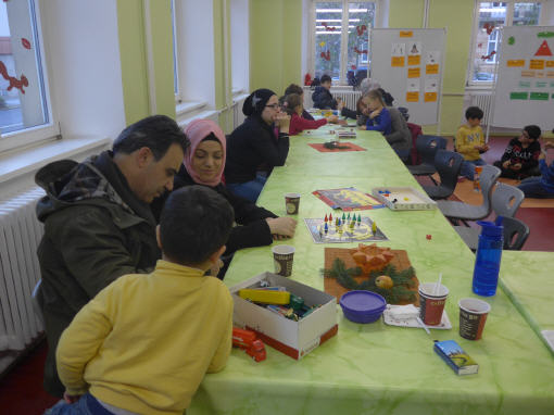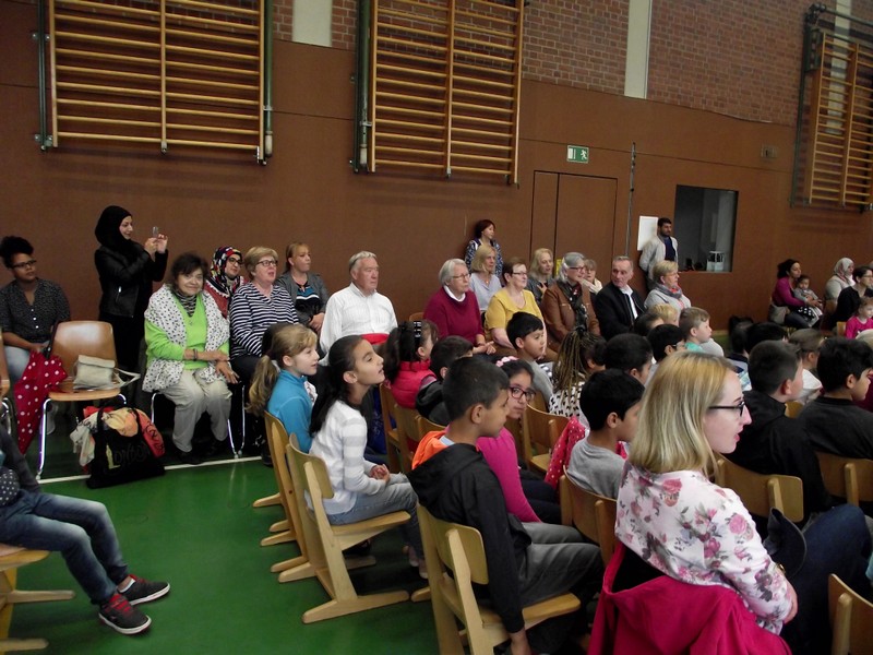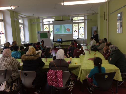 Auch in diesem Schuljahr luden wir wieder alle syrischen Eltern, deren Kinder seit September 2016 entweder neu zu uns an die Schule gekommen sind oder seit kurzem als Vorschulkinder den Deutsch-Vorkurs besuchen, zu einem Eltern-Nachmittag ein. Die schriftliche Einladung wurde in bewährter Weise von Herrn Abdelsayed Melik ins Arabische übersetzt. Unser Ziel war es, sich gegenseitig persönlich noch besser kennenzulernen und den zahlreich erschienen Eltern eine Vorstellung davon zu vermitteln, was uns aus pädagogischer Sicht wichtig ist und wie ein Schultag abläuft. Die grundlegenden Informationen, vorgetragen von Frau Staffort-Hartlieb, den beiden Klassenleiterinnen Frau Kärpf und Frau Martin, von Frau Cetinkaya sowie von Schulleiter Herrn Redolfi wurden jeweils sofort von Herrn Melik ins Arabische übersetzt. Veranschaulicht wurden die Ausführungen auch durch eine Präsentation mit vielen Bildern aus dem Schulalltag, die jeweils auch in arabischer Schrift beschrieben wurden. So erfuhren die Eltern zum Beispiel, dass die Teilnahme am Schwimmunterricht für alle Kinder verpflichtend ist, wie motivierend sich ein Lob bei der täglichen Lesehausaufgabe auswirkt und sie ihr Kind unbedingt auch durch die regelmäßige Kontrolle der Büchertasche, der Mitteilungsmappe und des Elternheftes unterstützen sollten. Nach dem Vortrag fanden noch viele kleine Gespräche zwischen Eltern, Lehrkräften und Schulleiter statt. Frau Schabel, unsere neue Mitarbeiterin für den Bereich Deutsch als Zweitsprache, brachte sich in die Betreuung der Kleinsten ein. Für das leibliche Wohl sorgte wieder unser Elternbeirat, vertreten durch Frau Akdemir und Frau Kardas. Ein herzliches Dankeschön gebührt allen, die diesen Nachmittag für unsere syrischen Eltern ermöglicht haben.