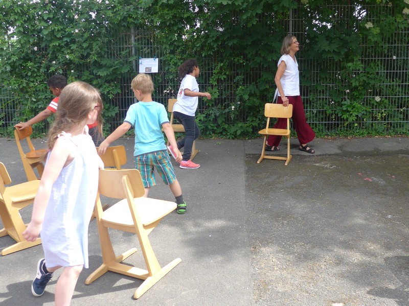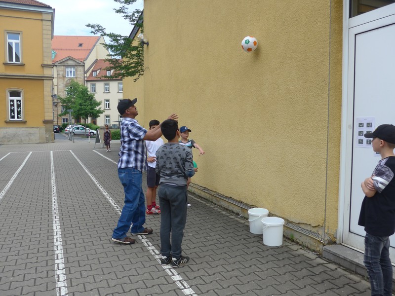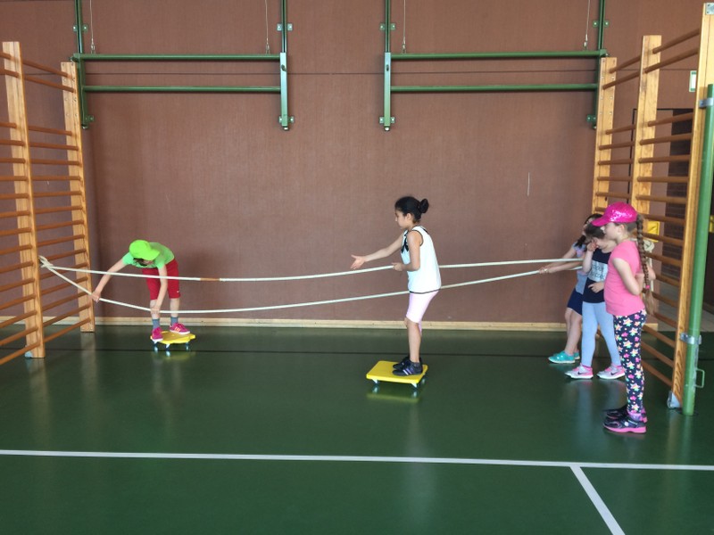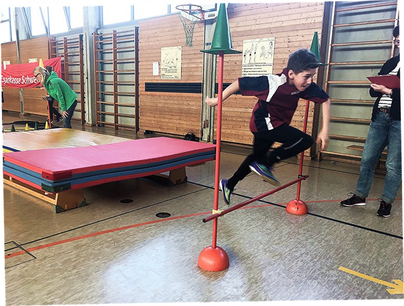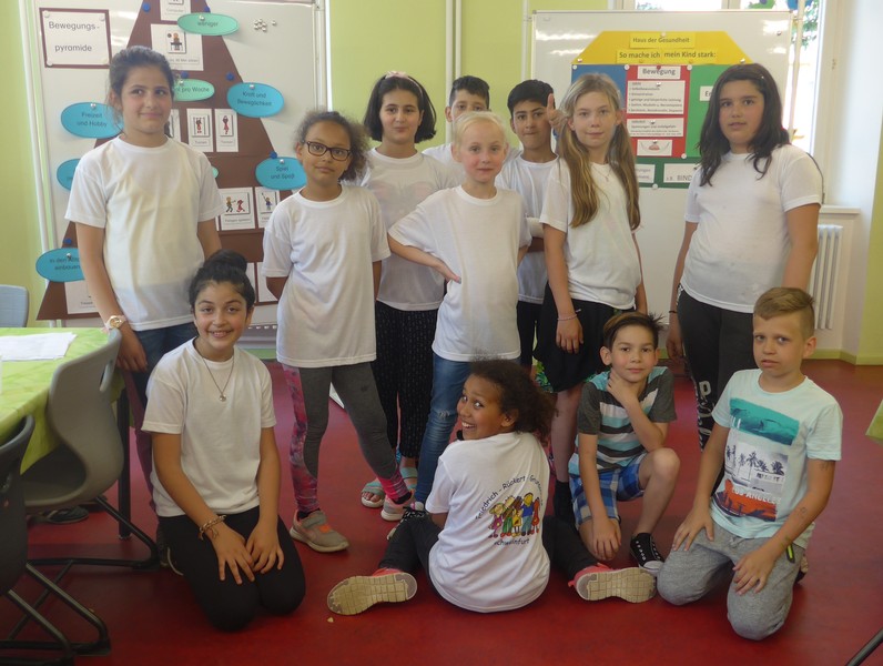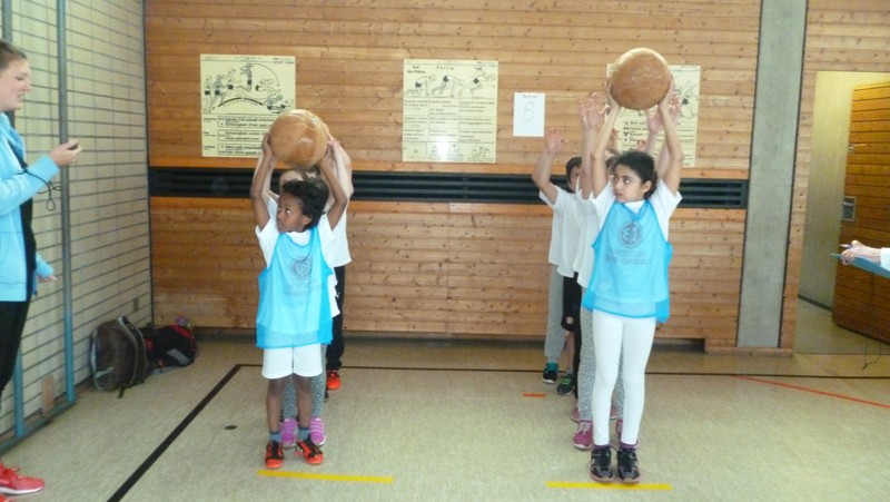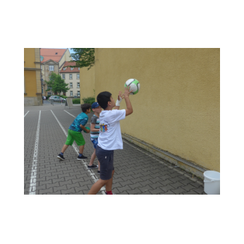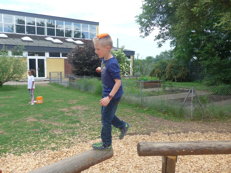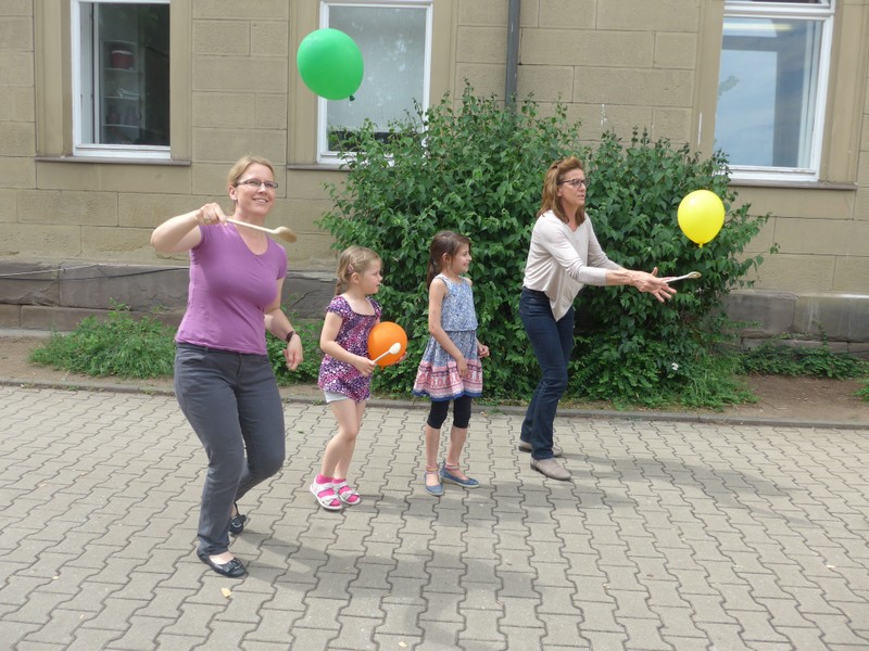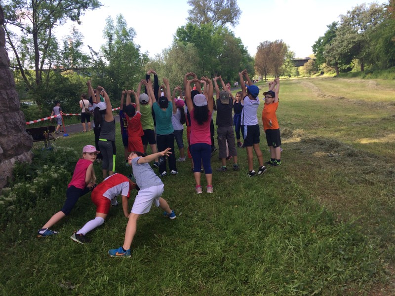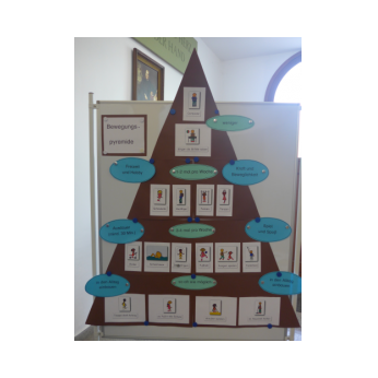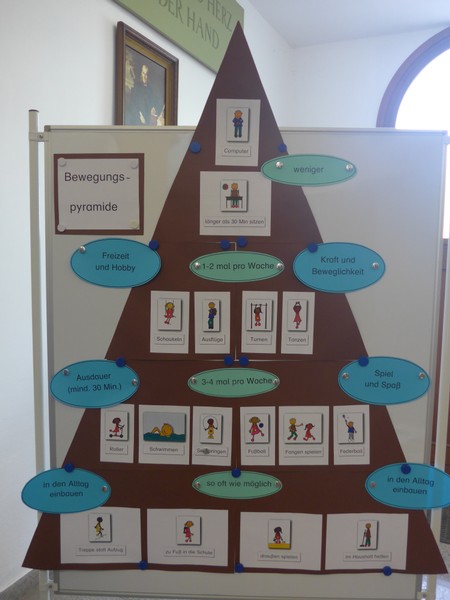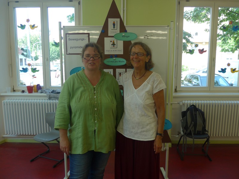 Bei Sommerhitze wurden interessierte Eltern mit ihren Kindern im Speisesaal von Schulleiter Herrn Redolfi begrüßt, um dort von Frau Staffort-Hartlieb zu erfahren, dass Bewegung neben Ernährung und Entspannung die dritte tragende Säule im "Haus der Gesundheit" darstellt und somit wesentlich zur gesunden und stärkenden Entwicklung unserer Kinder beitragen kann. Bereits am Vormittag hatte Frau Merkl mit den Kindern der Klasse 2b Obstsalat zubereitet und stellte nun konkret eine Bewegungspyramide in Bildern vor. Anschließend durften alle ob „Groß und Klein“ an den im Schulhof vorbereiteten Bewegungsstationen mit Spaß ihre Erfahrungen sammeln. Freiwillige Kinder der 4. Klassen halfen tatkräftig an den neun Stationen mit. Mit einer kurzen Entspannungsübung beschlossen Frau Staffort-Hartlieb und Frau Merkl den Nachmittag mit großem Dank an alle helfenden Hände: Frau Schabel für die Kinderbetreuuung, dem Ellternbeirat für Speis und Trank und unserem Hausmeister Herrn Wüst für die perfekte organisatorische Unterstützung.