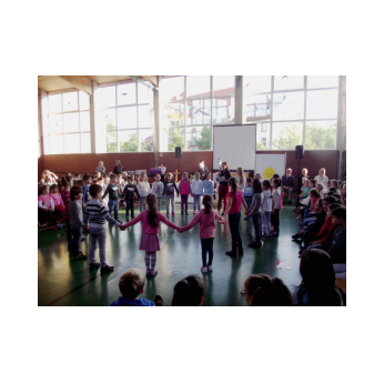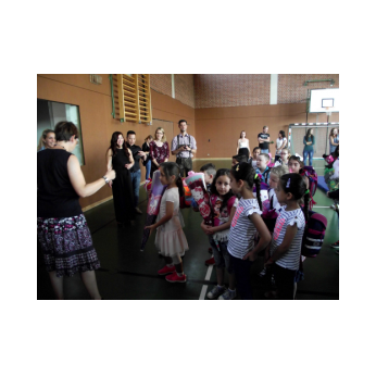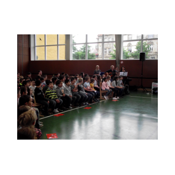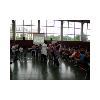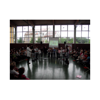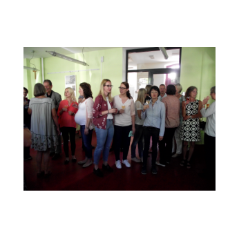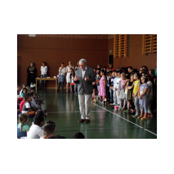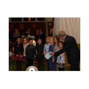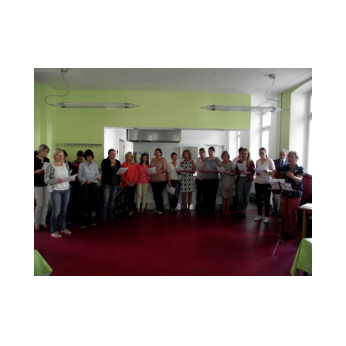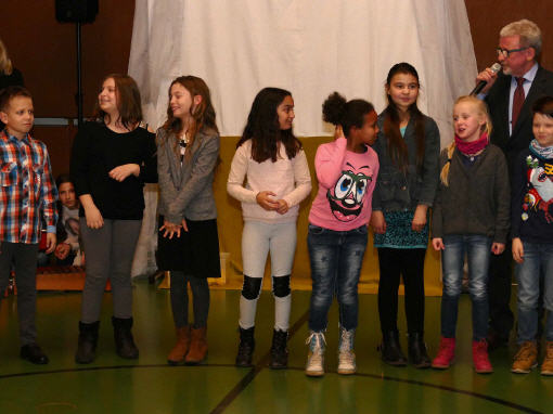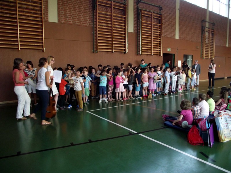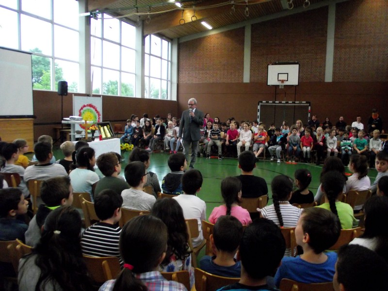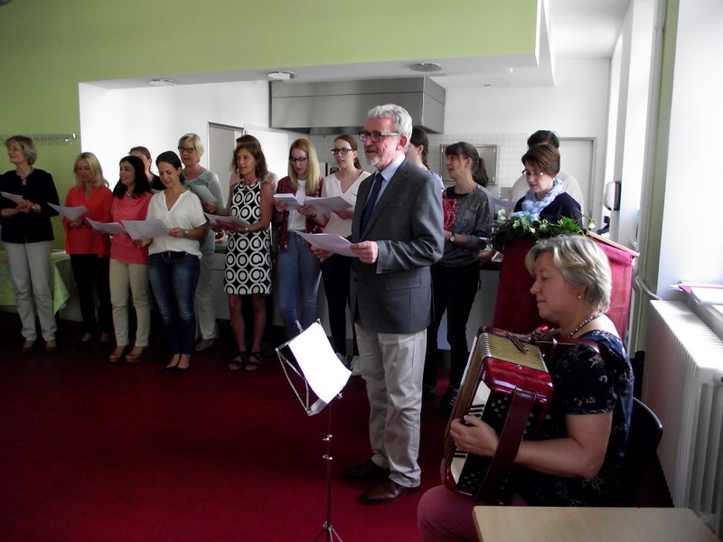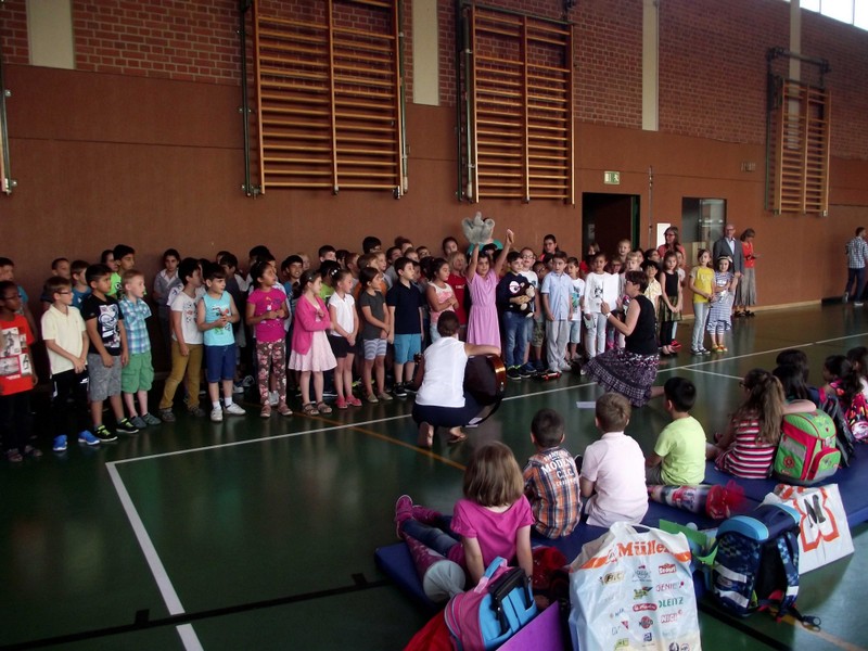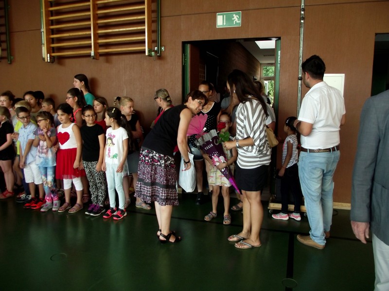 Zum Schuljahresende bedankte sich Schulleiter Herr Redolfi bei allen Lehrkräften, Frau Reusing und Herrn Wüst für das Engagement und tägliche Arbeit mit den Kindern. Den Lehrkräften, die zum Schuljahresende unsere Schule verließen, wünschte er alles Gute für ihre Zukunft. Mit einem Medley des Lehrerchors und einem Präsent wurde anschließend Frau Gisela Staffort-Hartlieb in den wohlverdienten Ruhestand "gesungen".