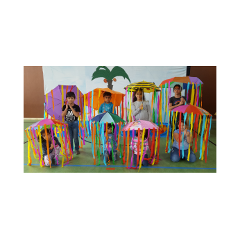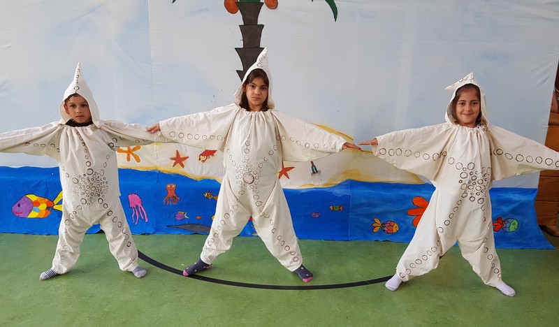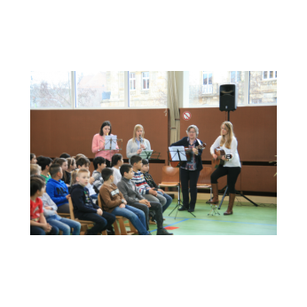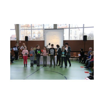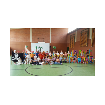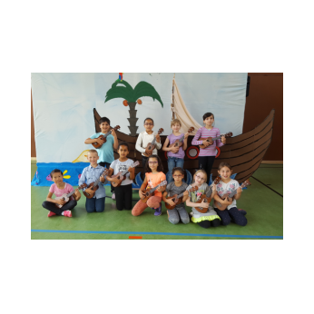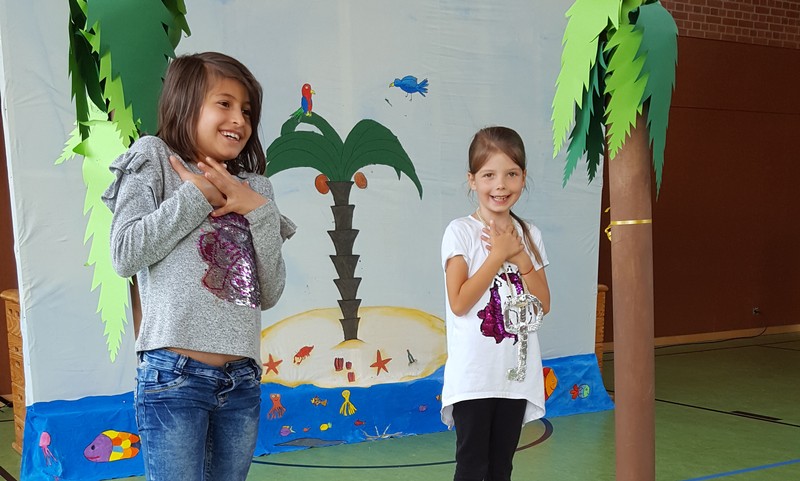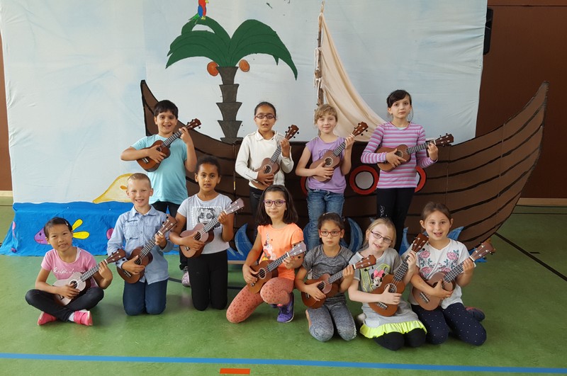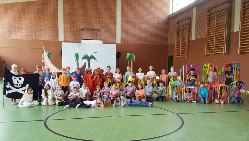 Aufregung und Lampenfieber lagen in der Luft, als eine Horde wilder Piraten mit ihrem Piratenschiff Eltern, Geschwister, Lehrer und Freunde der Friederich-Rückert-Schule im Eingangsbereich der Turnhalle begrüßten. Eingeladen hatten die beiden Ganztagsklassen 1c und 2b mit ihren Klassenlehrerinnen Frau Claudia Martin und Frau Corinna Merkl zusammen mit Frau Carmen Thiergärtner von der Musikschule Schweinfurt zu einem selbstgeschriebenen Kindermusical mit dem Titel „Das rote Ungeheuer sucht den Schatz“. In seiner kurzen Ansprache begrüßte Schulleiter Günther Leo Redolfi unter den zahlreichen Gästen die beiden Leiter der Schweinfurter Musikschule Frau Andrea Schärringer und Herrn Thomas Barisch besonders herzlich, da ohne die jahrelange gute Zusammenarbeit dieses Musical gar nicht möglich gewesen wäre. Seit Beginn des Schuljahres erhielten die Kinder der beiden Ganztagsklassen wöchentlich einmal Ukulelenunterricht. Um das Erlernte auch richtig in „Szene“ zu setzen, machten sich die drei Lehrerinnen an das Projekt „Kinder-Musical“: über mehrere Monate hinweg wurde geplant, gedichtet, vertont, gebastelt, gehämmert, genäht und ganz viel mit den Kindern geprobt! Nach den Begrüßungsworten nahmen die Piraten die Zuschauer mit auf ihre spannenden Abenteuer. Zwei Mädchen, Lola und Loline, wurden von dem roten Ungeheuer, das gerne den Glitzerschatz der beiden hätte, auf eine einsame Insel entführt. In ihrer Not werfen die beiden Mädchen eine Flaschenpost mit einem Hilferuf ins Meer, die von den Piraten herausgefischt wird. Aber da fangen die Probleme erst an, denn keiner der Piraten kann lesen. So werden verschiedene Meeresbewohner befragt: Seesterne, Quallen und Schüttelfische - aber keiner kann lesen! Außer einem - der letzte Schüttelfisch kann die Botschaft entschlüsseln und so finden die Piraten die Insel mit den beiden Entführten und den heiß ersehnten Glitzerschatz. Natürlich geraten sie dabei in Streit! Das rote Ungeheuer hatte gerade noch rechtzeitig einen Super-Tipp: Teilen, das ist wunderbar! Unter den Klängen des Abschlussliedes wurde jedem klar, Lesen können, ist wunderbar!