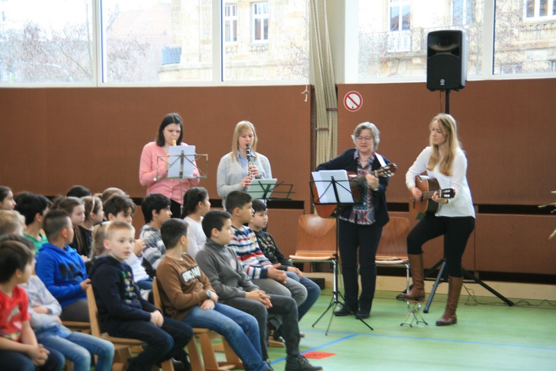 Natürlich stellten die engagierten Musiker ihre unterschiedlichen Instrumente auch immer kurz vor, bezogen ihr junges Publikum mit ein und beantworteten geduldig viele Fragen. Nach knapp einer Stunde harter Arbeit war für die Musiker eine Pause angesagt. Mit einer kleinen Stärkung aus der Brotzeitdose schloss viel zu früh dieses wirklich beeindruckende und kurzweilige Kinderkonzert mit dem Instrumentalstück „Mahlzeit“, bei dem acht Holzkochlöffel die Hauptrolle spielten.