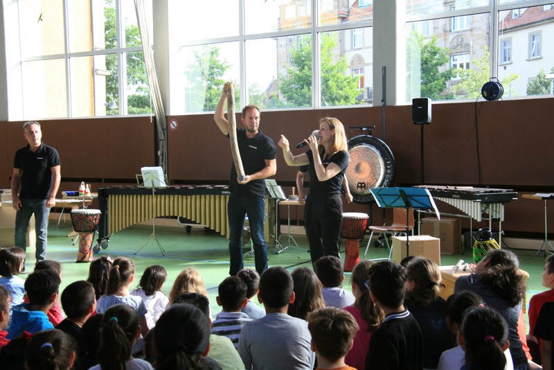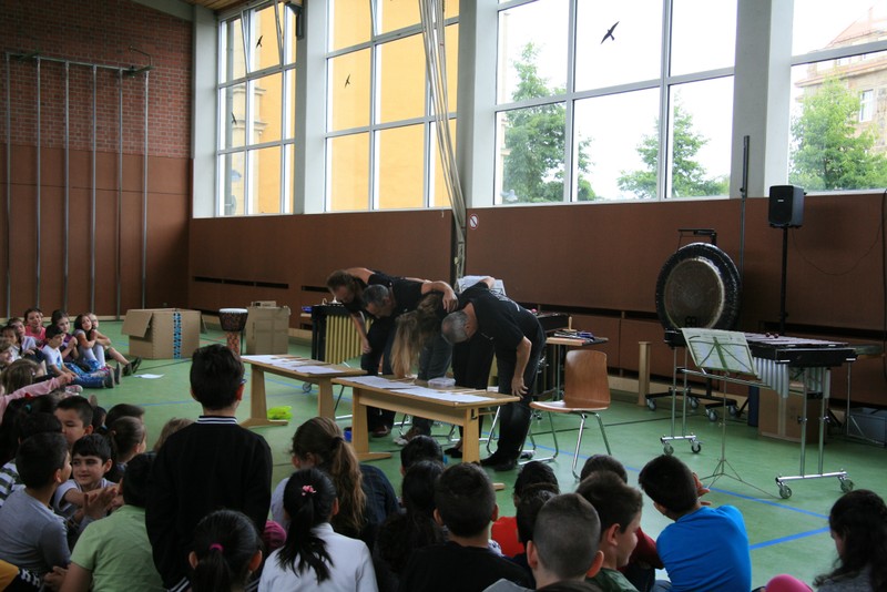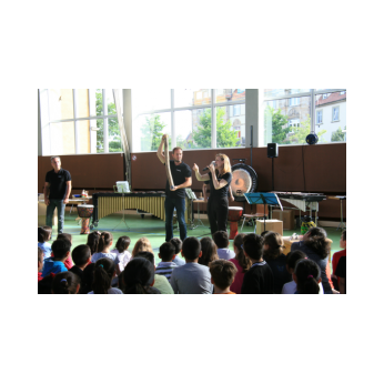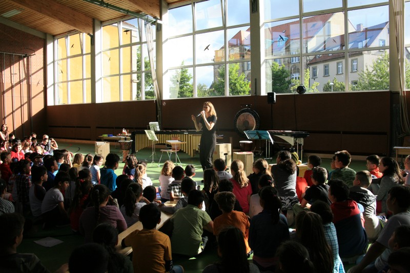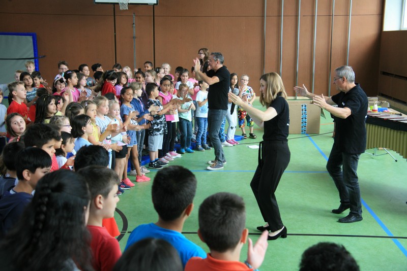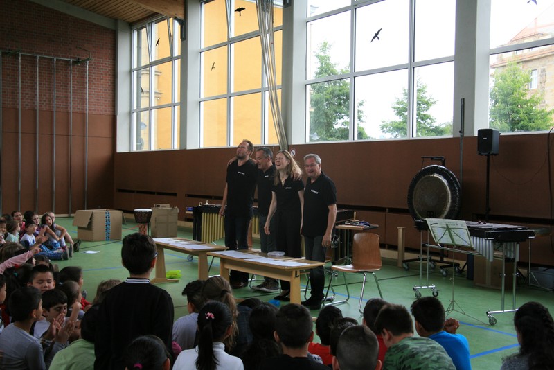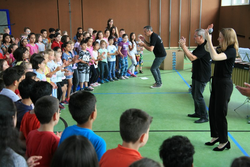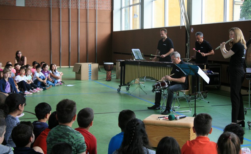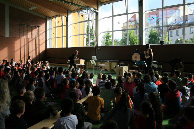 „Schlag-zeu-ger, Schlag-zeu-ger!“, scholl es stimmgewaltig aus knapp 200 Kehlen der Friedrich-Rückert-Schulkinder. Sie unterstützen die Flötistin Natalie Schwaabe vom Symphonieorchester des Bayerischen Rundfunks dabei, ihre wieder einmal scheinbar verspäteten Kollegen in die Turnhalle zu bekommen. Und dann kamen sie, die Schlagzeuger Markus Steckeler, Guido Marggrander und Christian Pilz! Aber nicht mit Trommeln oder Pauken, sondern mit ganz normalen Pappkartons. Wenige Sekunden später war klar, um Musik zu machen braucht es nicht viel! Außer Muskeln und vollen Körpereinsatz vielleicht! Anschließend durften die Grundschüler dies gleich zusammen mit den Profimusikern selbst ausprobieren. Gemeinsam ließen sie nur mit ihren Körperinstrumenten ein Gewitter aufziehen. Danach wurden das begeisterte Publikum in den Regenwald entführt und mit dem Boléro von Maurice Ravel in die Welt der klassischen Musik.