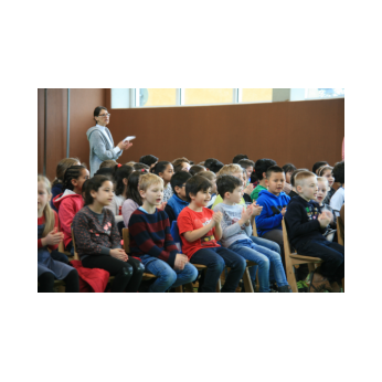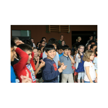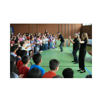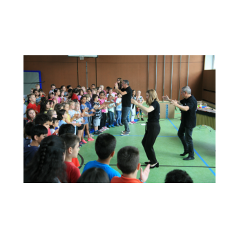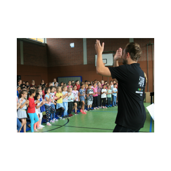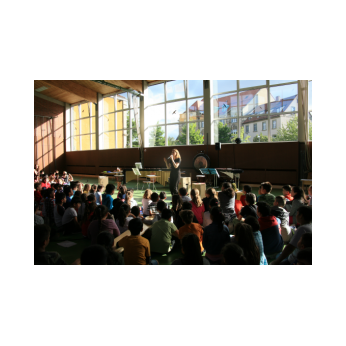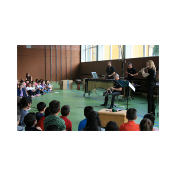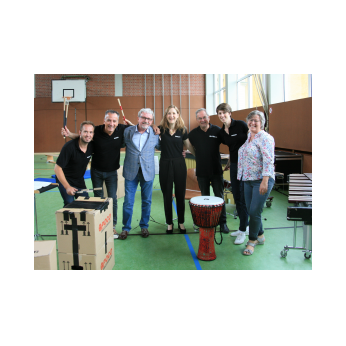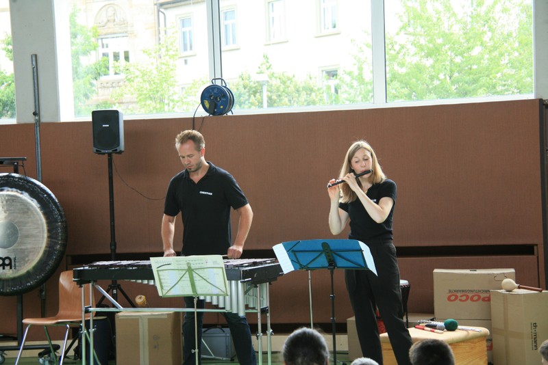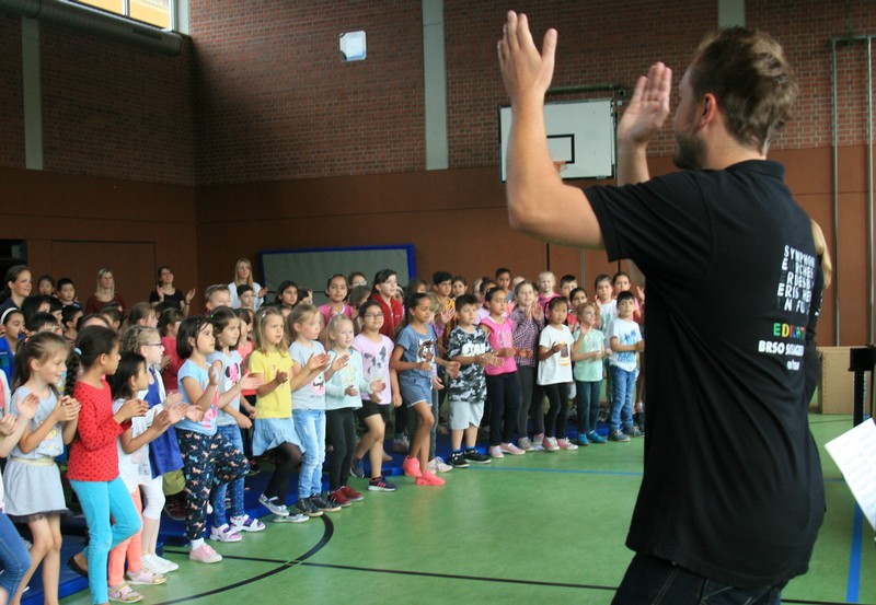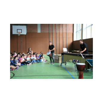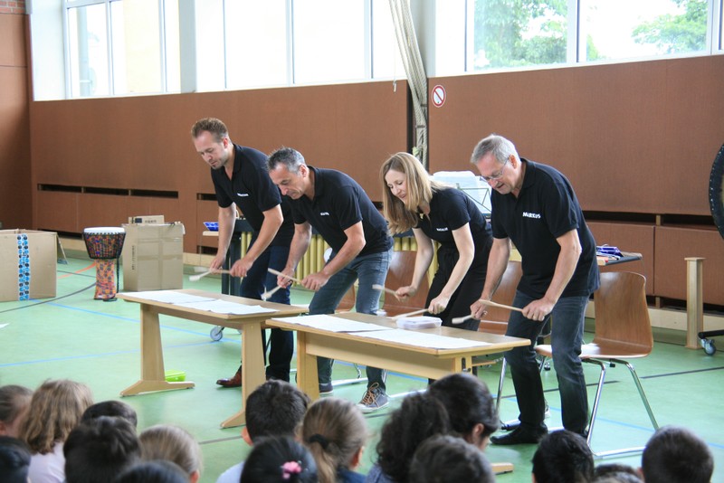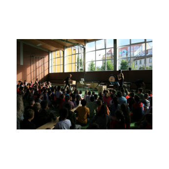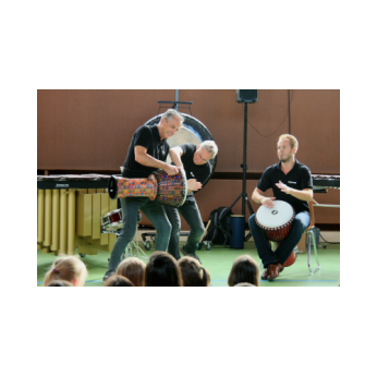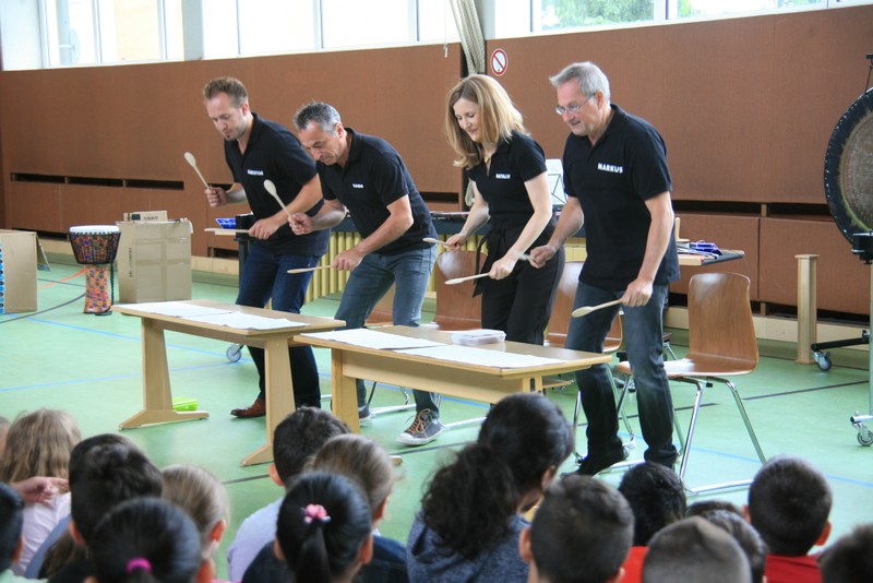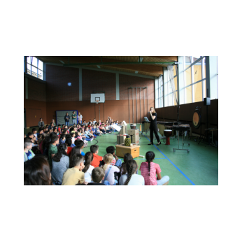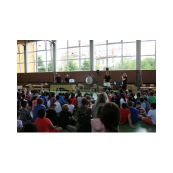 „Schlag-zeu-ger, Schlag-zeu-ger!“, scholl es stimmgewaltig aus knapp 200 Kehlen der Friedrich-Rückert-Schulkinder. Sie unterstützen die Flötistin Natalie Schwaabe vom Symphonieorchester des Bayerischen Rundfunks dabei, ihre wieder einmal scheinbar verspäteten Kollegen in die Turnhalle zu bekommen. Und dann kamen sie, die Schlagzeuger Markus Steckeler, Guido Marggrander und Christian Pilz! Aber nicht mit Trommeln oder Pauken, sondern mit ganz normalen Pappkartons. Wenige Sekunden später war klar, um Musik zu machen braucht es nicht viel! Außer Muskeln und vollen Körpereinsatz vielleicht! Anschließend durften die Grundschüler dies gleich zusammen mit den Profimusikern selbst ausprobieren. Gemeinsam ließen sie nur mit ihren Körperinstrumenten ein Gewitter aufziehen. Danach wurden das begeisterte Publikum in den Regenwald entführt und mit dem Boléro von Maurice Ravel in die Welt der klassischen Musik.