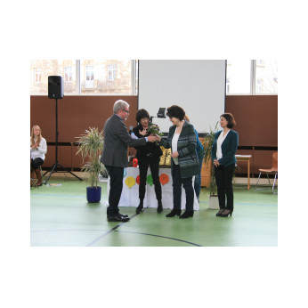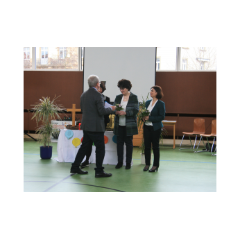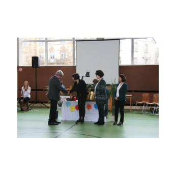 Nach dem wohlverdienten Applaus bedankten sich Rektor Leo Redolfi und Frau Freunek, die dieses tolle Event für unsere Schule organisiert hatte, mit einem kleinen Präsent bei jedem der vier Münchner Musiker und Hannah Birkner, der Verantwortlichen für die Organisation des BRSO Education Projekts.