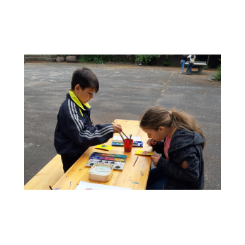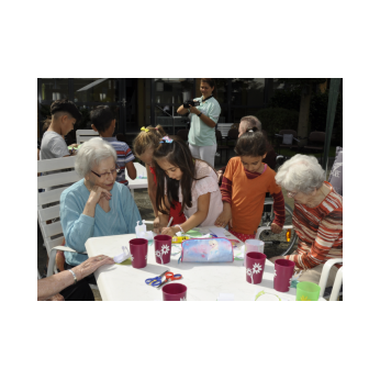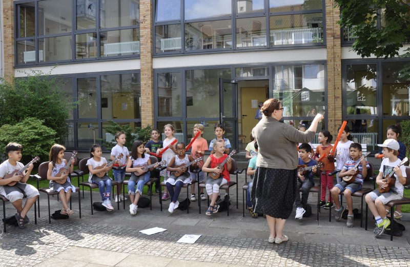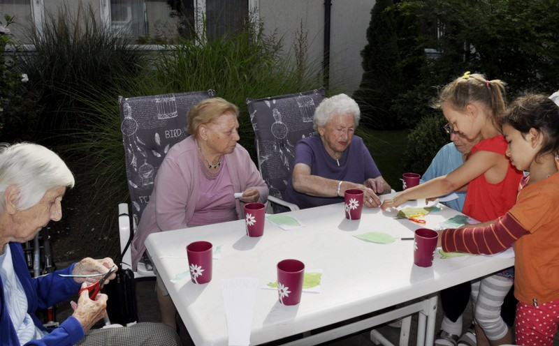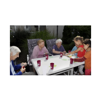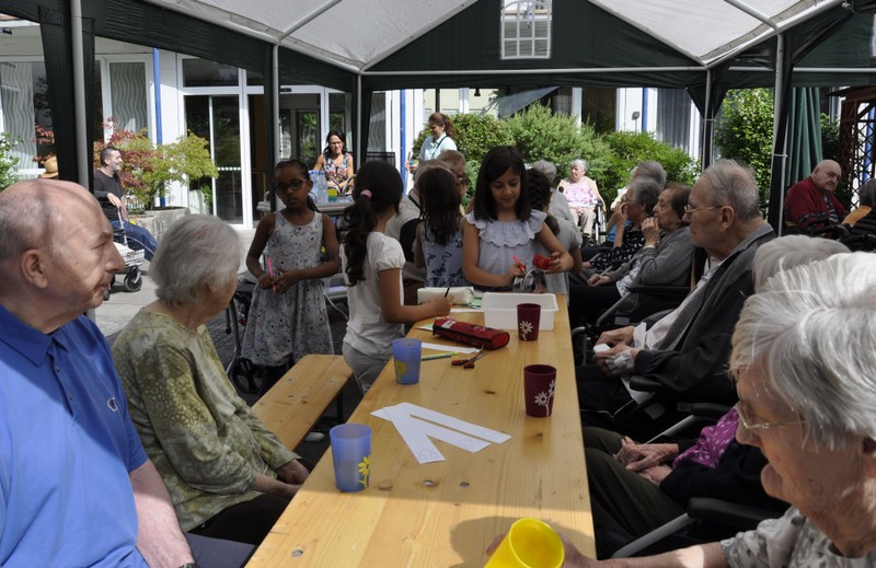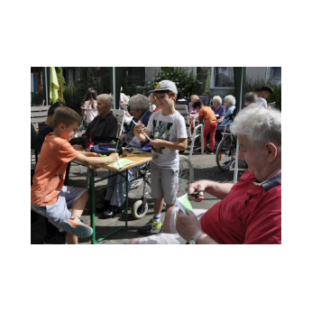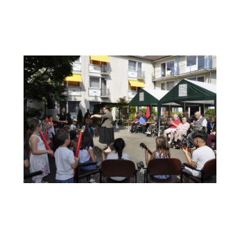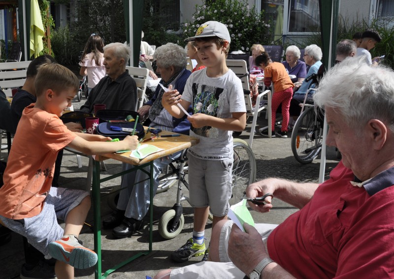 Bereits zum zweiten Mal machte sich die Ganztagsklasse 1c mit ihren Lehrerinnen Ende Juli auf, die Senioren und Seniorinnen im Friederike-Schäfer-Heim zu besuchen. Dieses Mal hatten die Erstklässler auch Ukulelen und Boomwhackers mit im Gepäck, mit denen die Kinder unter der musikalischen Leitung von Frau Thiergärtner zwei Sommerlieder sangen und begleiteten. Im Anschluss bastelten die Schüler und Schülerinnen gemeinsam mit den älteren Damen und Herren bunte Schnecken aus Papier. Heimbewohner, die lieber zusahen als selbst „Hand anzulegen“, bekamen natürlich eine oder mehrere von Schulkindern gebastelte Schnecken geschenkt. Viel zu schnell verging die gemeinsame Zeit! Bei einem kühlen Eis wurden gleich die nächsten Besuche geplant zusammen mit Frau Kraft, die die Idee für dieses für beide Seiten so schönes Projekt hatte.
