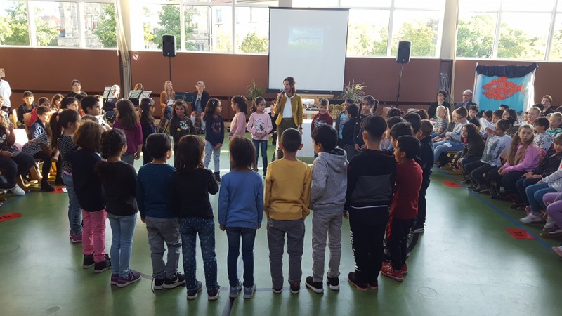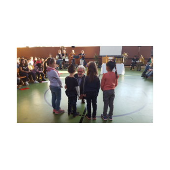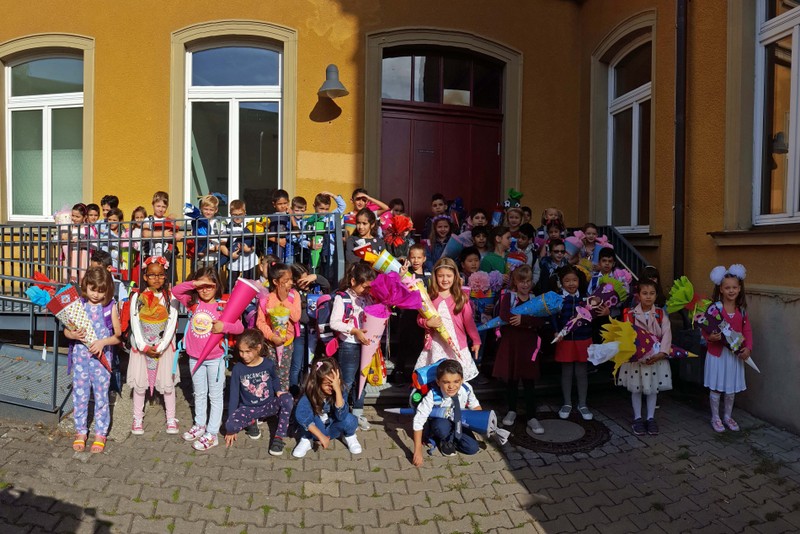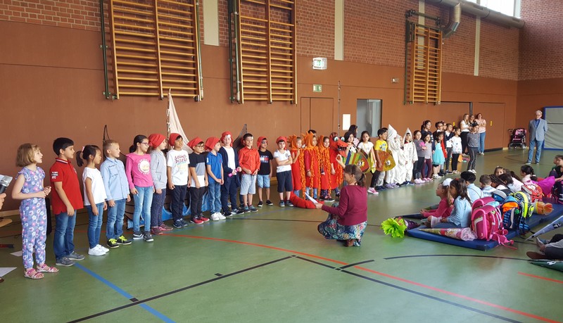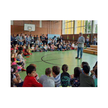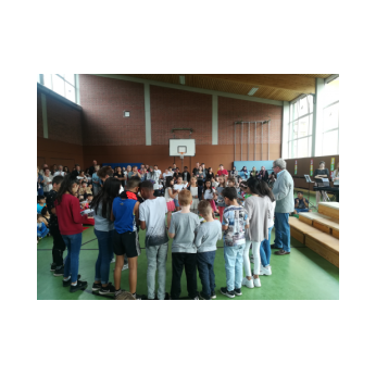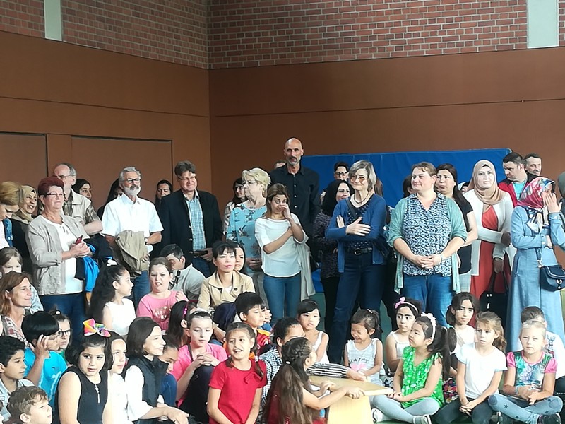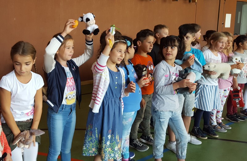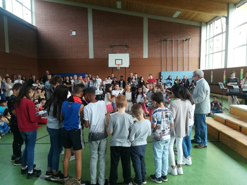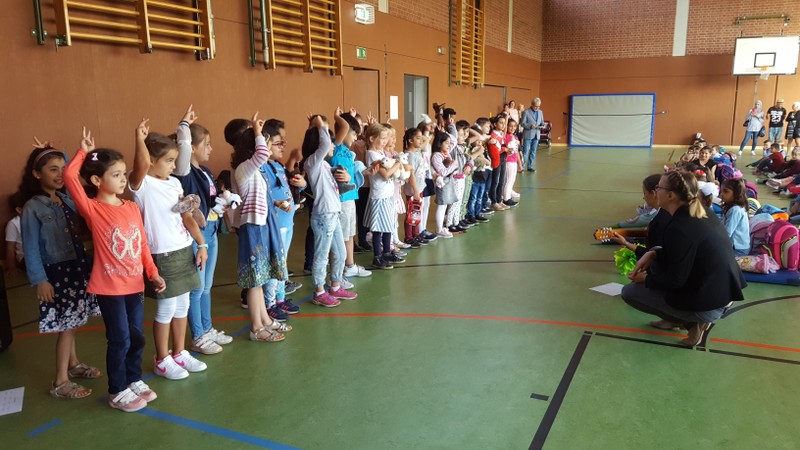 Zur gemeinsamen multireligiösen Anfangsfeier versammelte sich die ganze Schulfamilie in der Turnhalle. Schulleiter Herr Redolfi konnte alle Schüler und Lehrkräfte der Friedrich-Rückert-Schule sowie zahlreiche Eltern begrüßen. Anhand des Bilderbuches von Swimmy - vorgelesen von Viertklässlern - erfuhren die Kinder, wie wichtig es ist, dass alle zusammen halten und jeder in der Gemeinschaft an seinem Platz seine Aufgabe erfüllt. Anschließend wurden die Erstklässler namentlich in die Mitte gerufen und - begleitet von einem Segen oder einem guten Wunsch - in der Schulgemeinschaft begrüßt. Anschließend trugen Kinder aus verschiedenen Klassen kleine Bitten vor, bevor Herr Redolfi zum Abschluss besonders den Religionslehrerinnen Frau Cetinkaya, Frau Gobs-Knoche und Frau Kneuer für die Vorbereitung, dem Lehrerorchester für die gelungenen musikalische Untermalung und allen Lehrkräften und Kindern dankte, die zum Gelingen der Feier beigetragen hatten.