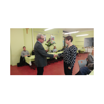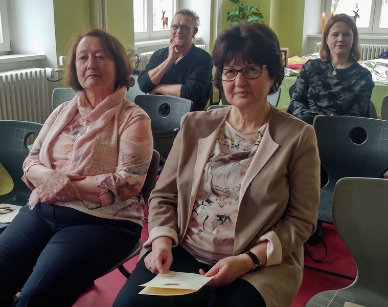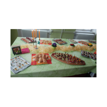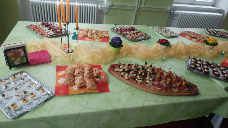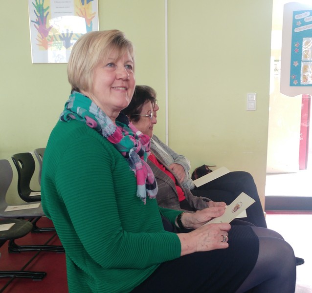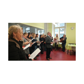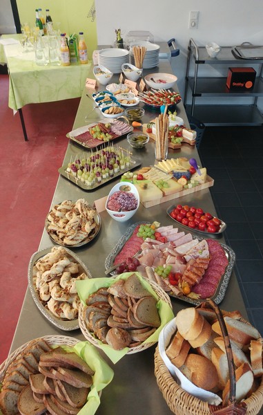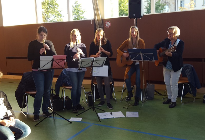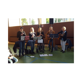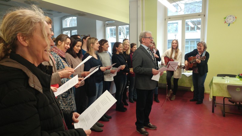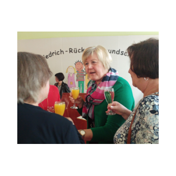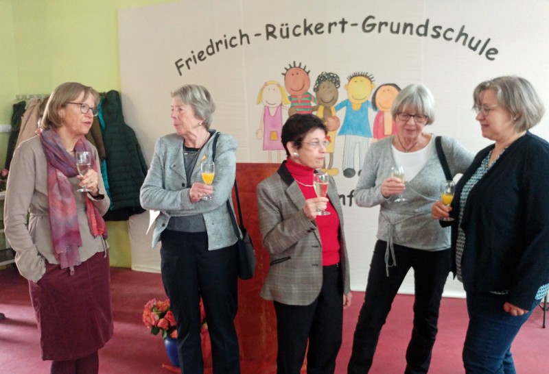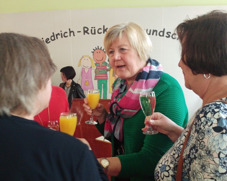 Tagsdarauf versammelte sich das Team der Friedrich-Rückert-Schule, Frau Bieler in ihrer Funktion als Vorsitzende des Elternbeirates und auch zahlreiche ehemalige Kolleginnen zu einer kleinen Feier im Speisesaal. Mit einem Medley - gesungen vom Lehrerchor und begleitet von Frau Freunek und Frau Full (beide Gitarre) und Frau Volkmuth an der Klarinette - bedankte sich das Rückertschul-Kollegium musikalisch bei Frau Reusing. Herr Redolfi fasste diesen musikalischen Dank anschließend noch einmal in Worte: „Neben Ihrer absoluten Zuverlässigkeit und Ihren Fachkenntnissen, die besonders im Umgang mit dem Schulverwaltungsprogramm auch von anderen Schulen immer wieder gern „in Anspruch genommen“ wurden, waren Sie stets von außerordentlicher Freundlichkeit und Hilfsbereitschaft gegenüber Schülern, Eltern und Kolleginnen, die Tag für Tag mit ihren Anliegen oder großen und kleinen Nöten im Sekretariat auftauchten.“ Daraufhin dankte auch Elternbeiratsvorsitzende Frau Bieler Frau Reusing für ihre wertvolle Arbeit und wünschte alles Gute für den Ruhestand. Mit einen lachenden und einem weinendem Auge verabschiedete sich Frau Reusing anschließend bei der Schulleitung, dem Team und beim Hausmeister Herrn Wüst für die gute Zusammenarbeit, bei den „Ehemaligen" für ihr Kommen und wünschte Ihrer Nachfolgerin Frau D’Angelo alles Gute! „Danke – für die schöne Zeit, über die kann man ja alles sagen: anstrengend, turbulent, stressig, fröhlich, traurig, erfüllend – aber eines war sie nie: langweilig." Bei einen Stehempfang mit leckerem Buffet klang die kleine Feier bei angeregten Gesprächen aus.