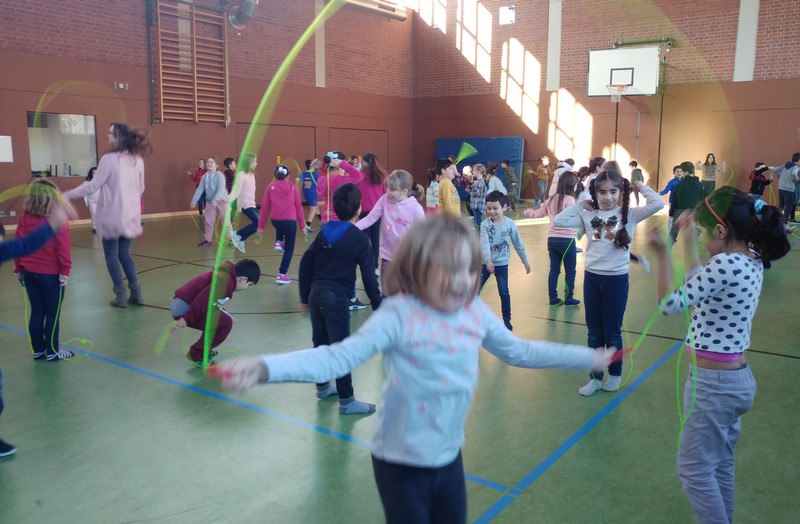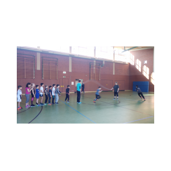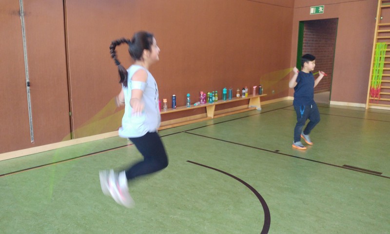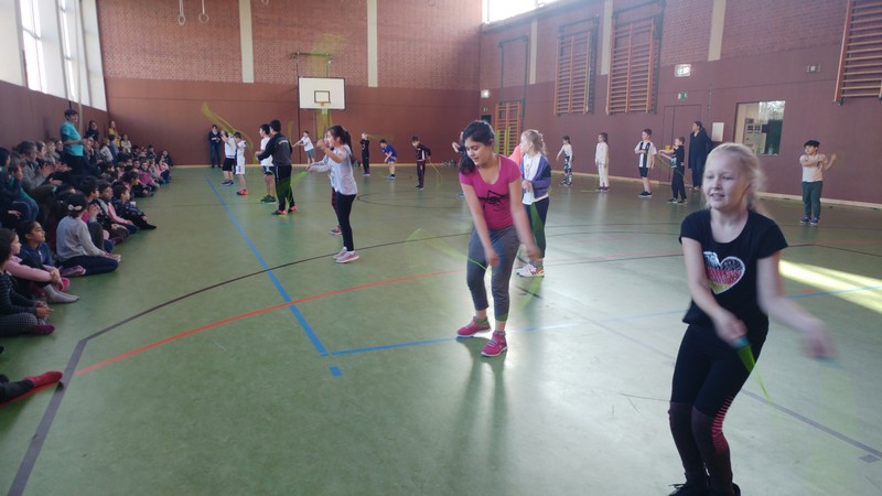 Wie bringt man Kinder dazu, etwas Gutes für ihr Herz-Kreislauf-System zu tun? Skipping Hearts - mit dem Präventivprojekt der Hüpfende Herzen möchte die Deutsche Herzstiftung unter dem Motto „mit kleinen Sprüngen viel erreichen“ Kinder motivieren, sich mehr zu bewegen und sich mit ihrem Herz und ihrer Gesundheit auseinanderzusetzen. Dabei wird Kindern an Grundschulen die sportliche Form des Seilspringens, Rope Skipping, vermittelt. Die Klassen 4a und 4b durften beim Basiskurs ihre Geschicklichkeit und Ausdauer in einem eineinhalbstündigen Training unter der Leitung von Workshopleiterin Frau Astrid Hess ausprobieren und eine kleine Performance einstudieren, die anschließend anderen Klassen und einigen Eltern stolz präsentiert wurden. Danach durften alle Anwesenden die Seile schwingen - und hatten jede Menge Spaß dabei!