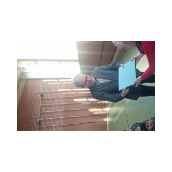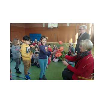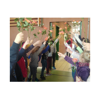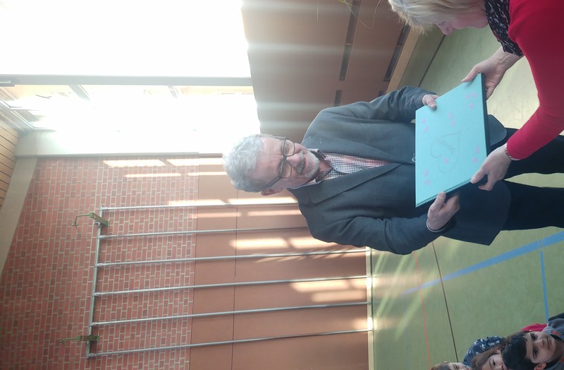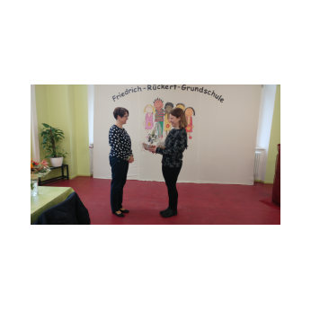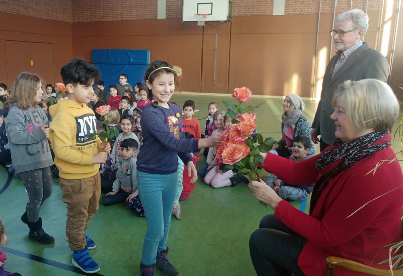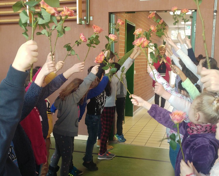 Ein Rosenspalier am Eingang der Turnhalle, alle Kinder und Lehrkräfte der Friedrich-Rückert-Schule versammelt in einem großen Kreis und mittendrin ein noch leerer Ehrenplatz. Die Aufregung war deutlich zu spüren, dann war es endlich soweit! An ihrem letzten Arbeitstag verabschiedete die Schulfamilie der Friedrich-Rückert-Schule gemeinsam „ihre“ langjährige Sekretärin Frau Gabi Reusing in den wohlverdienten Ruhestand. Begleitet von Herrn Redolfi durfte Frau Reusing durch ein Spalier von dreißig rosa Rosen schreiten: „11 für jeder unserer Klassen und 19 für die neunzehn Jahre, die Sie als Frau für alle Fälle stets freundlich und mit viel Herzblut ihre verantwortungsvollen Aufgaben als Sekretärin ausführte, wie Schulleiter Günther Leo Redolfi in seiner Ansprache betonte. Danach fragten sich die Schulkinder - wie immer virtuos begleitet von unserer Lehrerband - auf die Melodie von Die Affen rasen durch den Wald, wie es nun ohne die beliebte und langjährige Sekretärin weitergehen soll: Wo ist Frau Reusing hin? Wo ist Frau Reusing hin? Ja, wer hilft uns jetzt denn nur? Mit dem bekannten Abschiedslied „Ich wünsch dir einen Regenbogen" brachten danach Kinder aus verschiedenen Klassen Frau Reusing zum Lied passende kleine Geschenke. Zum Schluss überreichte Herr Redolfi noch ein ganz besonderes Präsent, an dem alle Schüler und Schülerinnen fleißig mitgeschrieben haben: Ein selbstgebasteltes Buch, dass auf charmante Weise beschreibt, was unter anderem die Aufgaben einer Sekretärin sind, was Herr Redolfi jetzt ohne Frau Reusing macht oder wie Frau Reusing in Zukunft ohne unsere Schule ihre Zeit verbringt.