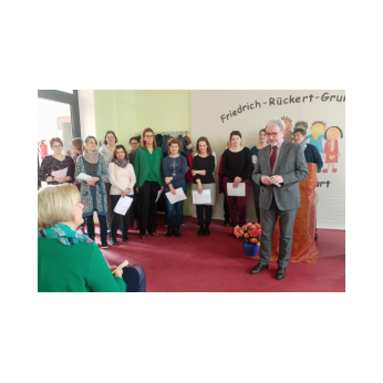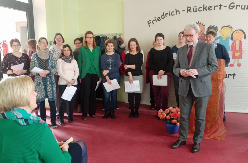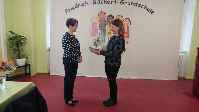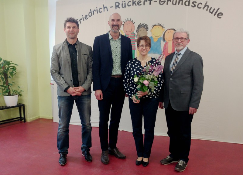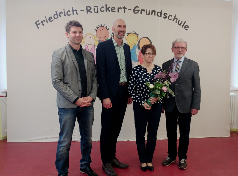 Im Rahmen einer kleinen Feierstunde wurde Frau Tanja Kärpf von Herrn Karl-Heinz Deublein vom Staatlichen Schulamt in ihr neues Amt als Konrektorin an der Friedrich-Rückert-Grundschule Schweinfurt eingeführt. Dabei zeigte Herr Deublein, der selbst erst seit Januar als Rektor in der Schulaufsicht tätig ist, bei seiner kurzweiligen Rede zahlreiche Parallelen auf zwischen der Vita der frischgebackenen Konrektorin und seinem eigenen Werdegang. Schulleiter Günther Leo Redolfi stellte in seiner sich anschließenden Laudatio das große Engagement, das Frau Konrektorin Kärpf bei ihrer Tätigkeit als Lehrerin und seit Beginn des Schuljahres 2017/18 besonders auch als stellvertretende Schulleiterin zeigte, heraus. Besonders lobte der Schulleiter ihre Bereitschaft, Verantwortung in der Schulleitung zu übernehmen. Kurze Großworte sprachen anschließend Herr Rektor Tomi Neckov in seiner Funktion als Vorsitzender des Personalrates für die Volksschulen in der Stadt Schweinfurt und Frau Sandra Bieler vom Elternbeirat. Sie gratulierten zur neuen Aufgabe und wünschten eine glückliche Hand. In ihrer knappen, aber launigen Rede bedankte sich Frau Tanja Kärpf bei den Gratulanten für die zahlreichen Glückwünsche und besonders bei Herrn Redolfi für seine Unterstützung beim Hineinwachsen in dieses verantwortungsvolle Amt. Dem Team galt ebenfalls ein herzliches Dankeschön dafür, dass die neue Aufgabe nichts an dem guten Verhältnis zum Kollegium geändert habe. Dies verdeutlichte auch der umgedichtete Liedbeitrag des Lehrerchors Heute kann es regnen, stürmen oder schnei’n, in dem das Kollegium der Friedrich-Rückert-Schule, instrumentell begleitet von Frau Freunek, Frau Full (beide Gitarre) und Frau Volkmuth (Klarinette), seine Freude ausdrückte und tatkräftige Unterstützung zusicherte. Mit einem umfangreichen Buffet klang die Amtseinführung am Freitagnachmittag aus.