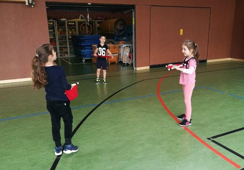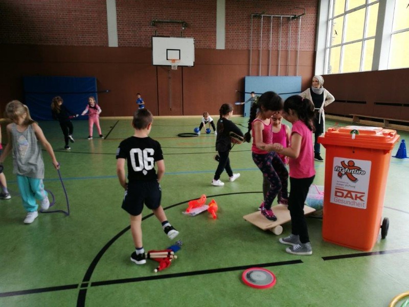 Fit4future ist eine Initiative der Cleven-Stiftung für gesunde Schulen, powered by DAK. Im Rahmen dieser Präventionsinitiative soll das gesundheitsfördernde Verhalten der Schüler unterstützt werden. „Ernährung“, „Bewegung“ und „Brainfitness“ sind einige Bausteine dieser Aktion, aber auch die Lehrergesundheit spielt eine wichtige Rolle. Frau Ums und Frau Kärpf, als „Coaches“ dieser Aktion, besuchen verschiedene Workshops und vermitteln die Inhalte dann an unserer Schule. Die Spielgeräte in unserer orangen „fit4future-Tonne“ begeistern die Schüler im Sportunterricht ebenso wie in der großen Mittagspause.