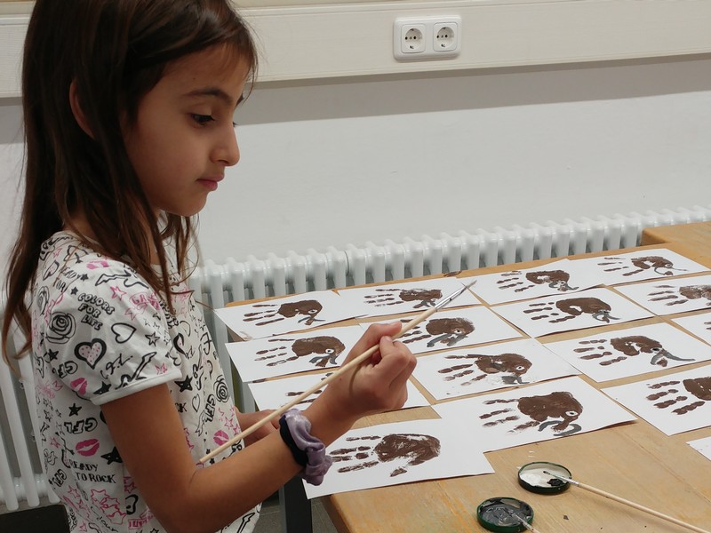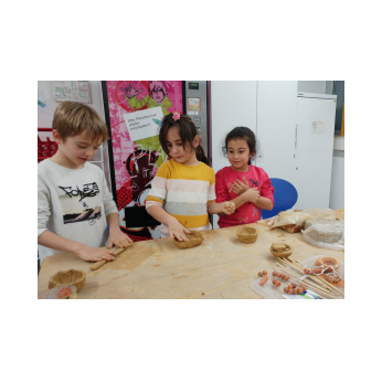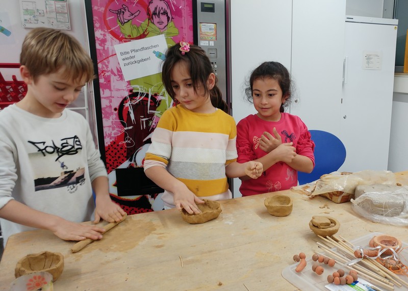 Steinzeitmann Heyo nahm die Ganztagsklasse 2c und ihre Lehrerinnen Frau Sanli und Frau Merkl mit in seine „medienfreie“ Welt! Im Schullandheim Karl-Beck-Haus in Reichmannshausen vertieften die kleinen Nachwuchs-Steinzeitkinder mit Hilfe von Karteikarten ihr Wissen über die Steinzeit und erstellten ihr eigenes Steinzeitbuch. Doch auch die Praxis kam nicht zu kurz! So durfte jeder ausprobieren, wie anstrengend es ist, Getreide von Hand zu mahlen oder ein „Steinzeit-Handy“ aus Holzbrettchen herzustellen. Aus Ton schufen die kleinen Künstler Ketten und Tonschälchen und bemalten Steine wie die berühmten Vorbilder der Höhlenmalereien. Gut ausgerüstet ging es schließlich auf große Mammutjagd. Heyos Hinweise führten uns zum Ziel – das Mammut wurde besiegt! Beim Essen und in der Freizeit ging’s deutlich moderner zu! Frau Hümpfer und ihr Team versorgten uns mit köstlichem Essen und allem, was wir sonst noch benötigten. Dafür ein herzliches Dankeschön!