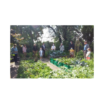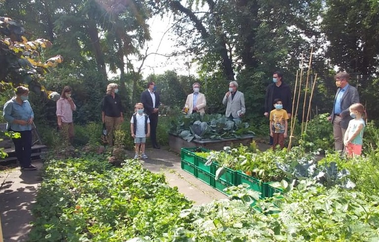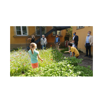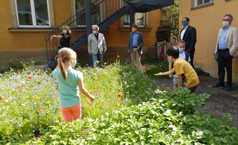 Bunte Blumensträuße, frisch gepflückt von der neu angelegten Schmetterlingswiese überreichten einige Schüler und Schülerinnen im Juni den Gästen der Friedrich-Rückert-Schule. Gekommen waren Werner Bonengel und Ralf Hofmann als Vertreter der Oskar-Soldmann-Stiftung, Schulreferent Jürgen Montag und Matthias Kress von der Stabsststelle „gern daheim“, um im wahrsten Sinne des Wortes die „Früchte“ ihrer Unterstützung zu bewundern. Neben der Blumenwiese präsentierte Angela Merz, die das Projekt vorgeschlagen hatte, den interessierten Gästen neugepflanzte Beerensträucher, Gemüse und Kräuterkisten und einen kleinen Kartoffelacker. Mit dem Urban-Gardening-Konzept wird den Kindern der Friedrich-Rückert-Schule hautnahes Erleben der Natur mit allen Sinnen ermöglicht. „Außerdem dienen die verschiedenen Obst- und Gemüsesorten gleich als echtes Anschauungsobjekt für den Heimat- und Sachunterricht!“, ergänzte Schulleiter Günther Redolfi. Ziel sei es, dass nach der Schulschließung nun alle Kinder die grüne Oase genießen können und im neuen Schuljahr auch die Eltern an diesem Projekt teilhaben dürfen, beispielsweise mit Sämereien aus ihren Herkunftsländern.