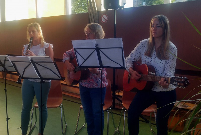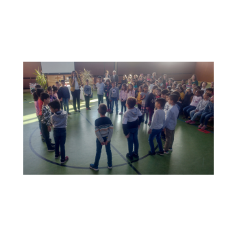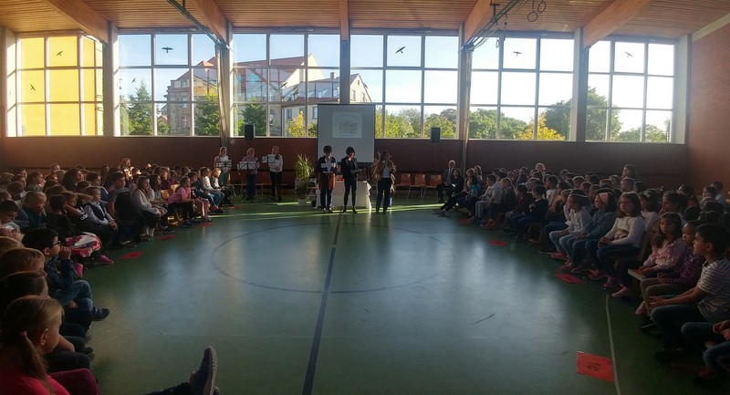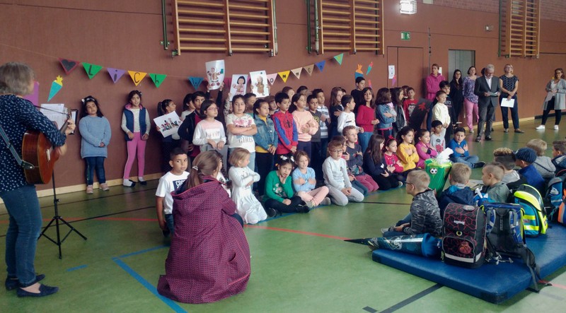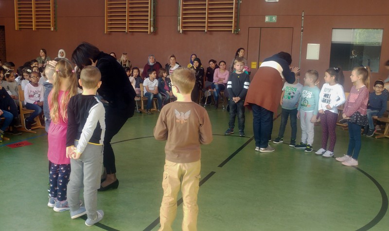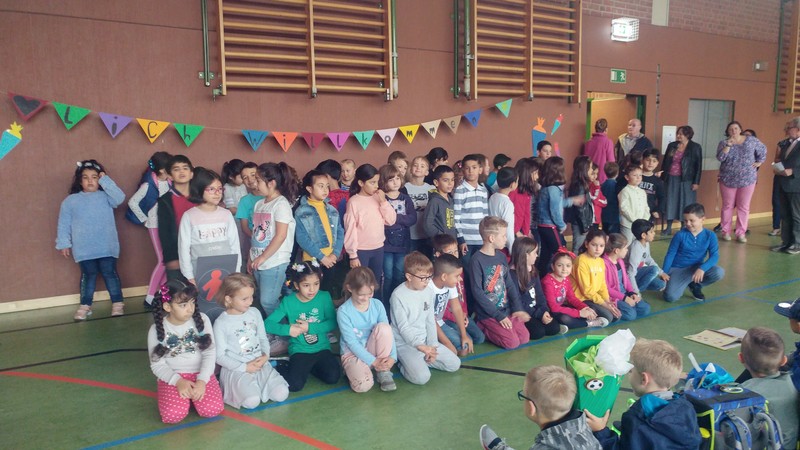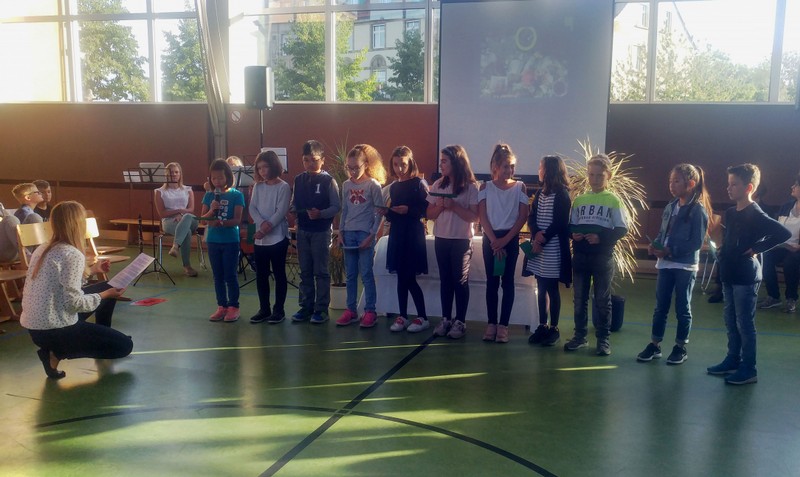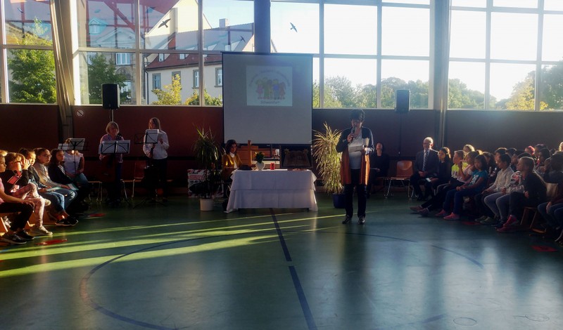Zur gemeinsamen multireligiösen Anfangsfeier versammelte sich die ganze Schulfamilie in der Turnhalle. Schulleiter Herr Redolfi konnte alle Schüler und Lehrkräfte der Friedrich-Rückert-Schule sowie einige Eltern und Freunde der Friedrich-Rückert-Schule begrüßen. Die Geschichte von der Sonnenblume und dem Spatz - vorgelesen von Schülern der Klassen 4a und 4b - erzählte sehr anschaulich von einer ganz besonderen Freundschaft zwischen zwei ganz unterschiedlichen Lebewesen. Anschließend wurden die Erstklässler in die Mitte gerufen und - begleitet von einem Segen oder einem guten Wunsch - in der Schulgemeinschaft begrüßt. Danach trugen Kinder aus verschiedenen Klassen kleine Bitten vor, bevor Herr Redolfi zum Abschluss besonders den Religionslehrerinnen Frau Cetinkaya, Frau Gobs-Knoche und Frau Kneuer für die Vorbereitung, dem Lehrerorchester für die gelungenen musikalische Untermalung und allen Lehrkräften und Kindern dankte, die mit dieser besonderen Feier wieder einmal gezeigt haben, das Lernen und Feiern auch über verschiedene Kulturen und Religionen hinweg möglich ist.