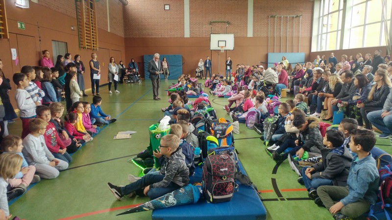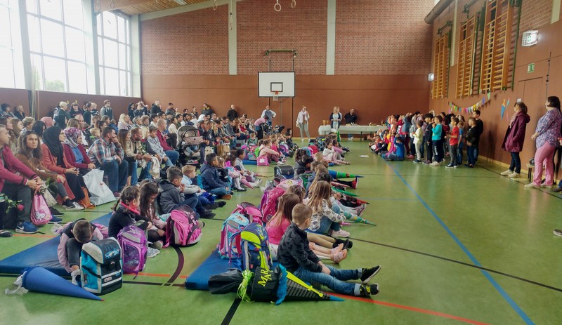 Gegen 9:00 Uhr versammelten sich viele aufgeregte Schulanfänger mit ihren Familien in der Turnhalle der Friedrich-Rückert-Schule. Ausgestattet mit den neuen Schultaschen und schwer beladen mit großen Schultüten erwarteten sie ihren ersten Schultag. Willkommen geheißen wurden sie dann von allen Zweitklässlern mit dem Klassiker "Alle Kinder lernen lesen" und dem „Lied vom Ampelmännchen“. Schulleiter Herr Redolfi begrüßte die ABC-Schützen und ihre Eltern ganz herzlich und wünschte ihnen einen schönen ersten Schultag. Anschließend gingen die drei neuen ersten Klassen mit ihren Lehrerinnen in ihre Klassenzimmer zu ihrer ersten richtigen Unterrichtsstunde, während Herr Redolfi die Eltern mit weiteren wichtigen Informationen versorgte. Der Elternbeirat bot Kaffee und Kuchen an, so dass auch für die Eltern die Zeit wie im Flug verging. Bereits gegen 11:00 Uhr konnten die Eltern ihre frischgebackenen Erstklässler wieder in ihren Klassenzimmern abholen und einige Erinnerungsfotos schießen.
