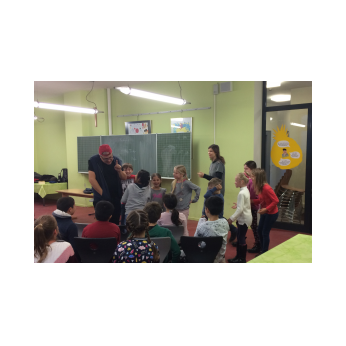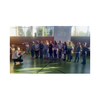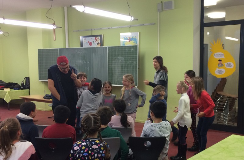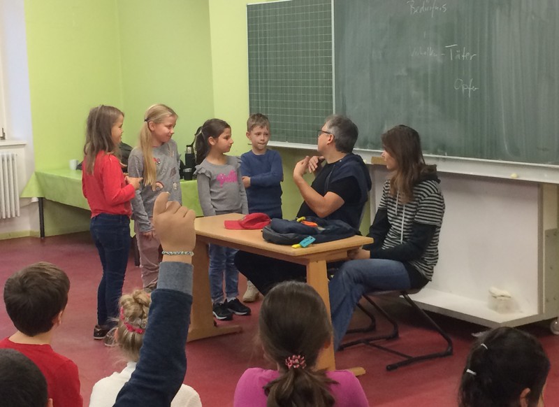 Im Rahmen der Vorführung „Respect me, respect you“ am 12.11.2019 wurden den Schülern der 3. und 4. Jgst. die Themenbereiche Mobbing (auch Cybermobbing) sowie sexuelle Belästigung im Internet nähergebracht und Handlungsmöglichkeiten aufgezeigt. Dem Theaterpädagogen Dirk Bayer und seiner Kollegin gelang es gut, die Schülerinnen und Schüler durch ein interaktives Theater für das Thema zu sensibilisieren und zum Nachdenken anzuregen. Die Kinder waren gefordert, sich konkret Lösungen für verschiedene Konfliktsituationen zu überlegen und sie durch eigenes Mitwirken zu erproben. Dass es gar nicht so leichtfällt, respektvolles Verhalten wirksam einzufordern, wurde in den Rollenspielen sehr deutlich. In den meisten Situationen hatten die mutigen Laiendarsteller Probleme, gegen Dirk Bayer, der in der Täterrolle als mobbender Schüler am laufenden Band Mitschüler provozierte, und beleidigte, anzukommen. Nach kurzen Spielszenen folgte jeweils eine Phase, in welcher der Theaterpädagoge zusammen mit unseren Schülerinnen und Schülern die dargestellten verbalen Provokationen analysierte und klarmachte, welche Bedürfnisse des Täters eigentlich dahinterstecken. Auch der Einfluss fragwürdiger medialer Vorbilder aus Doku-Soaps kam zur Sprache. Denn gerade in solchen TV-Formaten passiere nichts Anderes, als dass sich die Beteiligten in Täter-Opfer-Beziehungen gegenseitig fertigmachen, so Dirk Bayer. Folgende Chat Regeln wurden gemeinsam erarbeitet