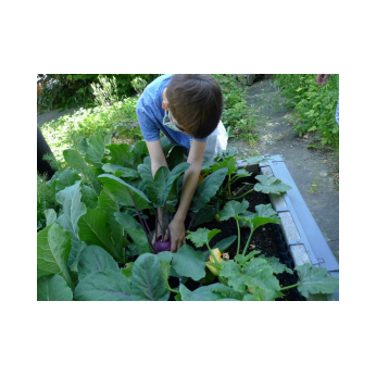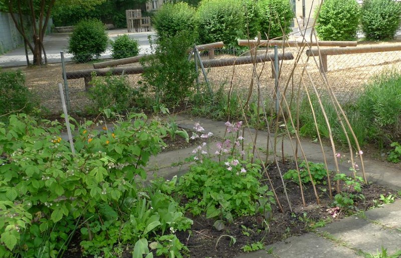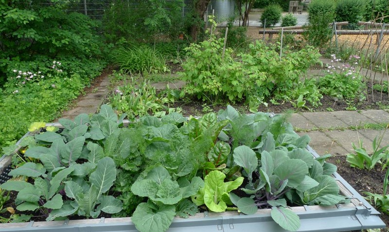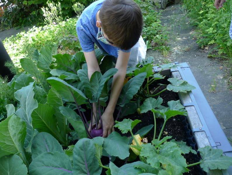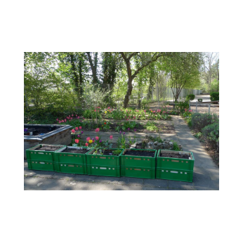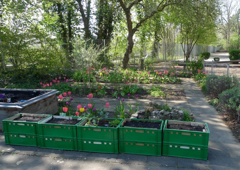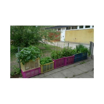 Die Bäckerkisten wurden gemäß dem Urban-Gardening-Konzept befüllt. 10 Kisten spendete dankenswerterweise Frau Freunek. Im April wurden die Kisten mit Getreide, Radieschen, Karotten, Erbsen, Kräutern, Kartoffeln, Ruccola, Kohlrabi, Kapuzinerkresse, Tomaten, Paprika und vielem mehr bepflanzt. Im Hochbeet wachsen mittlerweile Weißkraut, Rotkraut, Sellerie, Lauch, Wirsing, Blumenkohl und Fenchel. In den Beeten blühen die ersten Erdbeeren. Die Kräuterschnecke wurde neu bepflanzt und in die Beete Kräuter, Erbsen und eine Andenbeere gesät. Am Zaun entlang wurde die Erde aufgelockert und Kartoffeln in die Erde gesetzt. Zu den schon bestehenden Beerenpflanzen kamen neue hinzu.