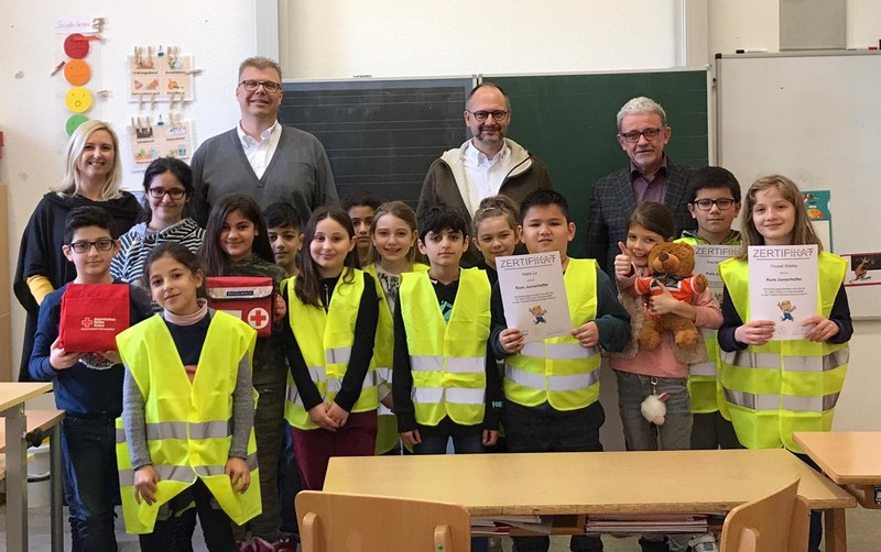 Fünfzehn Schülerinnen und Schüler aus der Ganztagsklasse 3c wurden von Frau Sabrina Neckov zu Schulsanitätern ausgebildet. Nach einem halben Jahr Unterricht gaben jetzt BRK-Kreisgeschäftsführer Thomas Lindörfer und Ausbildungsleiter Holger Brätz den Startschuss zum ersten Schulsanitätsdienst an unserer Schule. Im Gepäck hatten sie zwei Einsatztaschen, Einsatzwesten und einen Teddybären als Maskottchen und zur Beruhigung der jungen Patienten. Im Rahmen einer kleinen Feierstunde wurden den frischgebackenen Schulsanitäter die Ernennungsurkunden übergeben. BRK-Kreisgeschäftsführer Thomas Lindörfer bedankte sich bei Frau Neckov, der Schulleitung und vor allem bei den Schülerinnen und Schülern für ihr großes Engagement. Sie werden sich jetzt vor allem in den Schulpausen um ihre Mitschüler kümmern, wenn Erste Hilfe benötigt wird. Auch Schulleiter Günther Leo Redolfi gratulierte den Schülerinnen und Schülern und machte deutlich, dass die Schulsanitäter große Vorbilder für ihre Mitschüler sind. Schulsanitätsdienst bringt das "Abenteuer Menschlichkeit" in die Schule. Schüler lernen zu helfen. Helfen bedeutet, die eigene Betroffenheit in richtiger Weise für den Mitmenschen verantwortlich handelnd umzusetzen.