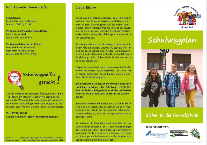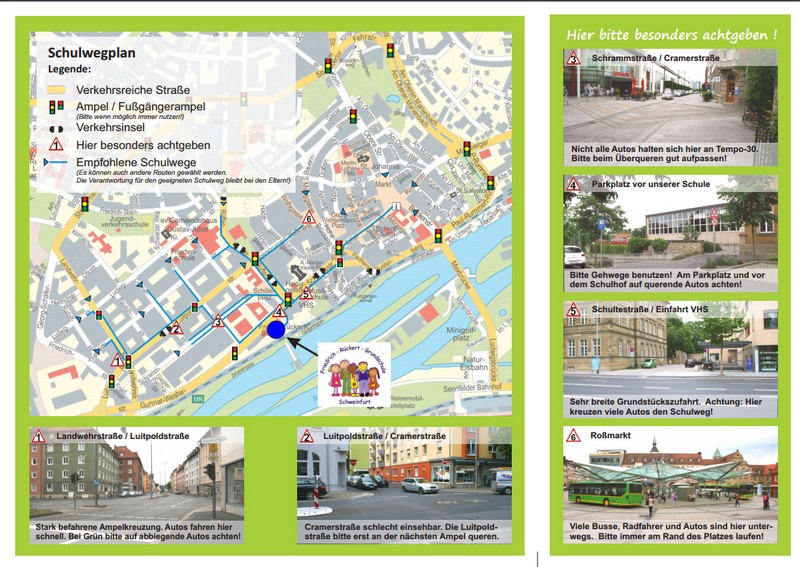 Am Dienstag beginnt für die rund 200 Schüler und Schülerinnen der Friedich-Rückert-Grundschule das neue Schuljahr. Ein guter Zeitpunkt sich Gedanken über den sicheren Schulweg zu machen - nicht nur für die ABC-Schützen! Der Schulwegplan wurde extra für unsere Schule erstellt, um Eltern eine Hilfe zu sein, einen sicheren Weg für ihr Kind zu finden. Er weist auf kritische Stellen der Schulumgebung hin und gibt Empfehlungen für einen sicheren Schulweg. (mehr)