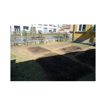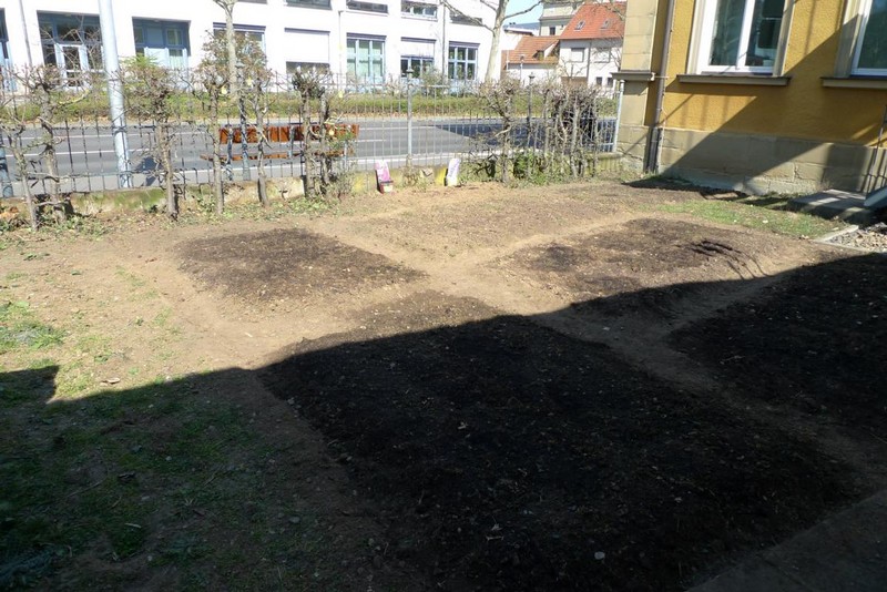 Unser neues Schulgartenprojekt begann im Januar 2020 mit der Gartenplanung. Im Februar wurde das Konzept für das Vorhaben von der Verantwortlichen Frau Merz in der Lehrerkonferenz vorgestellt. Alle Klassenleiterinnen übernahmen kleine Aufgaben (z.B. Kohlrabi anpflanzen...), die ihre Schülerinnen und Schüler später ausführen sollten. Danach besorgte Frau Merz Gartenmaterialien (Harken, Gartenscheren etc.), Sämereien, winterharte Kletterpflanzen, Beerensträucher, Vogelfutter, Terra Magica (Erde mit Holzkohle und effektiven Mikroorganismen), Kompost aus Schweinfurt und Hornspäne zum Düngen. Leider kam dann das Coronavirus dazwischen und die Arbeiten im März und April mussten (fast) ohne Kinder erledigt werden. Ein Kind der Notgruppe durfte anfangs noch mithelfen, die Kletterpflanzen am großen Tor im Schulgarten zu setzen. Das Gelände hinter den Abfallbehältern war das nächste und arbeitsintensivste Projekt. Hier entstanden unter großen Mühen, Schweiß und Blasen an den Händen Blumenbeete. Die vielen Steine wurden abgelesen und der „beinharte“ Boden bearbeitet. Bald werden die ersten Blumen blühen. Zudem wurden in einem Beet Kartoffeln gepflanzt. An der Hecke am Zaun wachsen zwei Schmetterlingssträucher, bald werden dort auch viele Sonnenblumen aufgehen.