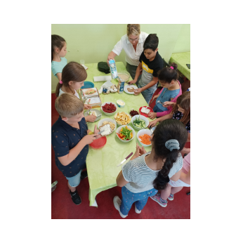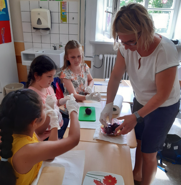 Seit diesem Schuljahr sollen alle Grundschüler einmal in ihrer Grundschulzeit an einer Projektwoche zur Schulung der Alltagkompetenzen teilnehmen. Den Anfang machten dieses Jahr die dritten Klassen mit einer Projektwoche rund um den Bauernhof. Bei einem Besuch in der Umweltstation Reichelshof erhielten die Kinder im Rahmen des Projekts "Vom Korn zum Brot" viele anschauliche Informationen: Welche Getreidesorten wachsen bei uns? Welche Maschinen helfen bei der Ernte? Anschließend durften die Schüler und Schülerinnen sich selbst einen Pfannkuchen zubereiten - und natürlich auch mit Aufstrich nach Wahl verspeisen! Daneben blieb auch noch Zeit die zahlreichen Tiere zu besuchen. Außerdem besuchten die dritten Klassen ein Erdbeerfeld in Röthlein, wobei sie auch den Betrieb kennenlernen und selbstgemachtes Erdbeereis probieren durften. Die Ernärhungsberaterin Frau Laborde kam an drei Tagen an die Friedrich-Rückert-Grundschule. Neben viel frischen Obst und Gemüse hatte sie auch viel Wissenswertes rund um die gesunde Ernährung im Gepäck. Ihr neu erworbenes Wissen durften die Kinder anschließend gleich bei der Zubereitung von Pausenbroten in die Tat umsetzten. Dabei entstanden wahre Kunstwerke, die natürlich auch gleich aufgegessen wurden. Die Kosten für den Ernährungsführerschein übernahm die Barmer Krankenkasse. Dafür ein herzliches Dankeschön!