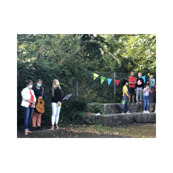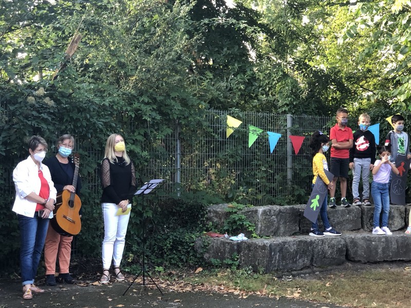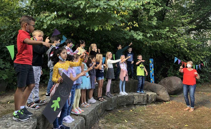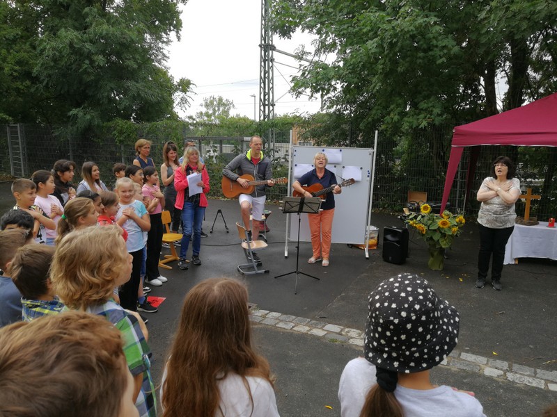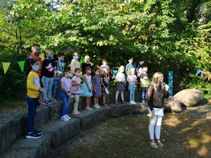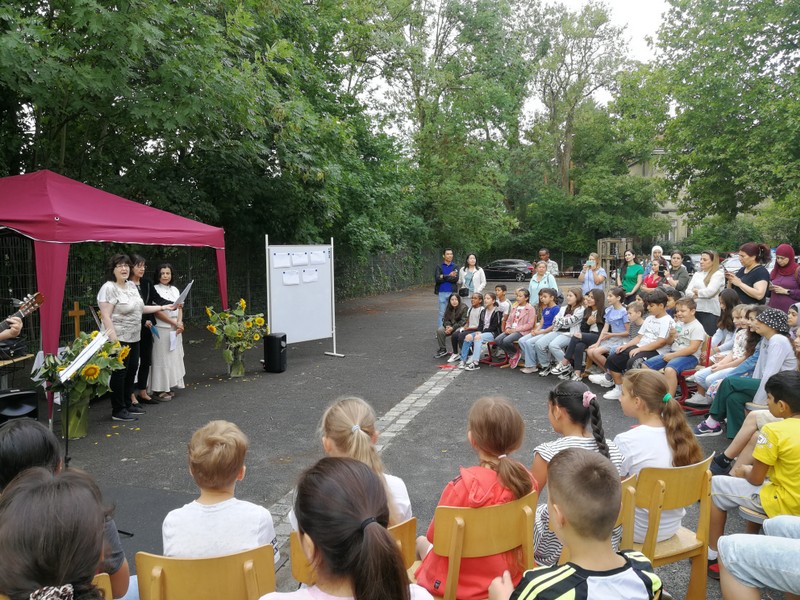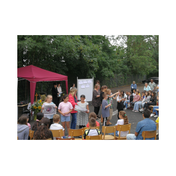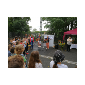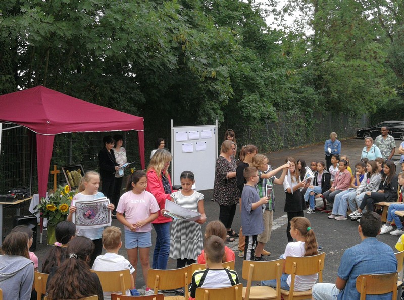 Bei sehr sommerlichen Temperaturen versammelten sich alle Klassen am letzten Montag im Schatten der Bäume, um in einer kleinen Feier Danke zu sagen und sich in die Ferien zu verabschieden. Das Vorbereitungsteam - Frau Gobs-Knoche, Frau Kneuer und Frau Cetinkaya - hatten einen großen Koffer voller guter Ideen dabei: z. B. Unospielen, in der Natur Tiere und Pflanzen beobachten... Musikalisch begleitet wurden die Lieder von Frau Freunek und Herrn Helbig. Ein herzliches Dankeschön für die Vorbereitung!