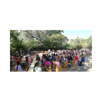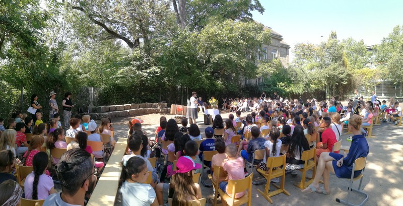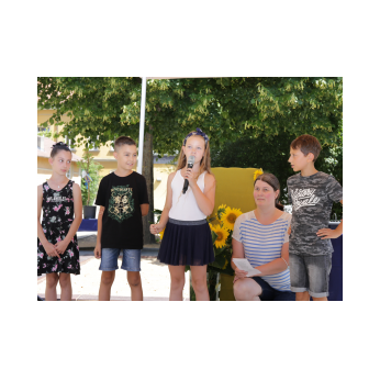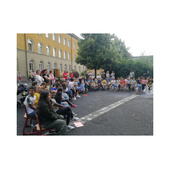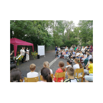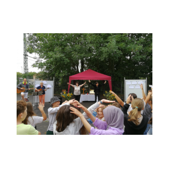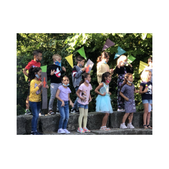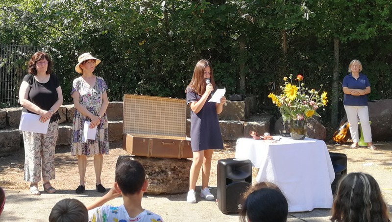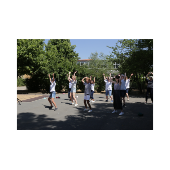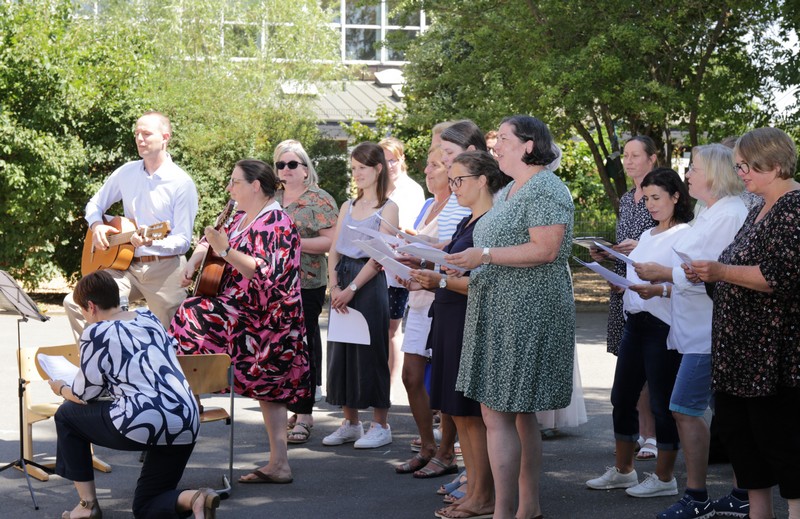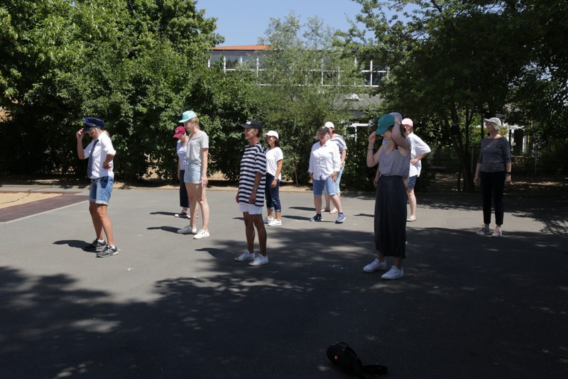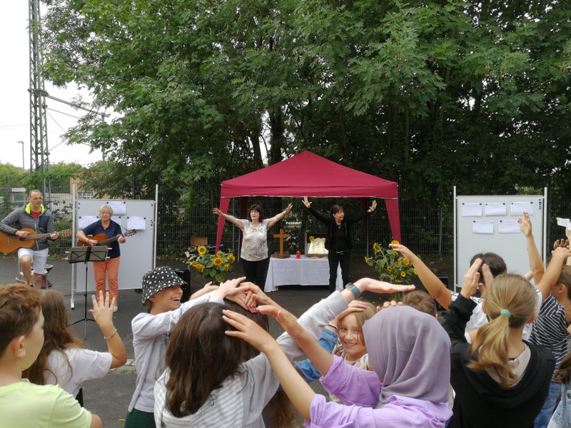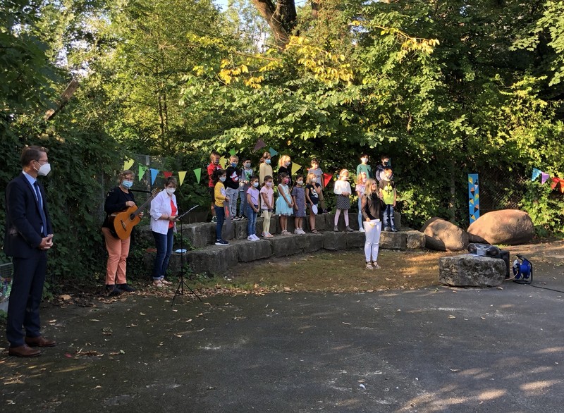 Bei sehr sommerlichen Temperaturen versammelten sich alle Klassen am letzten Montag im Schatten der Bäume, um in einer kleinen Feier Danke zu sagen und sich in die Ferien zu verabschieden. Das Vorbereitungsteam - Frau Gobs-Knoche, Frau Kneuer und Frau Cetinkaya - hatten einen großen Koffer voller guter Ideen dabei: z. B. Unospielen, in der Natur Tiere und Pflanzen beobachten... Musikalisch begleitet wurden die Lieder von Frau Freunek und Herrn Helbig. Ein herzliches Dankeschön für die Vorbereitung!