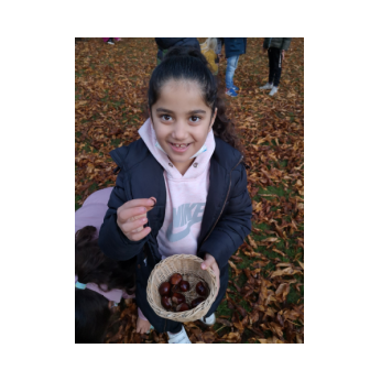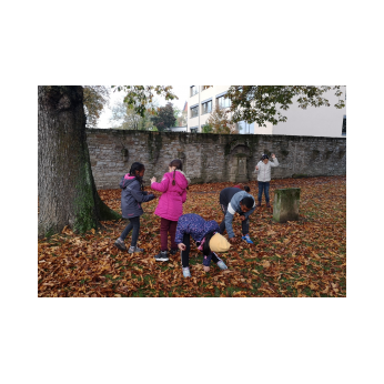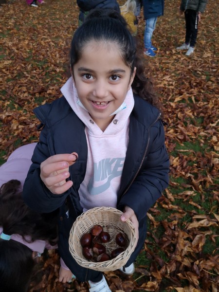 Strahlendes Herbstwetter, glänzende Kastanien - da gibt es nur eines: Hinaus in die Natur und ran an die Kastanien! In Windeseile und mit viel Freude füllten die Kinder der Ganztagsklasse 2b ihre Körbe.