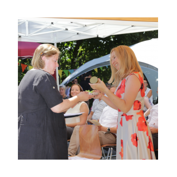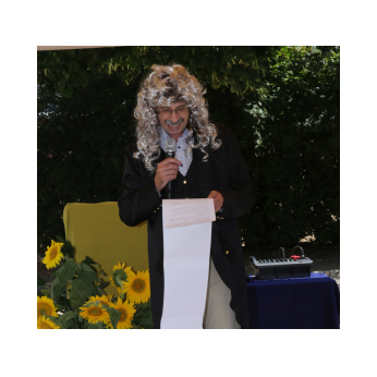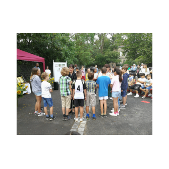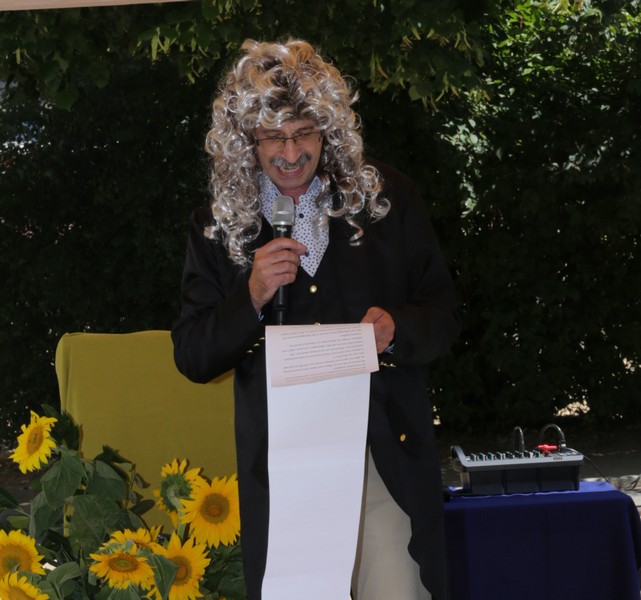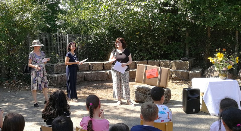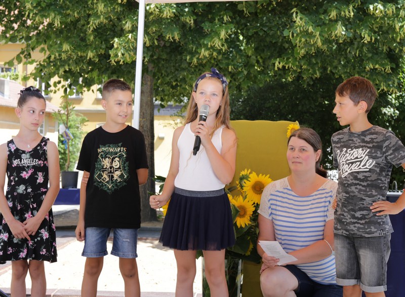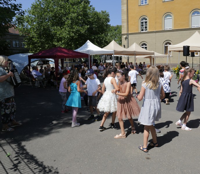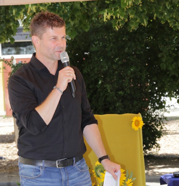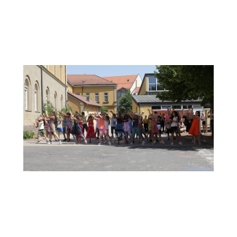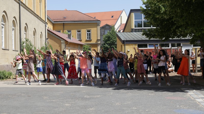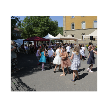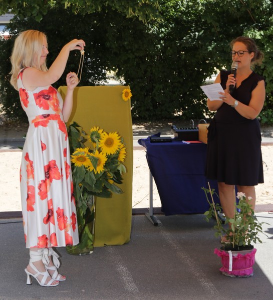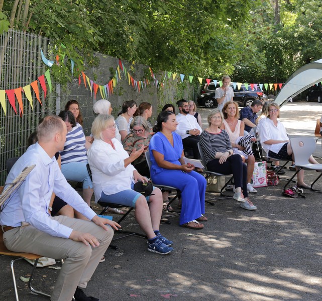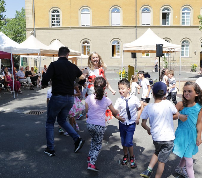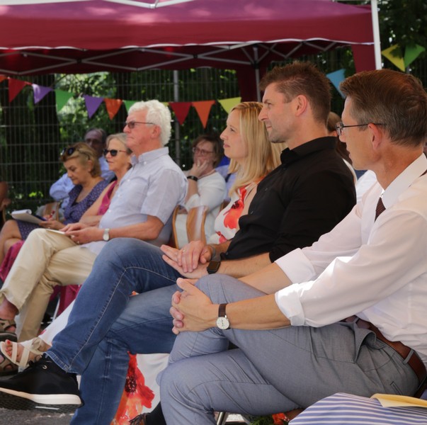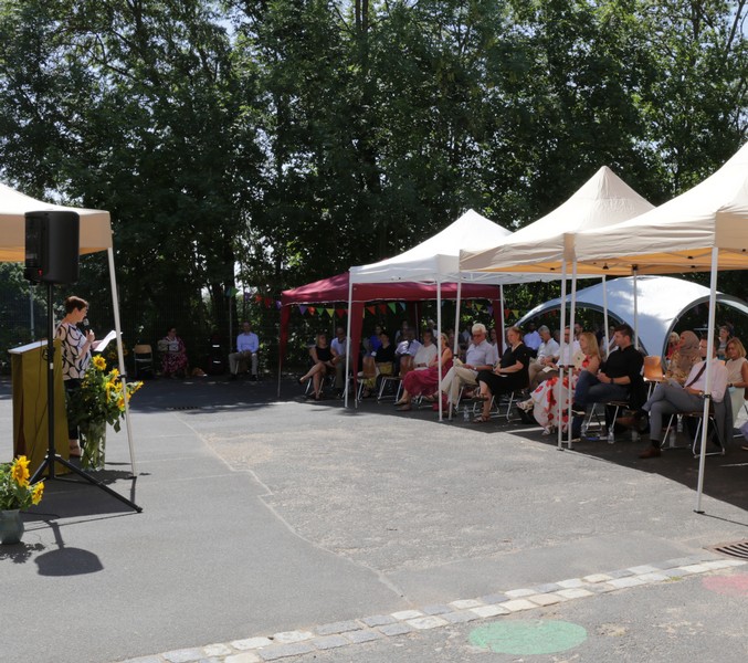 Bei sommerlichen Temperaturen fanden sich zahlreiche Gäste im Hof der Friedrich-Rückert-Grundschule ein, um nun auch offiziell die Amtseinführung von Frau Sabrina Neckov als neue Schulleiterin nachzuholen. Nach der Begrüßung durch Konrektorin Tanja Kärpf überbrachte Oberbürgermeister Sebastian Remelé ein Grußwort als Vertreter der Stadt Schweinfurt. Schulamtsdirektorin Stefanie Schiffer gab einen Überblick über den Werdegang der neuen Rektorin und Tomi Neckov sprach einige Worte in seiner Funktion als Vorsitzender des Personalrates. Einen ganz besonderen Festredner schickten die Schulleiterinnen und Schulleiter der Schweinfurter Grundschulen: Friedrich Rückert persönlich wünschte der neuen Chefin „seiner Immobilie“ – nach einigen kritischen Anmerkungen in Richtung Stadt und Politik - alles Gute für ihr neues Amt. Auch der Elternbeirat und das Kollegium schlossen sich den Glückwünschen an und überbrachten Blumen und allerlei nützliche Geschenke zur Bewältigung der neuen Aufgaben. Untermalt und aufgelockert wurden die zahlreichen Reden durch einen traditionellen Rundtanz der Klassen 1a und 1b, einen modernen Tanz der Ganztagsklassen und einen Gedichtbeitrag der Klasse 3b. Bei so einem feierlichen Ereignis durfte natürlich der Lehrerchor nicht fehlen, der dieses Mal durch eine Elvis-Presley-Rock‘n-Roll-Tanzeinlage ergänzt wurde. Nach einigen Dankesworten an Unterstützer und Wegbegleiter skizzierte die frischgebackene Schulleiterin ihre Ziele und Vorstellungen von Schule. Im Schatten der Bäume fand sich bei einem multikulturellen Buffet noch genügend Zeit für gute Gespräche.